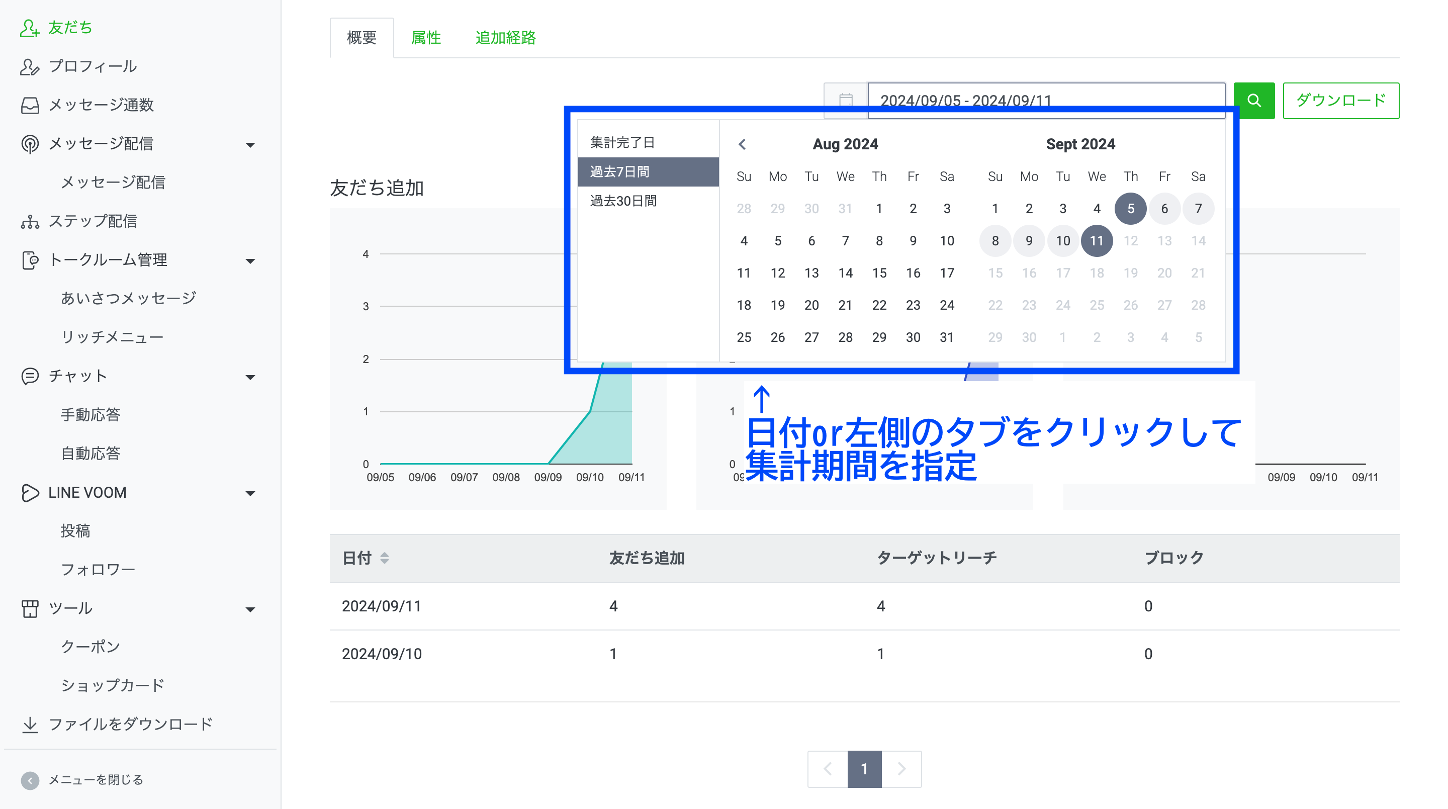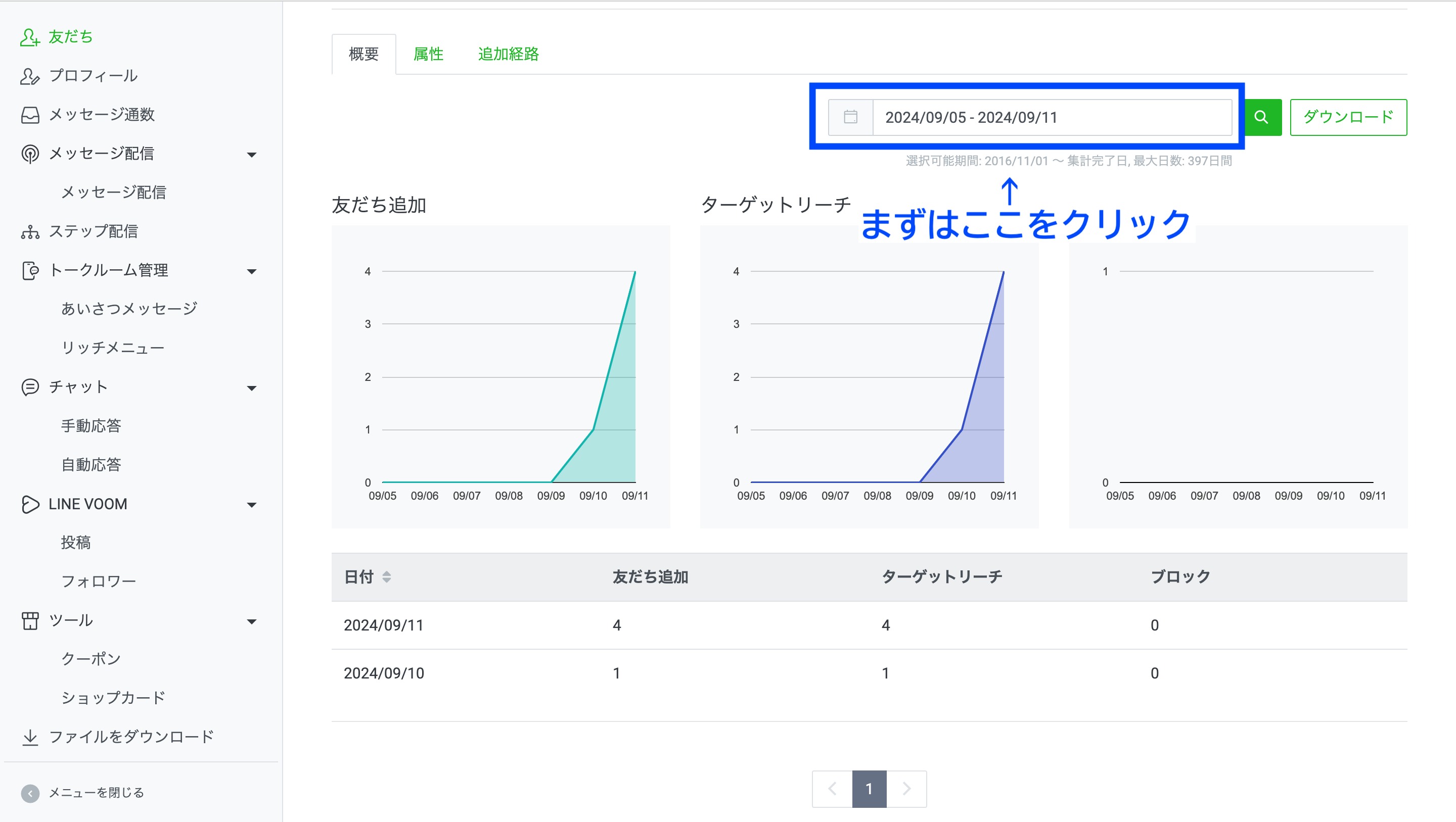 友だちの分析画面下部では、指定した集計期間における友だち周りのデータが確認できます。その方法としてはまず、下図のとおり日付の欄をクリックします。