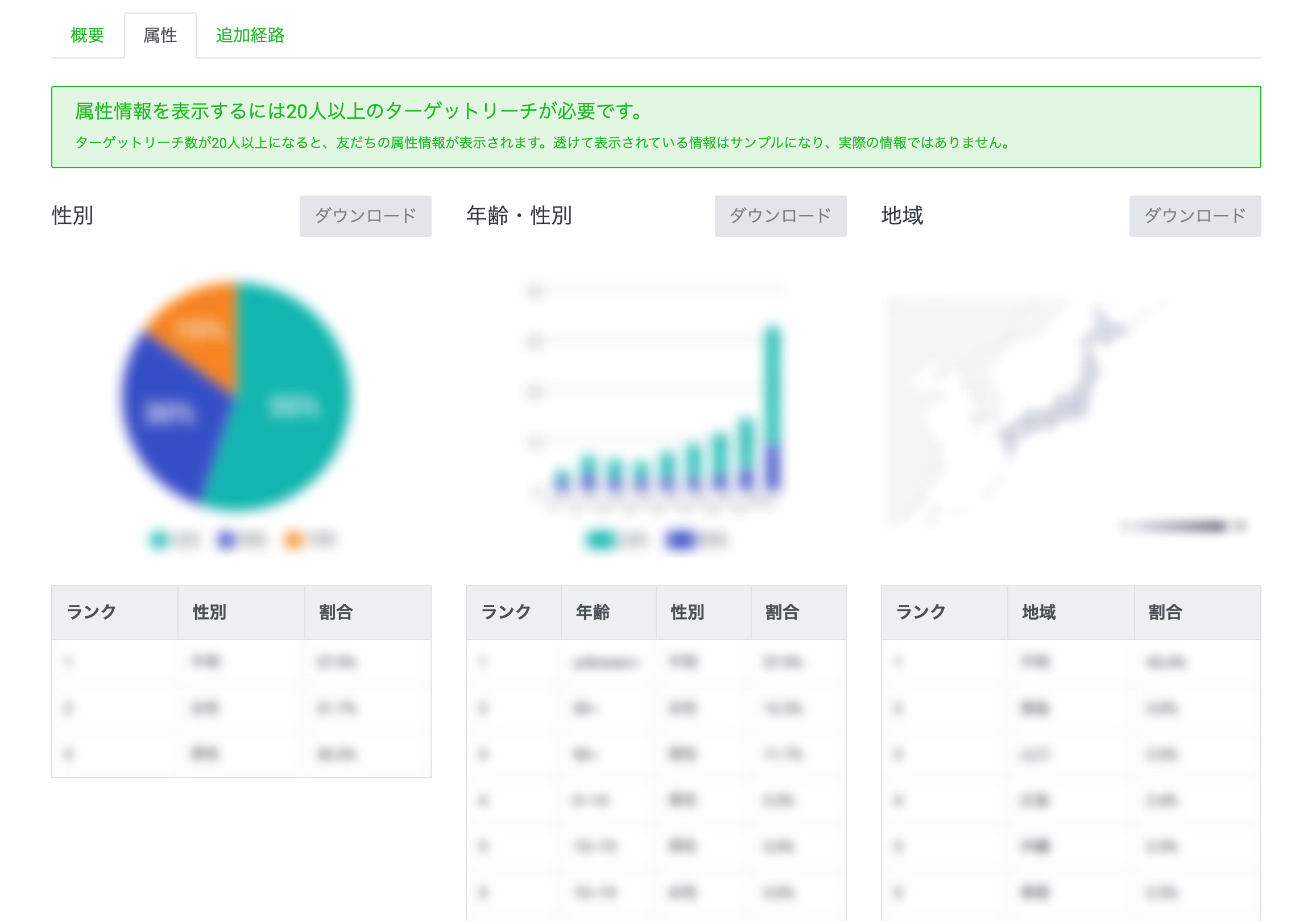 LINE公式アカウントの友だち分析では、画面下部の「属性」タブをクリックすることで、属性別のターゲットリーチも閲覧可能です。性別ごと / 年齢・性別ごと / 地域ごとで、ターゲットリーチに占める割合が確認できます。