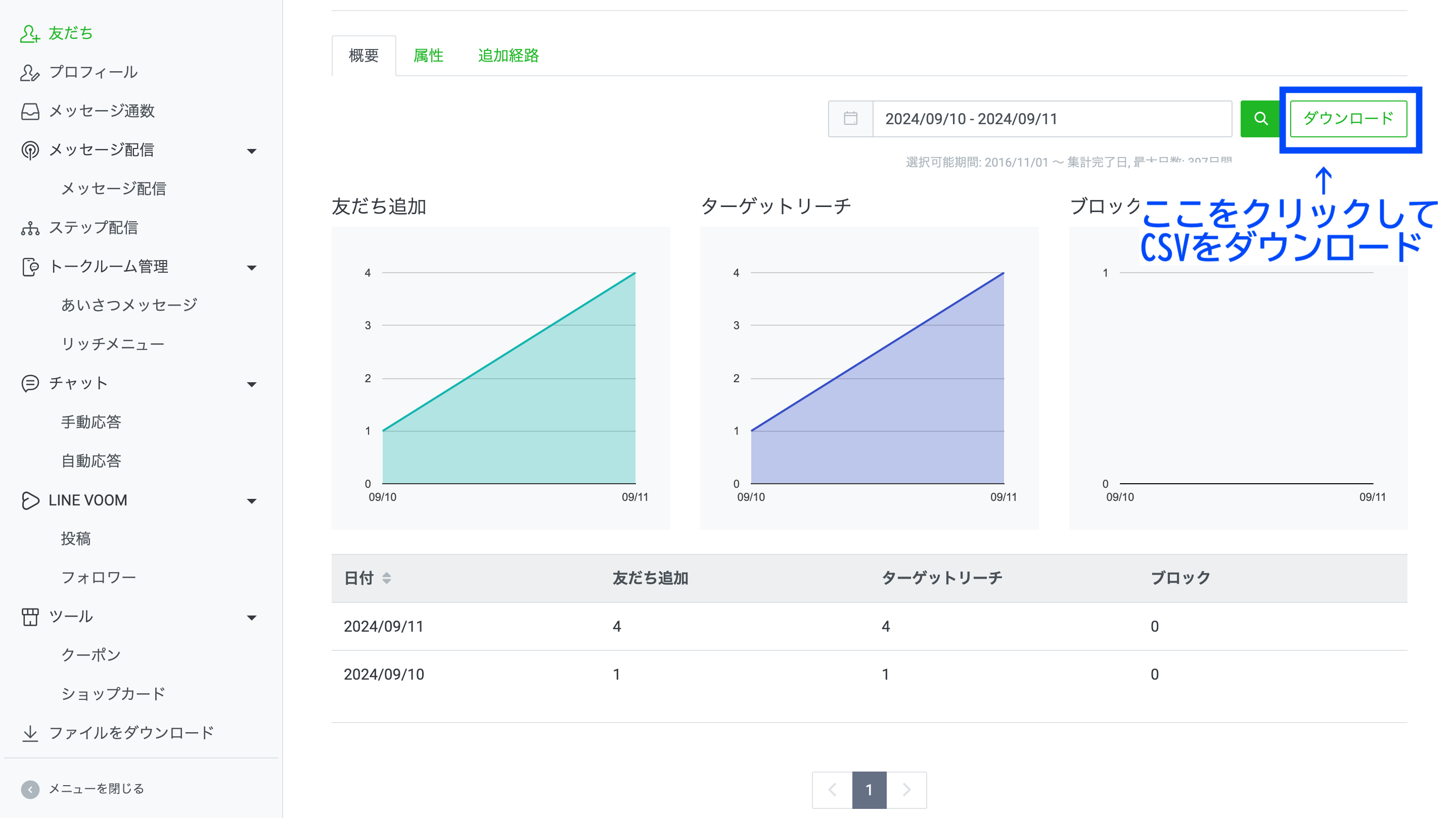 続いて画面下部「概要」欄では、指定した集計期間中での友だち追加件数の推移が日ごとで確認可能です。施策の実施状況と照らし合わせて、本格的な振り返りができます。