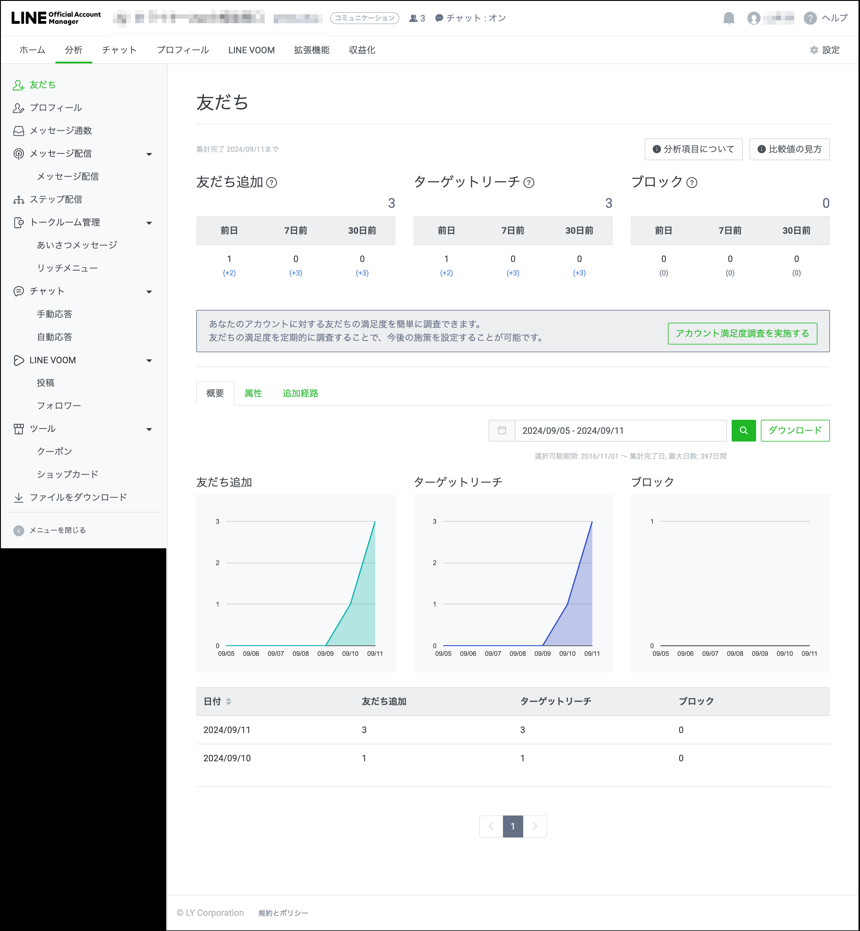 PC版管理画面(LINE Official Account Manager)からは、下記の友だち周りのデータが閲覧可。総数のほか、日ごとの推移まで確認できました。