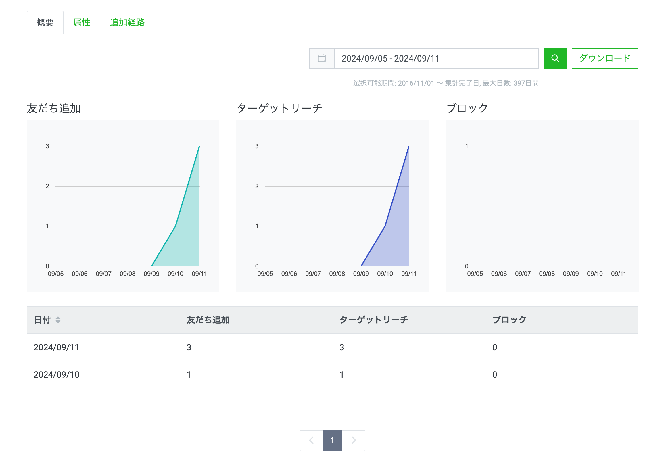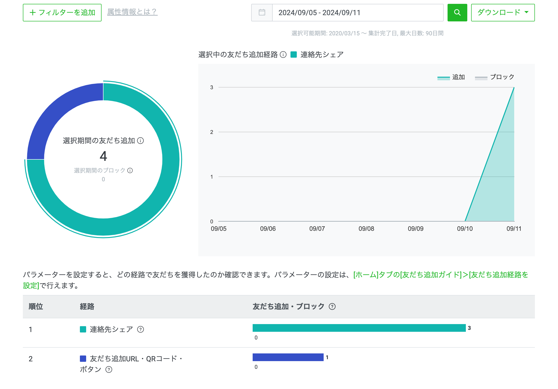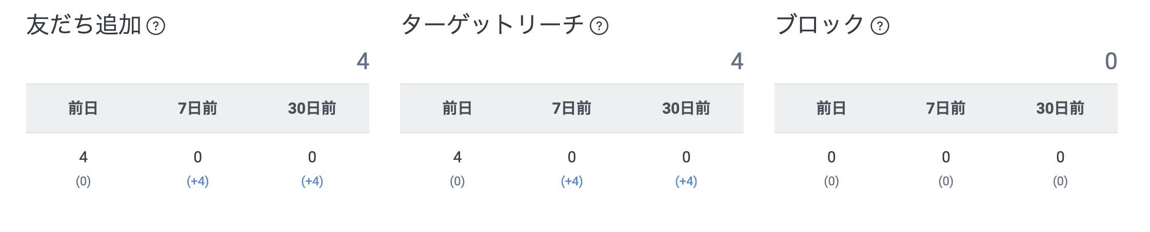 まず、画面上部に表示されているのは、前日・7日前・30日前の各時点での累計値。こちらでは、友だち追加の状況が大まかに振り返れます。