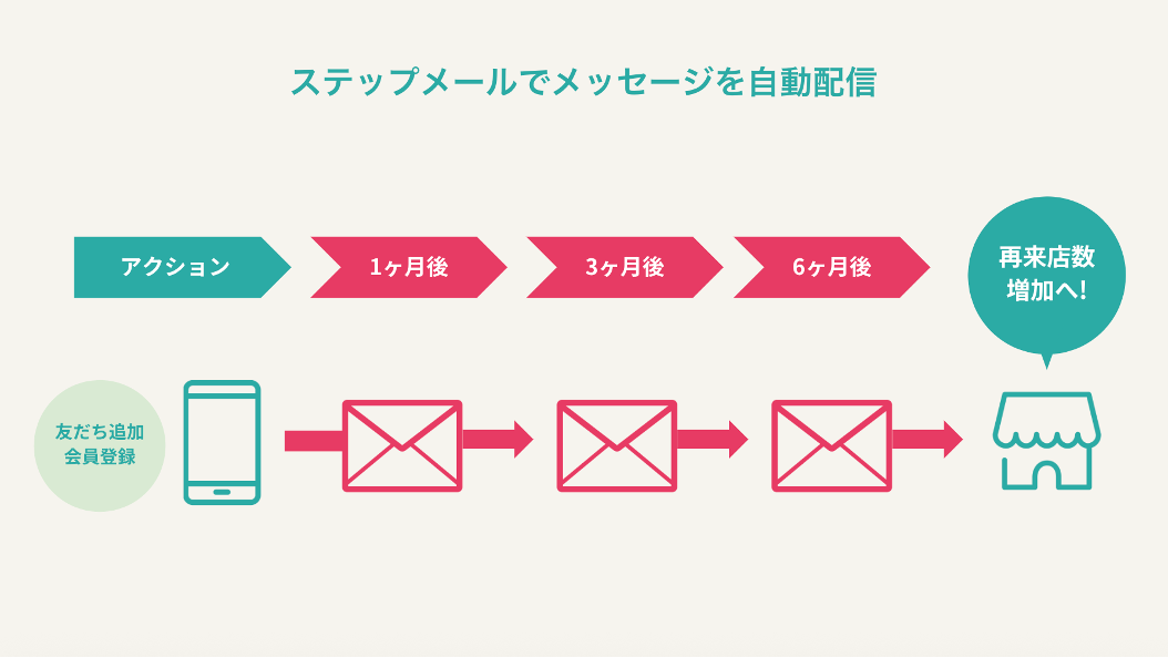岡部様:それに加えて、私が導入担当として特に重視した点は、自動でメッセージを送れるステップメール配信機能ですね。友だち追加後や、会員登録後の1ヶ月、3ヶ月、6ヶ月といったタイミングで、後追いのメッセージを自動で送れる仕組みは、最も重視していた点です。