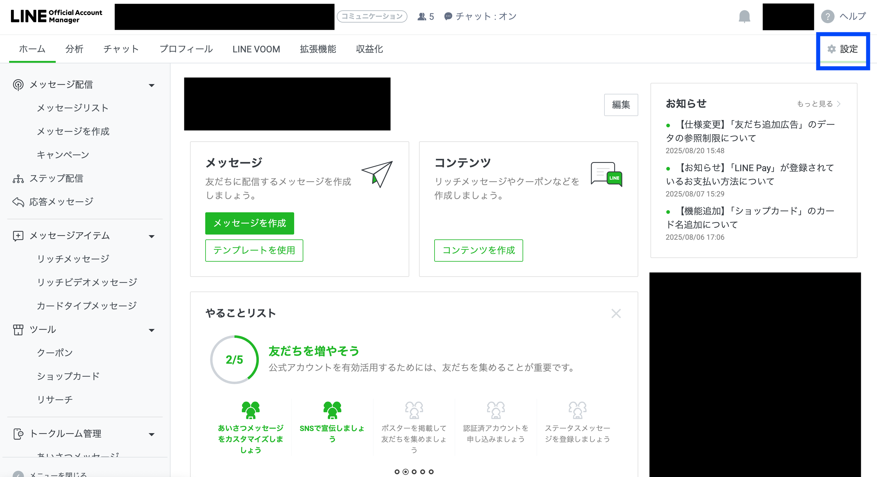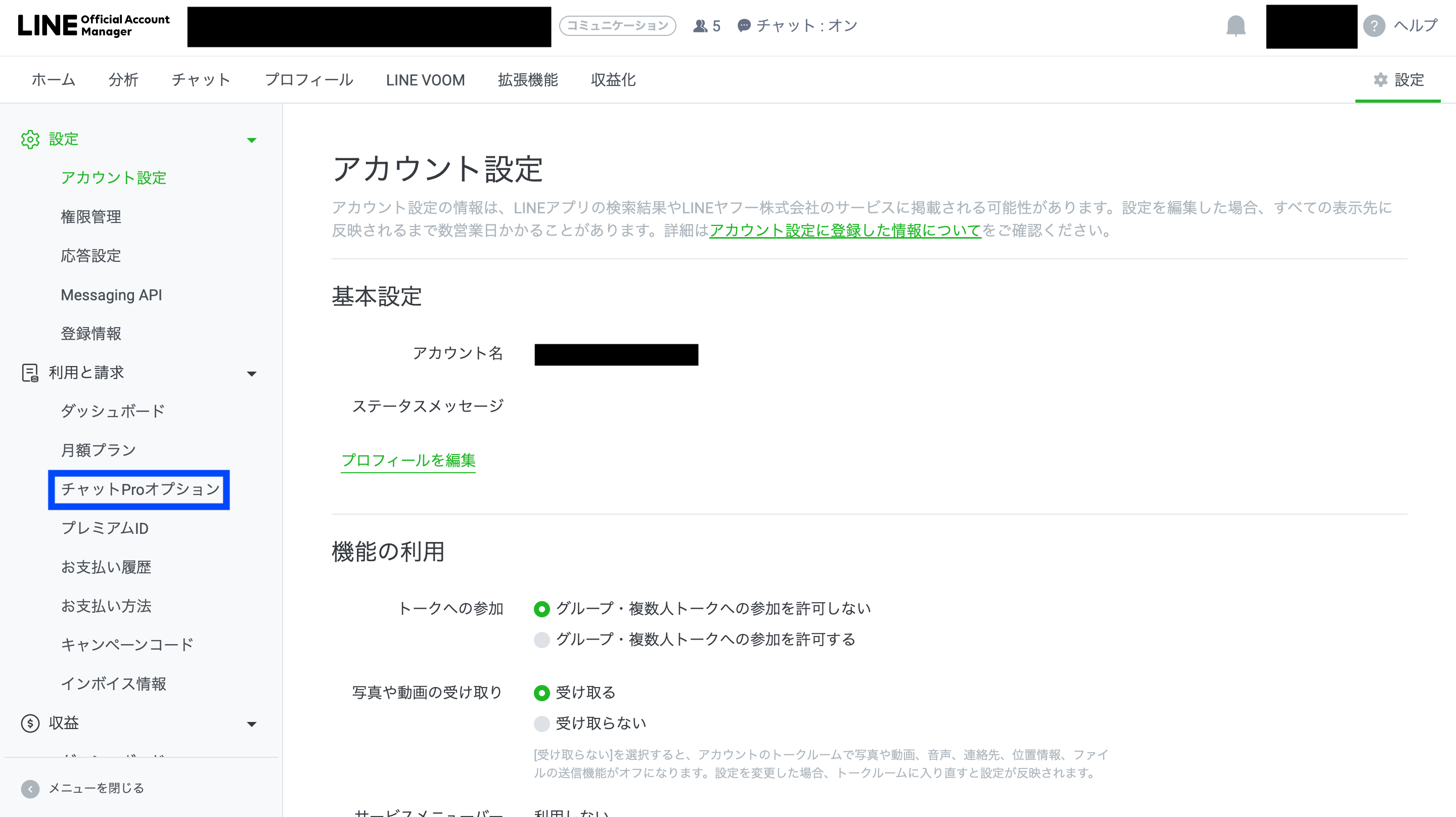 チャットProオプションへの加入は、LINE公式アカウントのブラウザ版管理画面(LINE Official Account Manager)から可能です。その方法としてはまず、チャットProオプションに加入したいLINE公式アカウントのトップ画面から「設定」をクリックします。(下図)