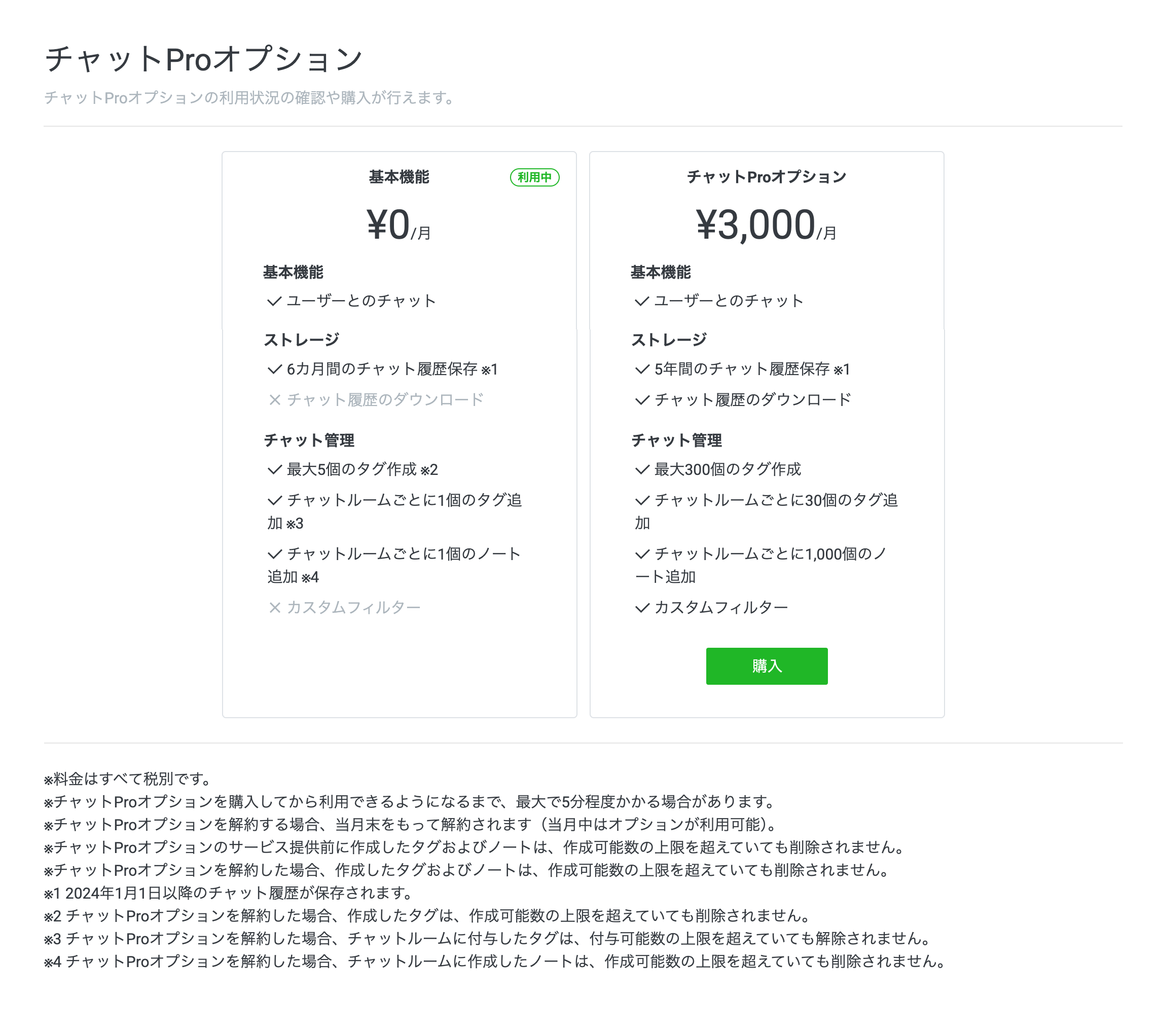 サイドバークリック後は、下記画面の「購入」からチャットProオプションの購入画面に移動が可能です。