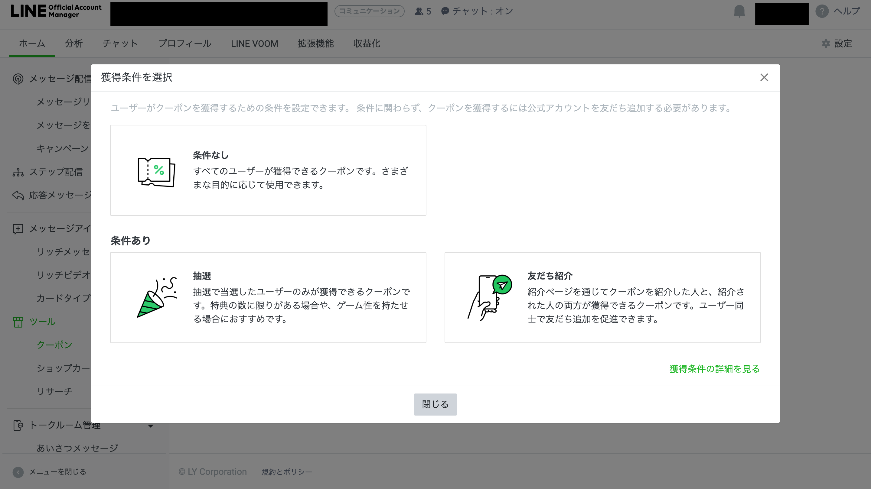 クリック後は以下のポップアップから、クーポンの獲得条件について「条件なし / 抽選 / 友だち紹介」の3種が選べます。