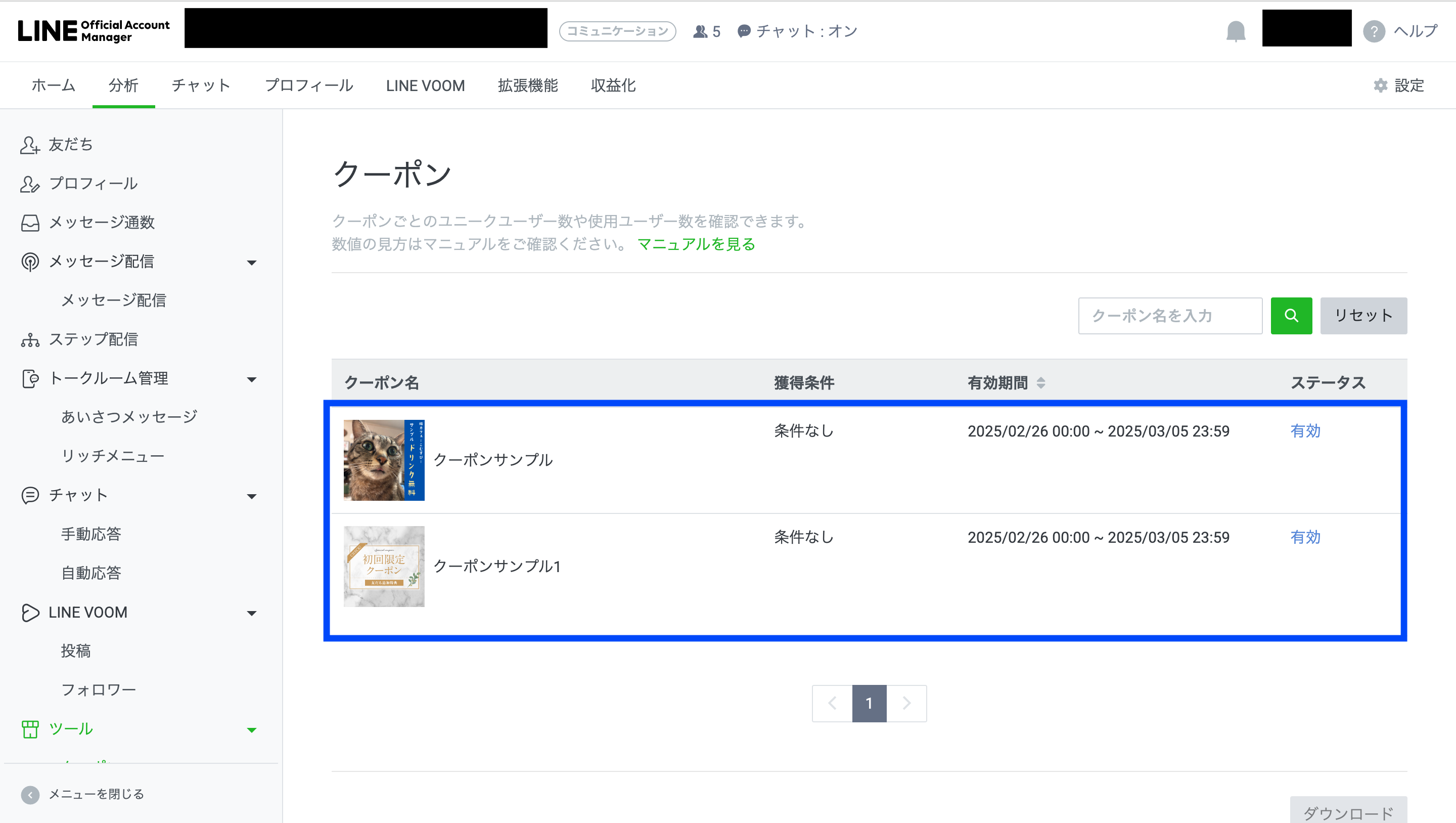 LINE公式の管理画面(LINE Official Account Manager)トップでは、画面左側サイドバーから「クーポン」という項目が選択可能です。まずはこちらをクリックします。
