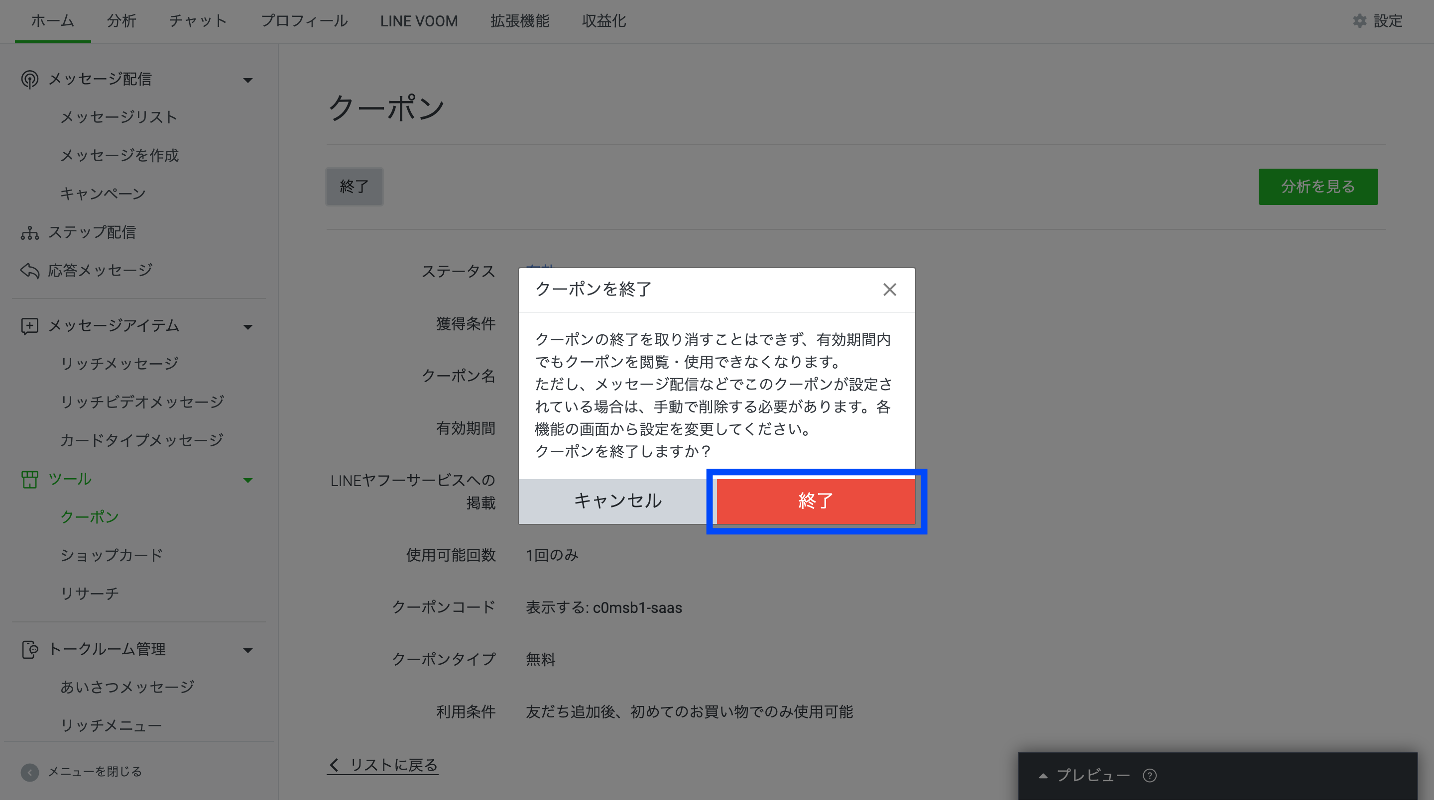 クーポンのクリック後は、詳細画面から「終了」をクリックして、クーポンの削除が可能です。