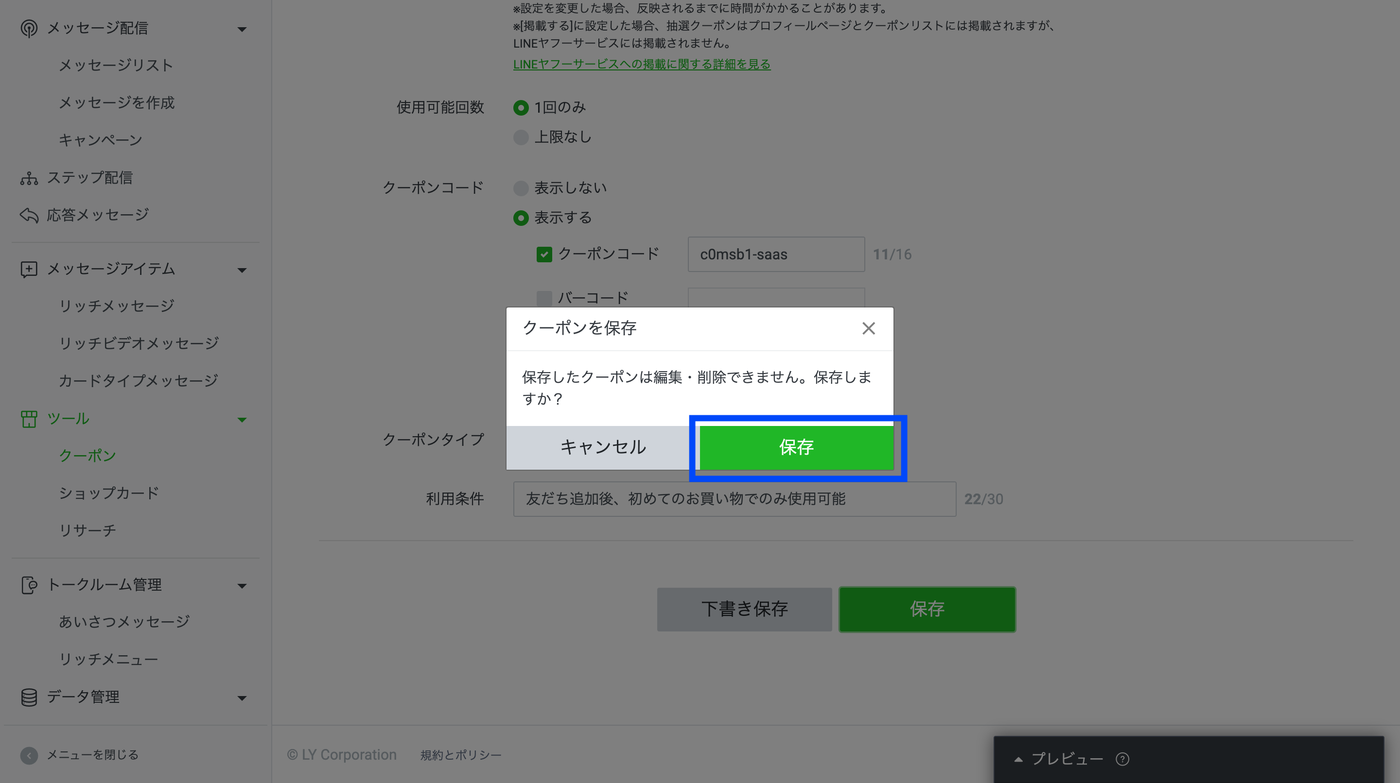 クーポンの設定を終えたら「保存」をクリックして、以下のポップアップ画面についても「保存」を選択します。