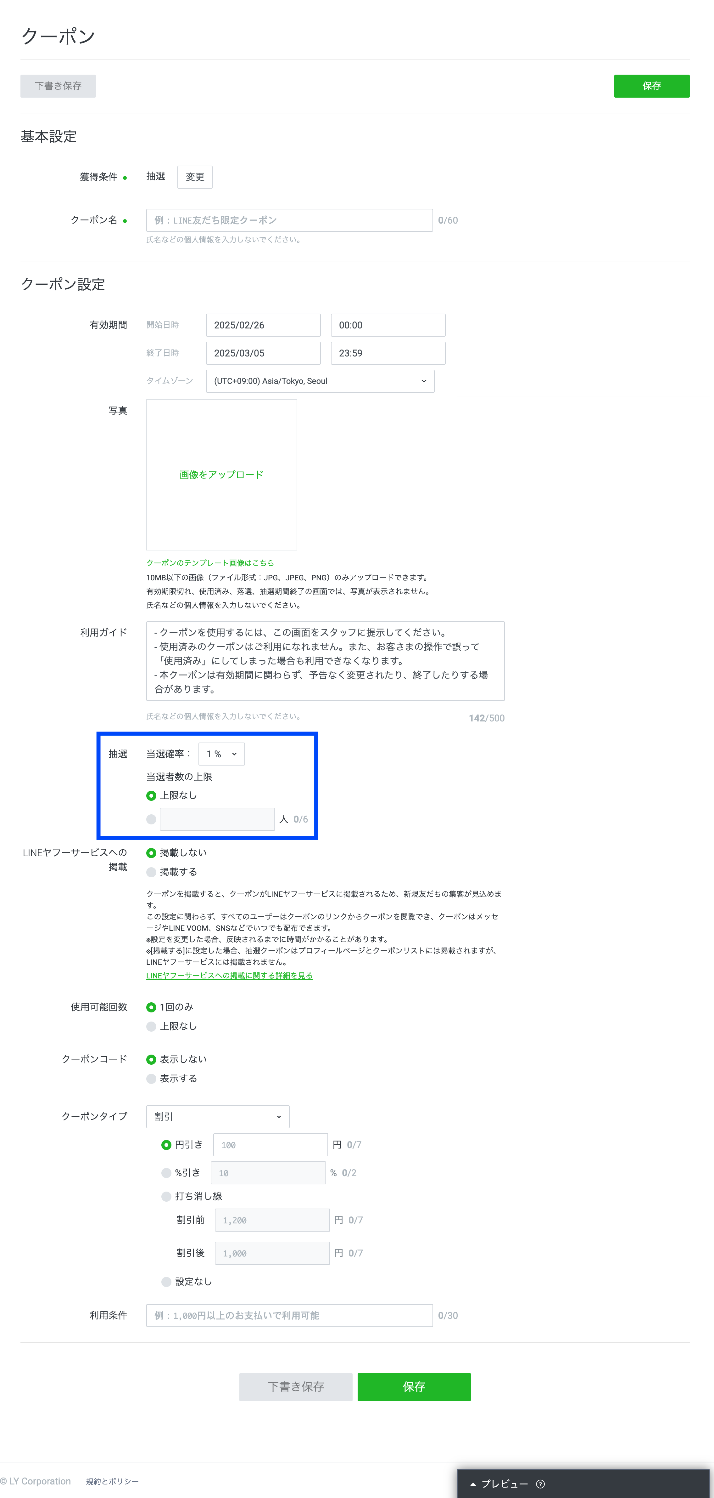 抽選クーポンの作成画面は、条件なしのクーポンのものに加え、特選確率と当選者数の上限が設定できる「抽選」欄が設置されています。