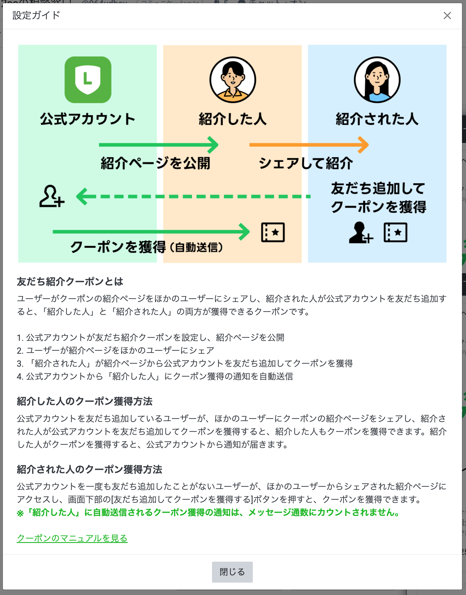 - 紹介された側が友だち追加をした場合、紹介した側と紹介された側の両方にクーポンが発生