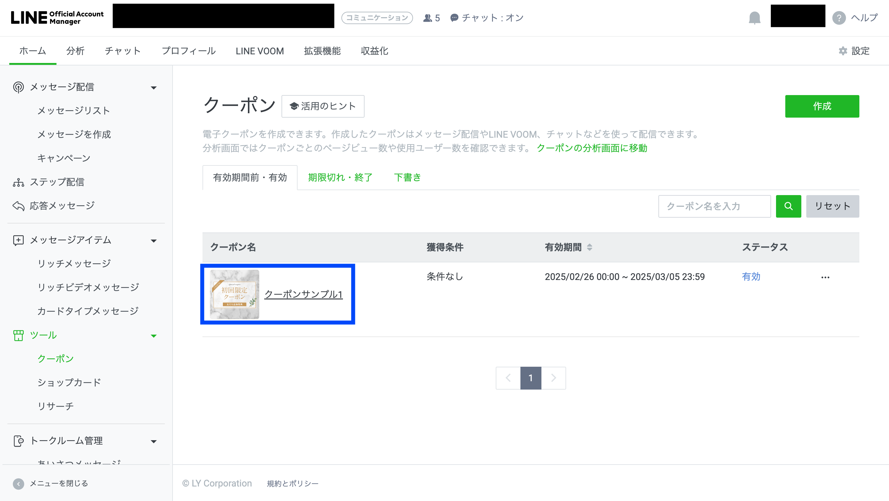 保存後は、クーポンのトップ画面に完成したクーポンが表示されます。なお、2枚目以降のクーポンは以下の画面右上にある「作成」ボタンから新規作成が可能です。