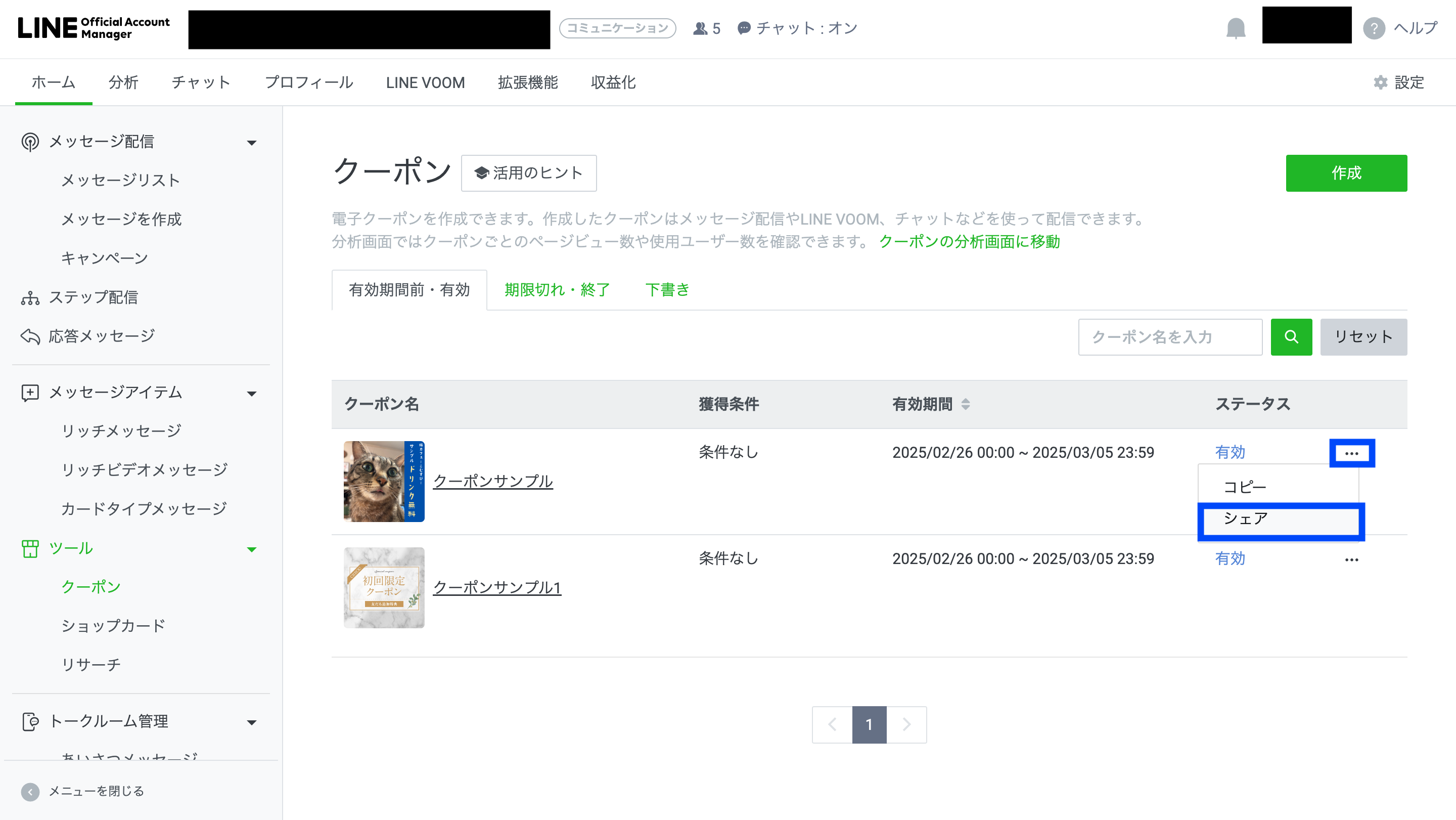 クーポンURLの発行は、クーポンのトップ画面から可能です。任意のクーポンについて右横の「・・・」をクリックし、「シェア」を選択します。