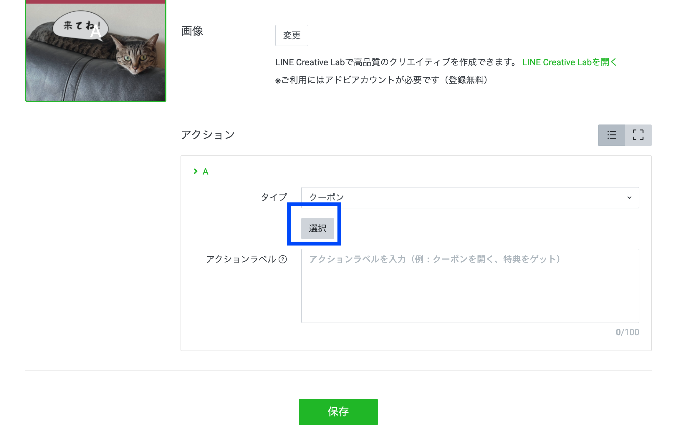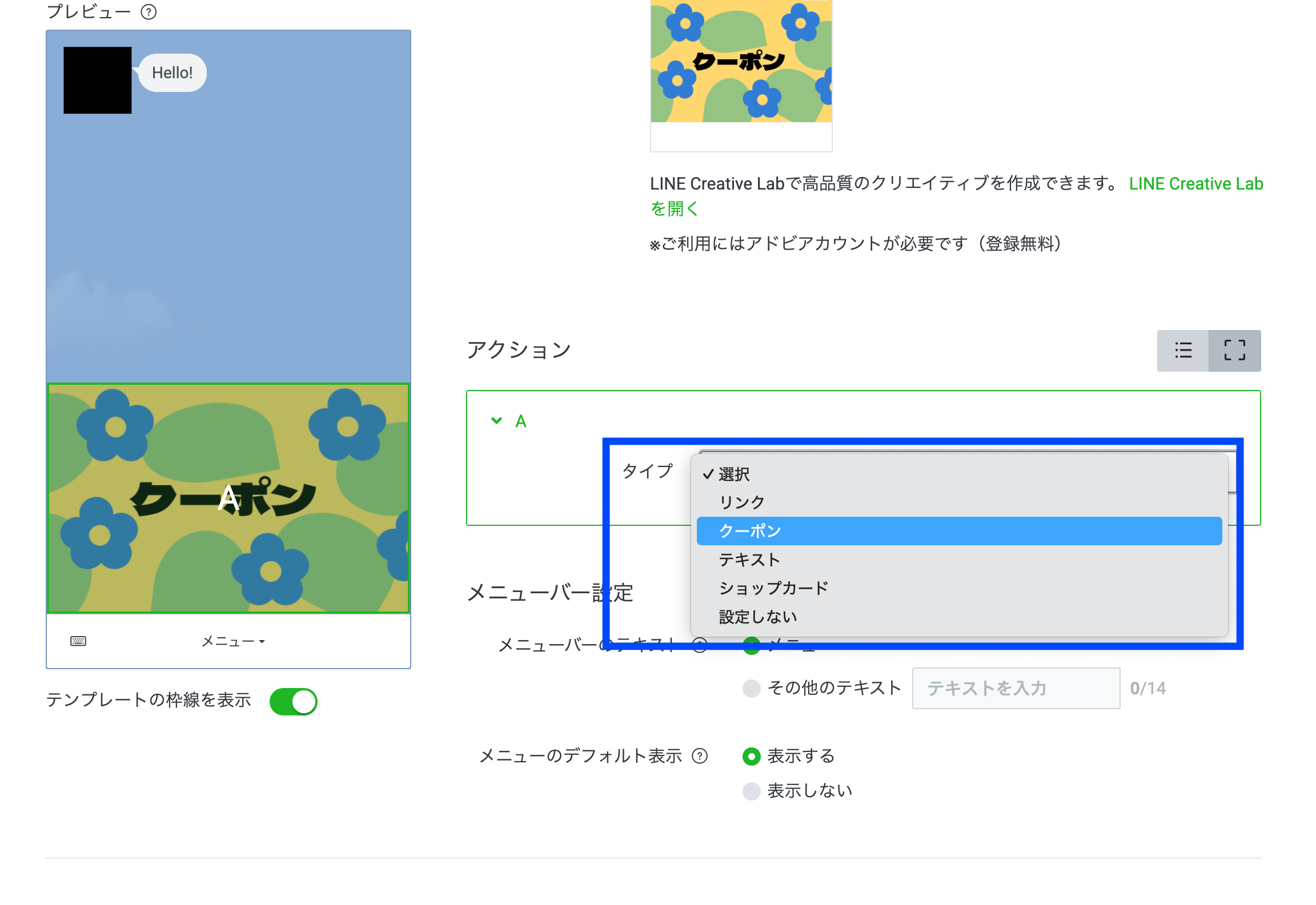 リッチメニューへのクーポンの設定方法は、リッチメッセージやカードタイプメッセージのものと同様。作成画面「アクション」のタイプ欄からクーポンを選択して、アクションラベルも設定します。