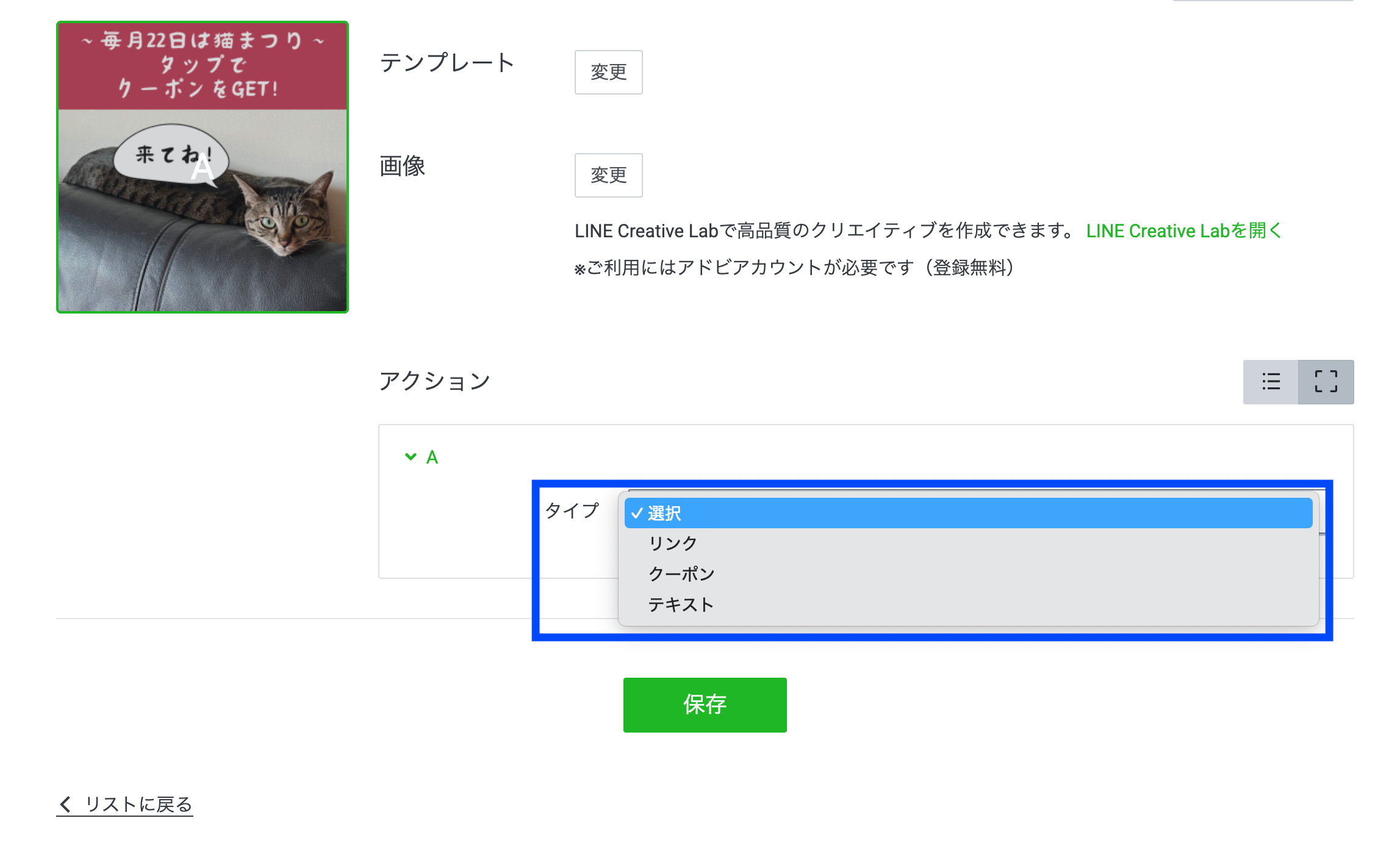 リッチメッセージならびにカードタイプメッセージについては、作成画面の「アクション」項目からクーポンが設定可能です。方法としてはまず、「タイプ」欄からクーポンを選びます。
