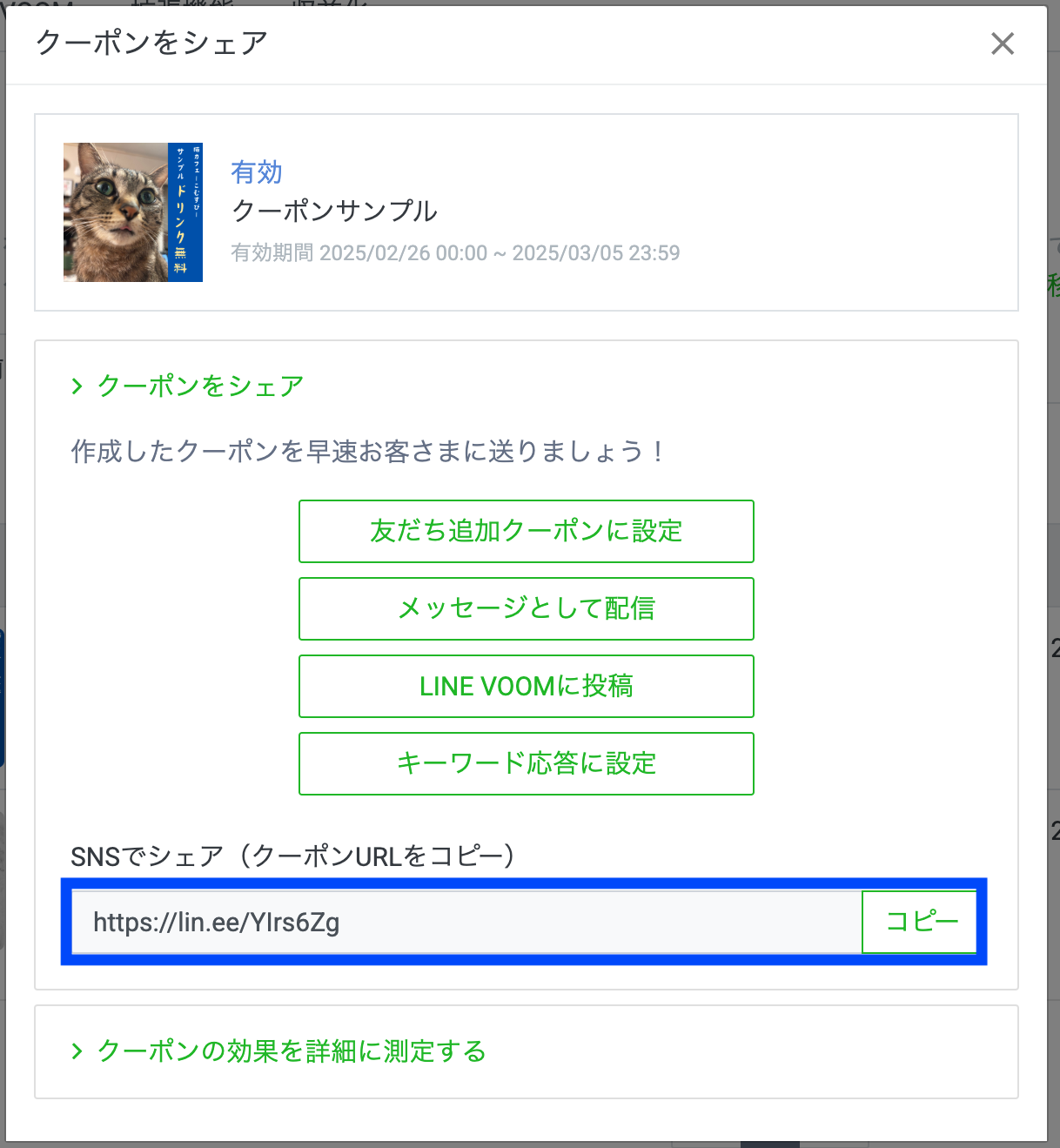 ポップアップが現れると、「SNSでシェア」欄からクーポンURLがコピーできます。