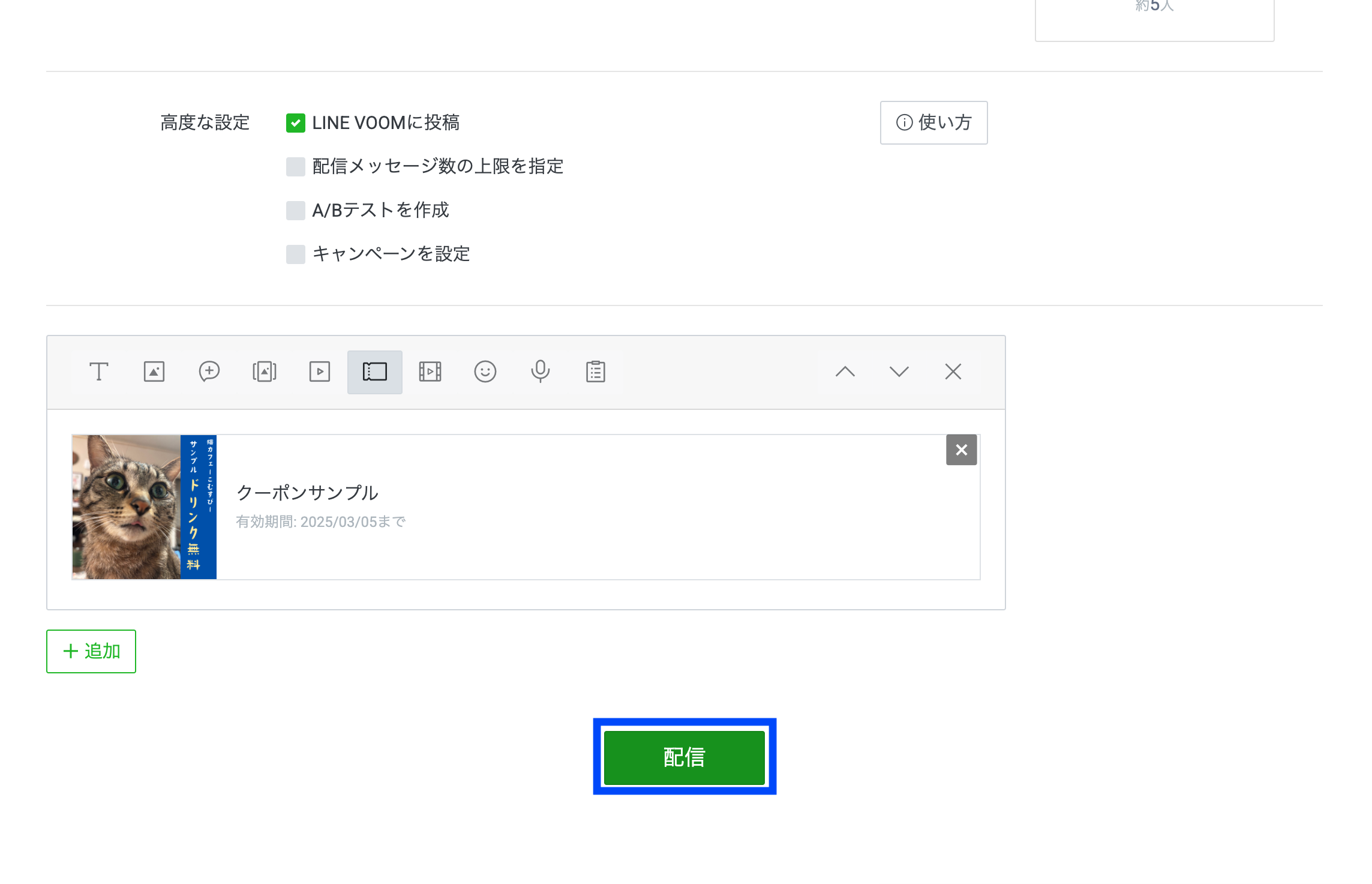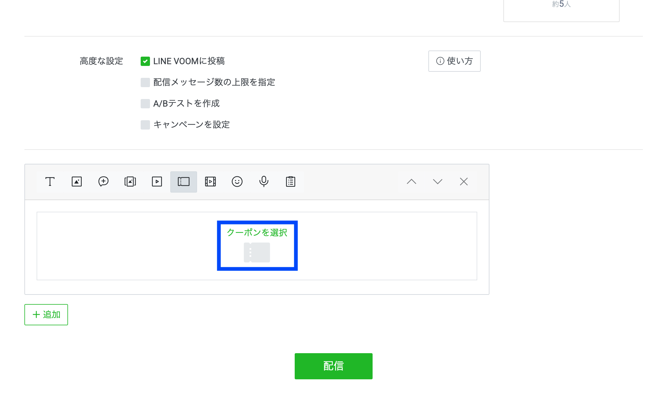 作成したクーポン付きのリッチメッセージ / カードタイプメッセージは、通常のメッセージ配信・絞り込み配信・あいさつメッセージ・応答メッセージの吹き出しに設定が可能です。