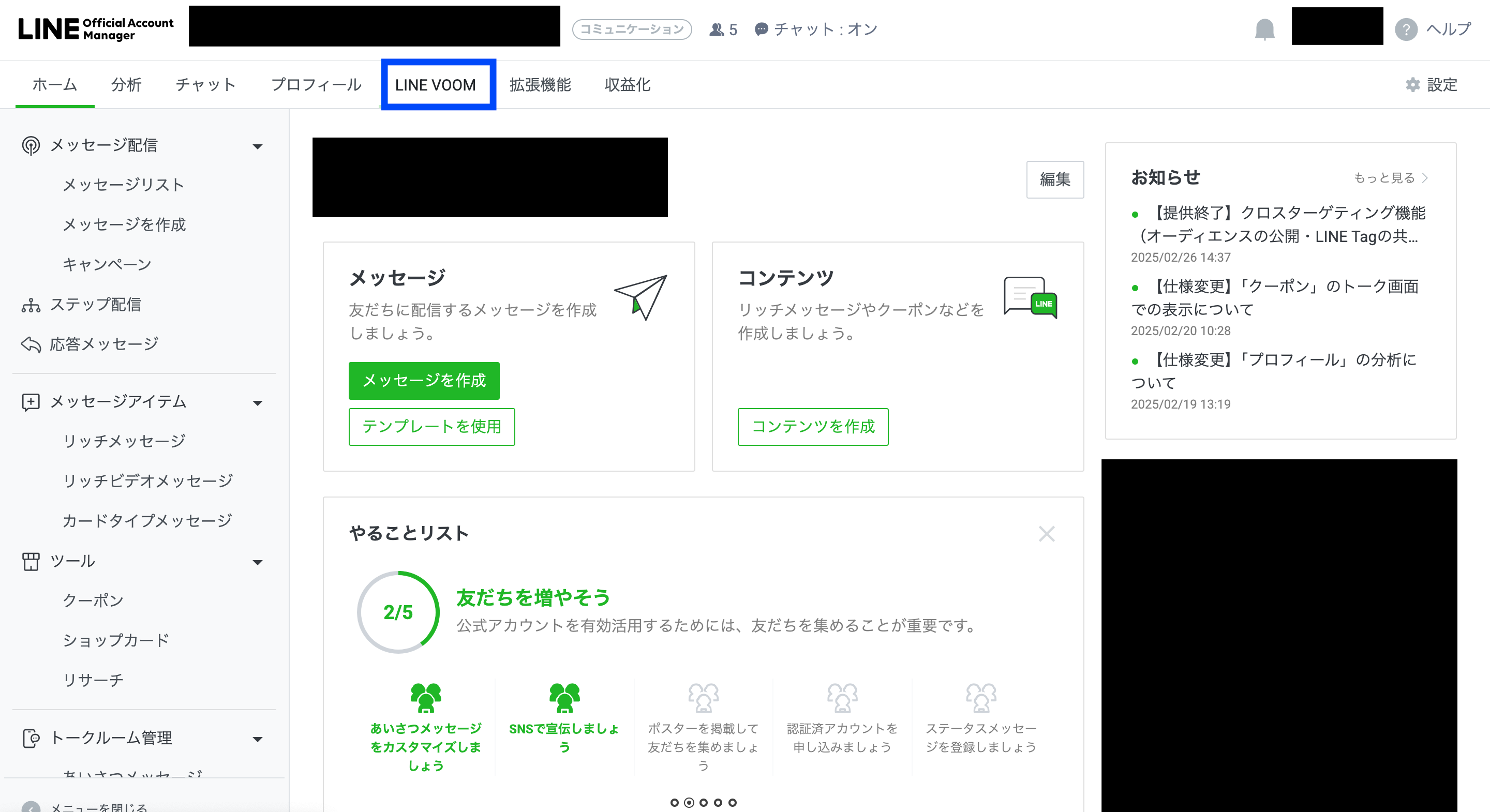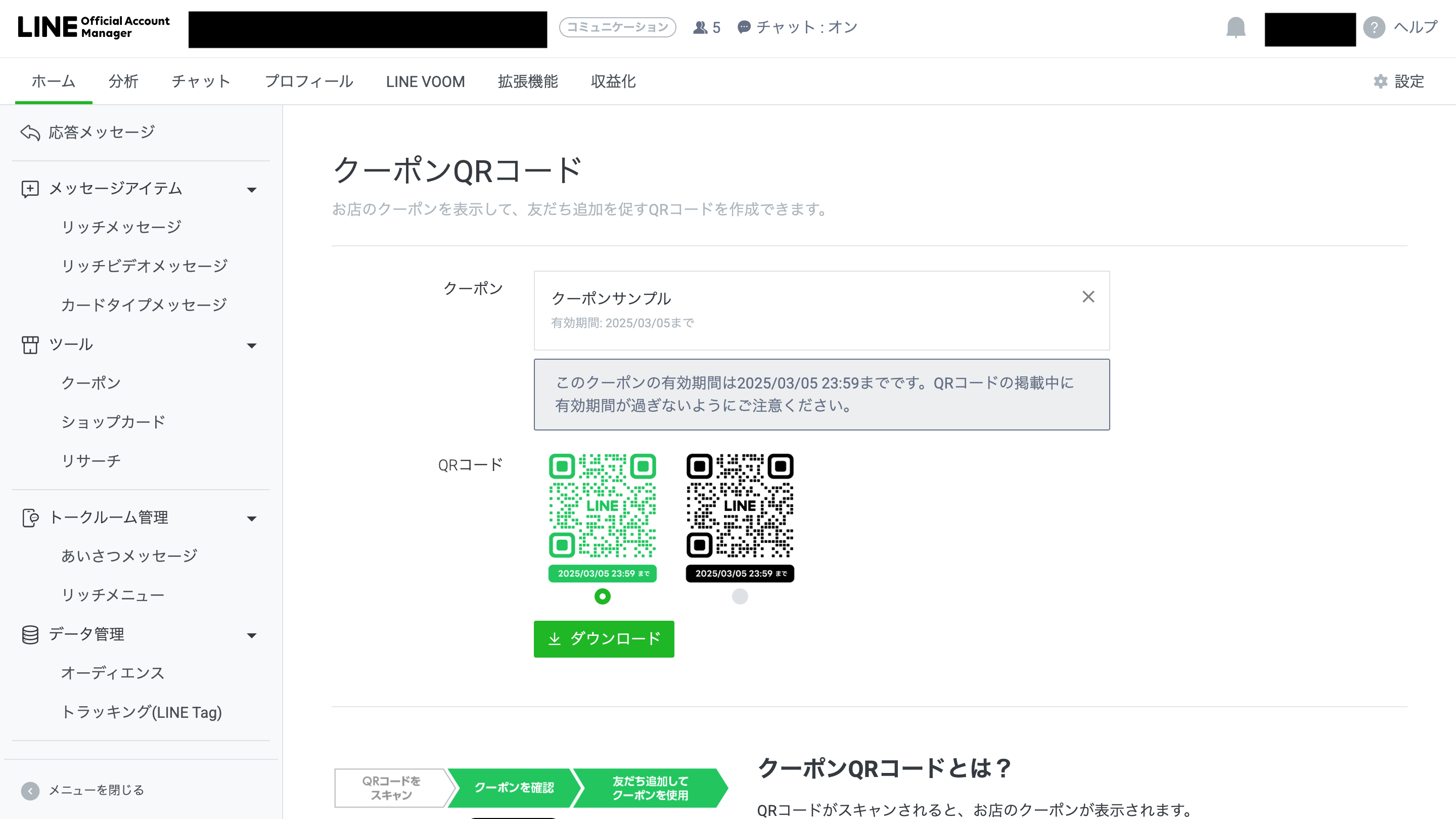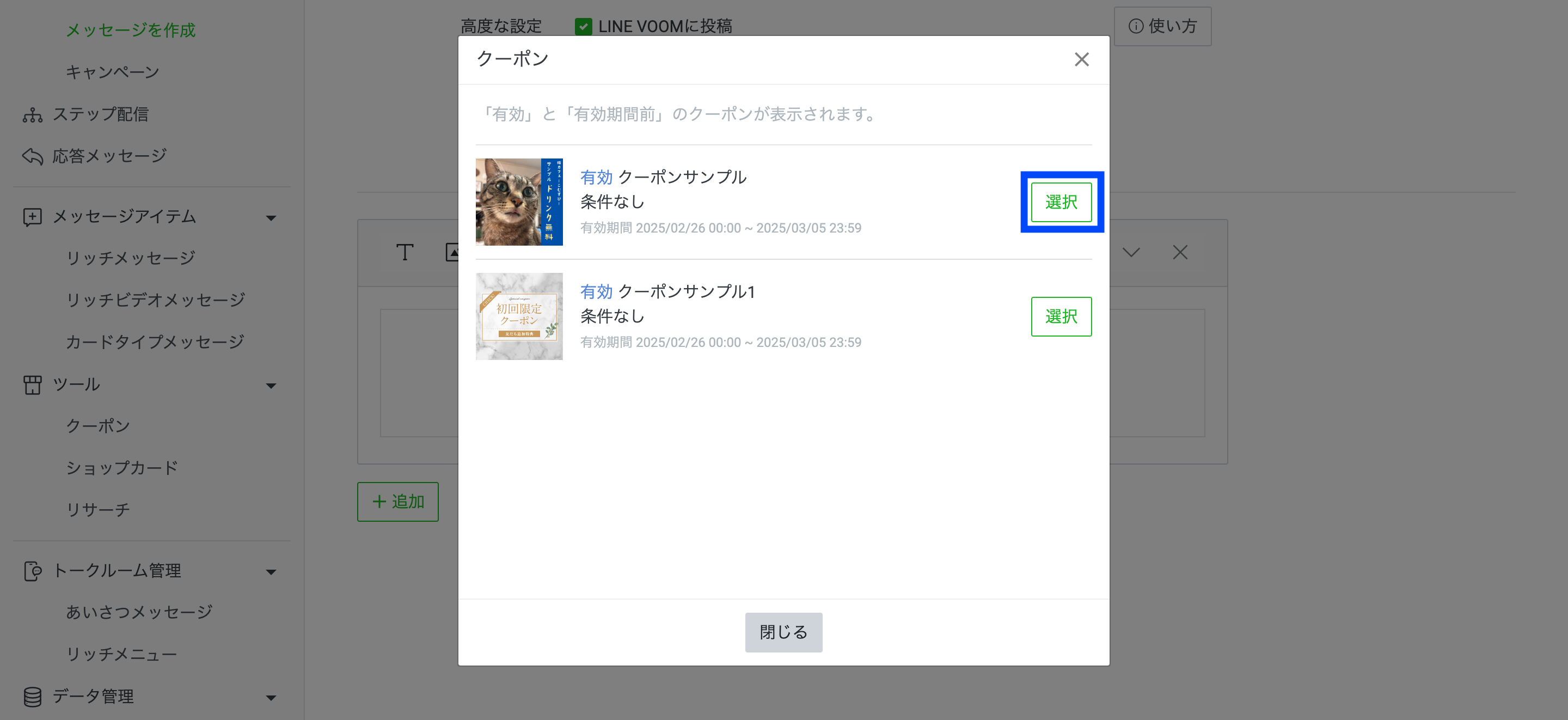 こちらのLINE VOOMでクーポンを配るにはまず、管理画面上部の「LINE VOOM」をクリックします。