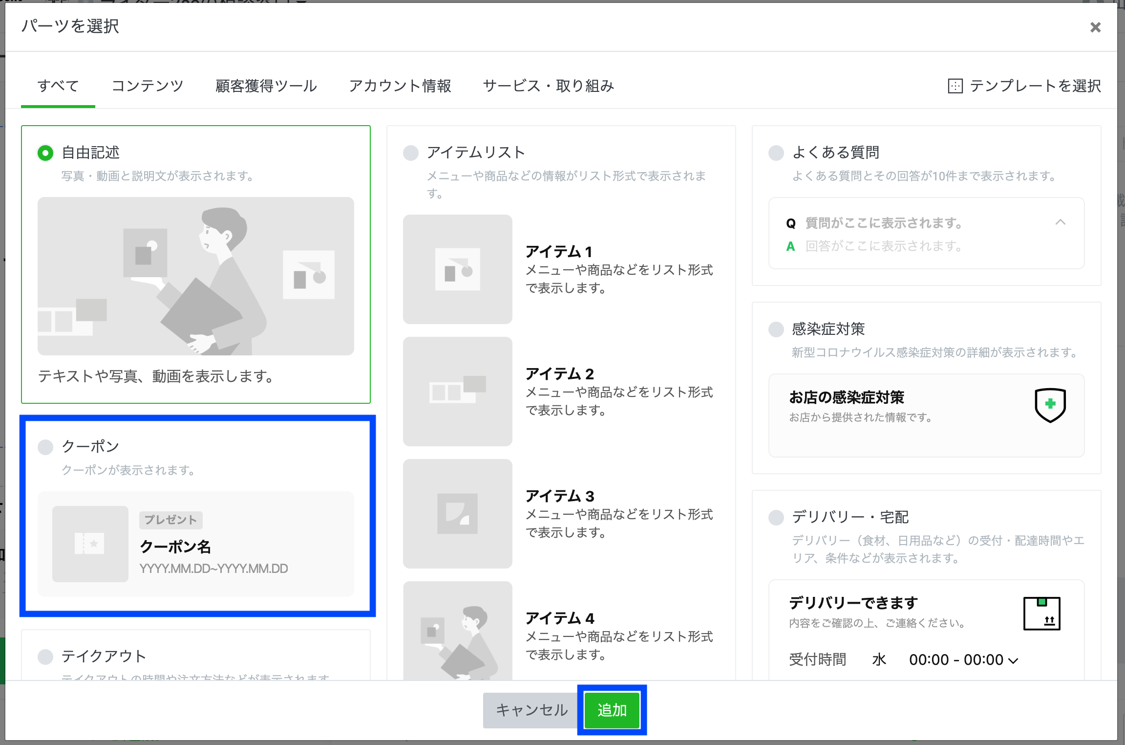 以下のポップアップ画面から、クーポンを追加してプロフィールに掲載できます。