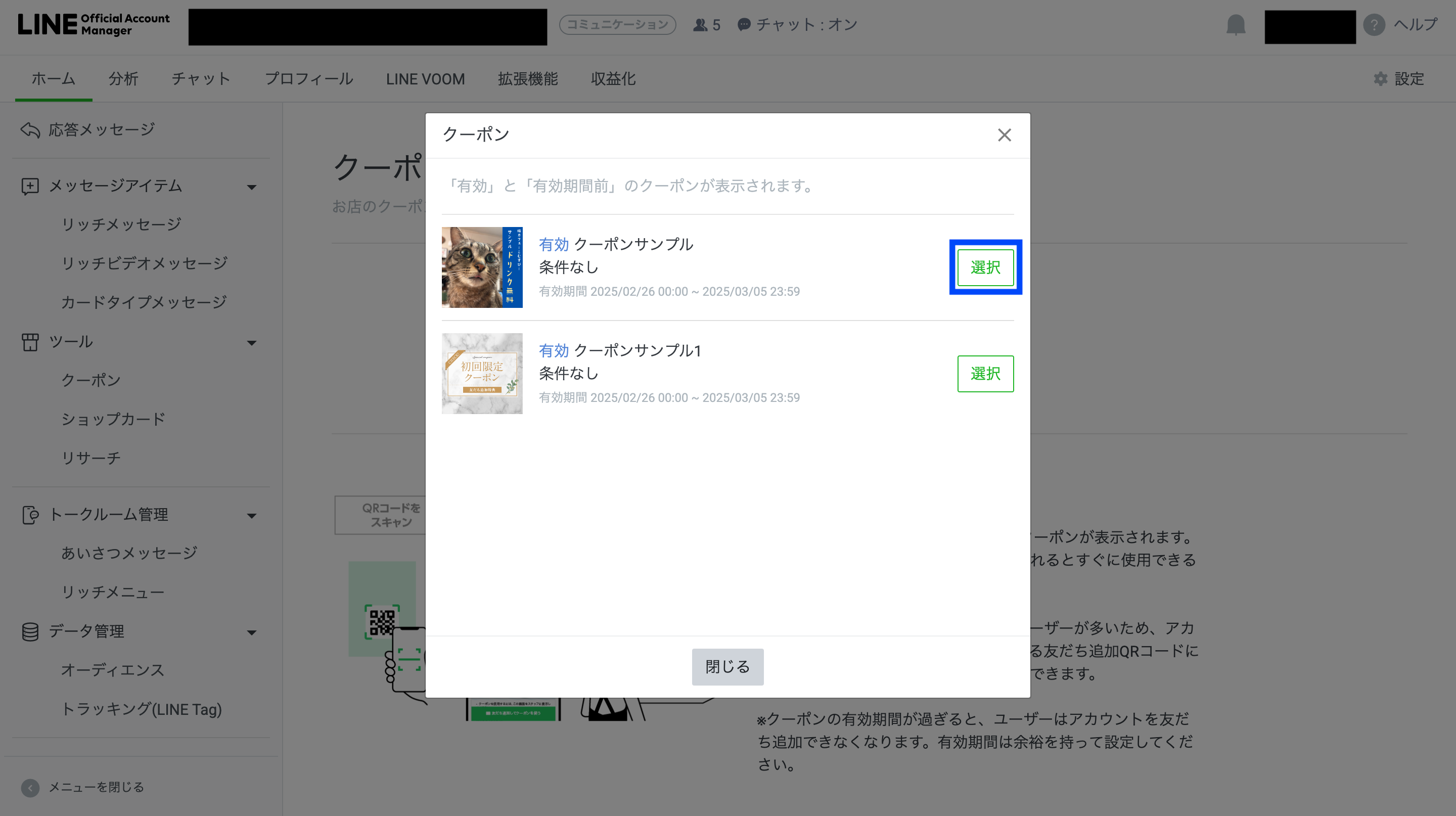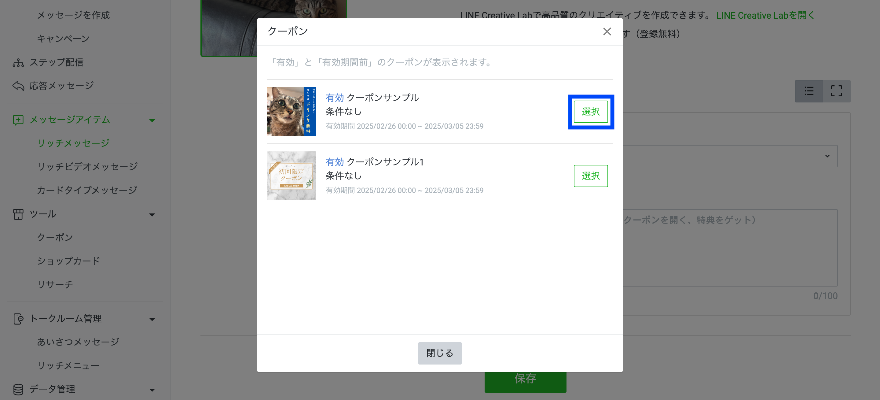 吹き出し設定欄を切り替えたあと、「クーポンを選択」をクリックしてください。