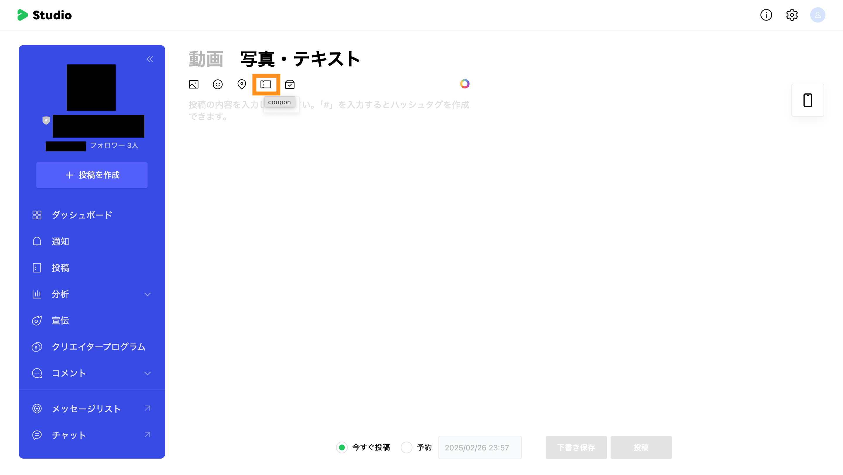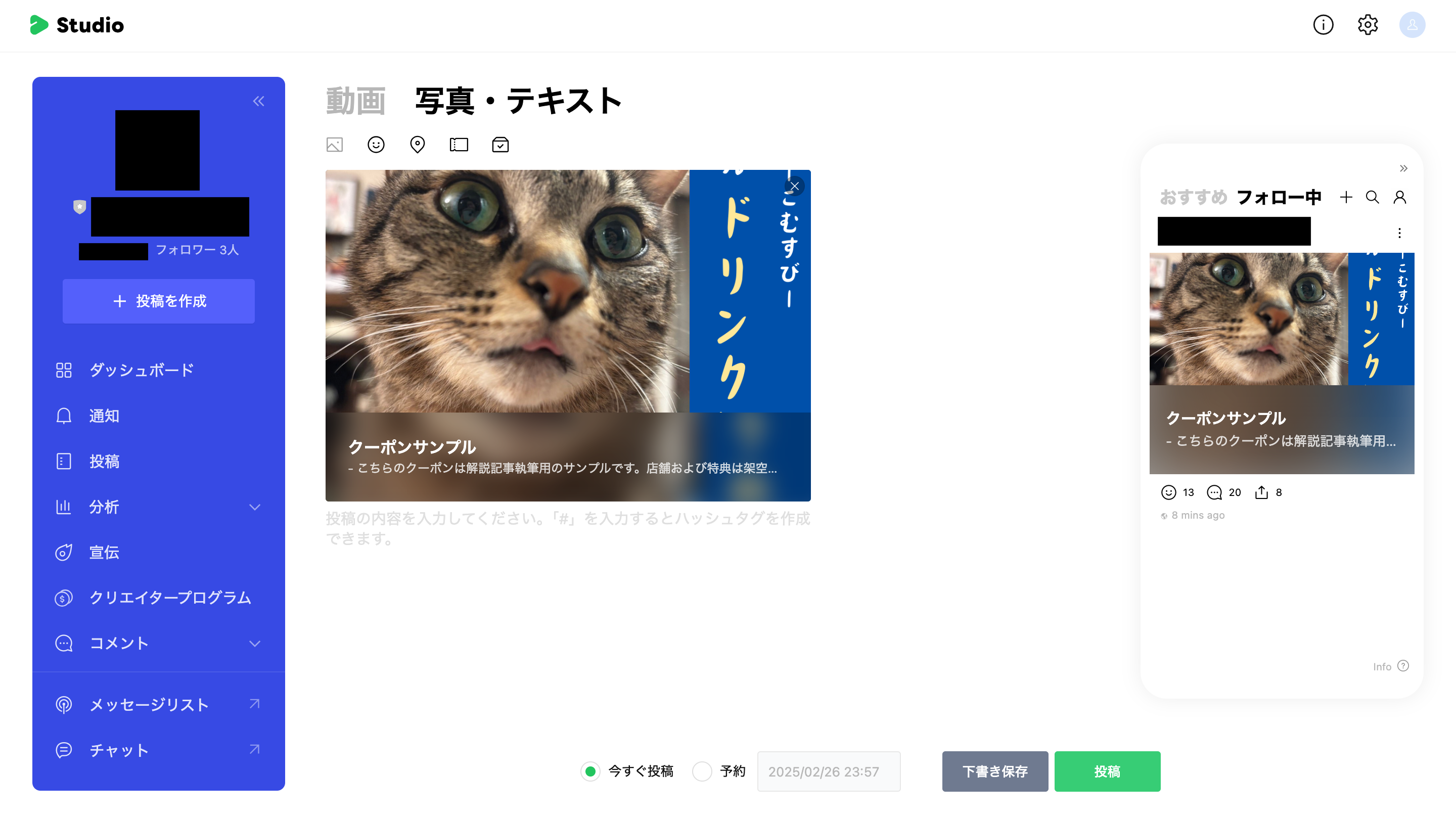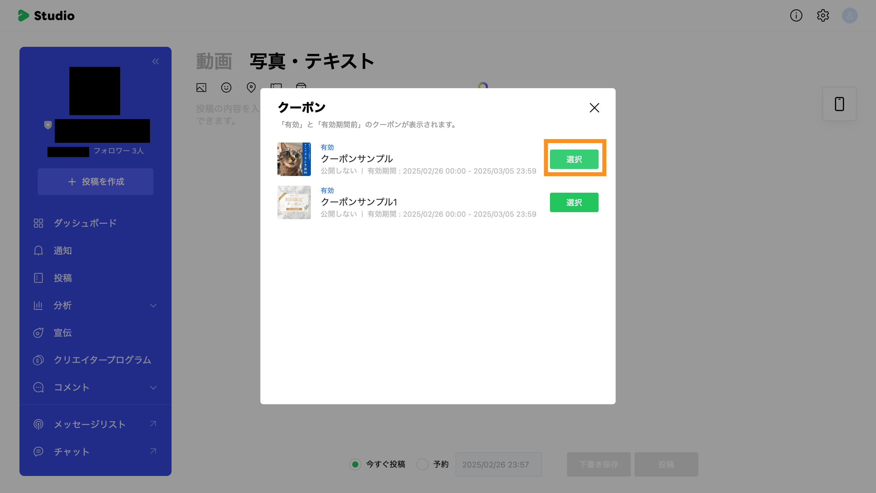 クーポンの選択後は、「下書き保存」や「投稿(今すぐ / 予約)」が行えます。