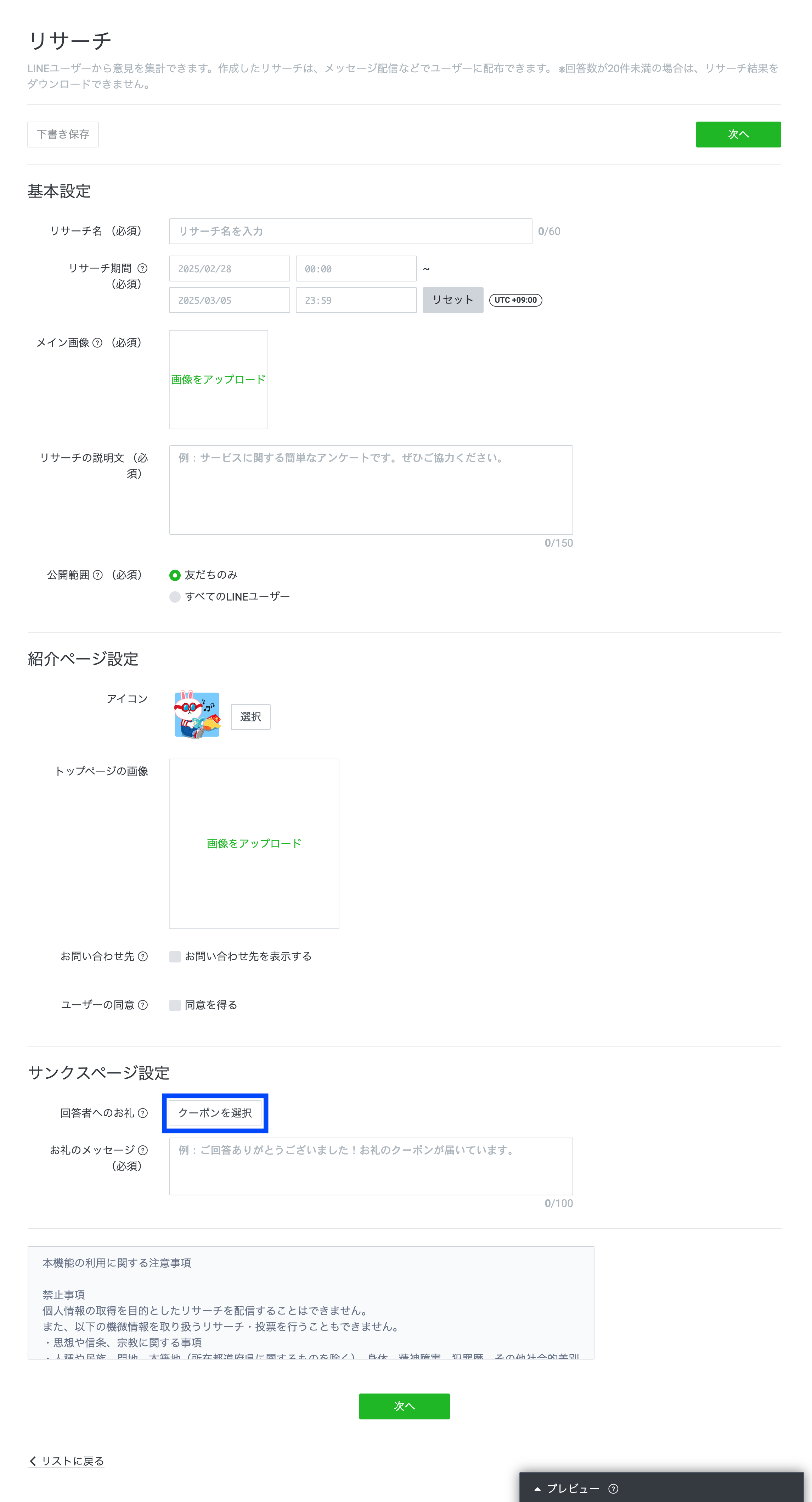 LINE公式から友だちにアンケートを実施できる「リサーチ」機能では、回答のインセンティブ(報酬)としてクーポンが配布できます。リサーチへのクーポンの設定は、リサーチ作成画面の項目「回答者へのお礼」から可能です。