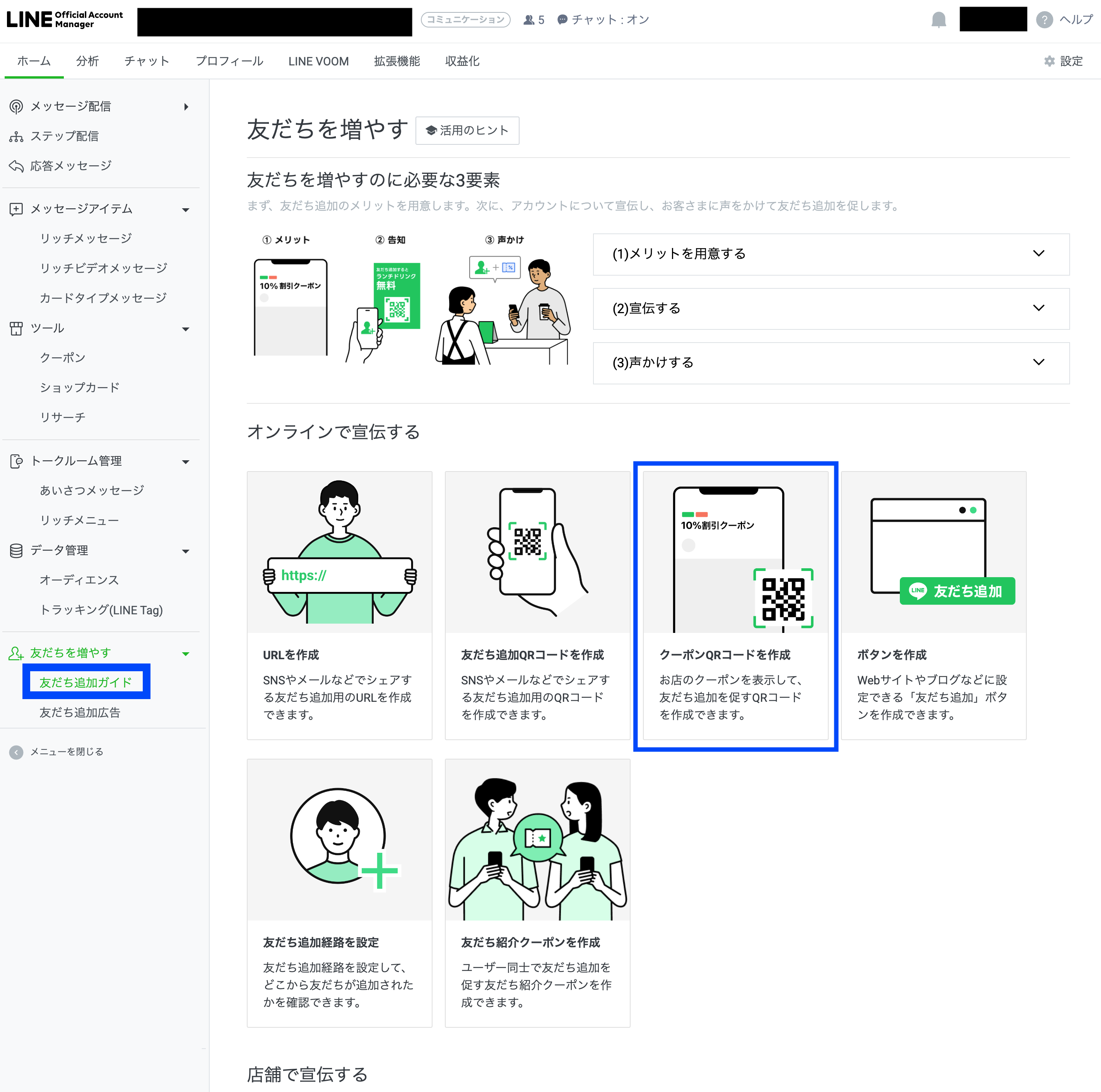 クーポン配布用のQRコードを発行するにあたってはまず、管理画面左側サイドバーの下方にある「友だち追加ガイド」をクリックします。そして次に、遷移先の画面から「クーポンQRコードを作成」を選択してください。