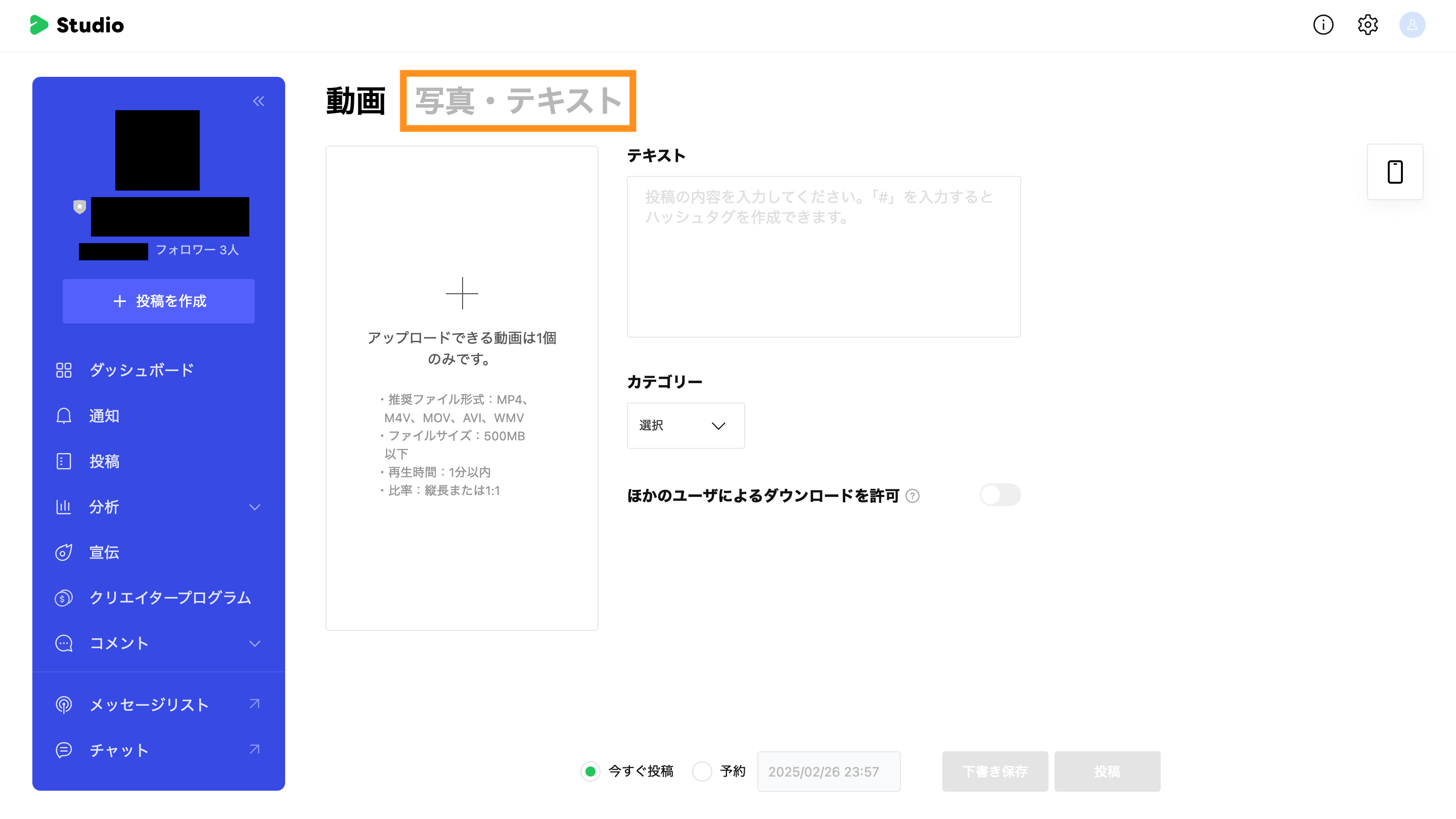 投稿の作成画面では「写真・テキスト」をクリックします。