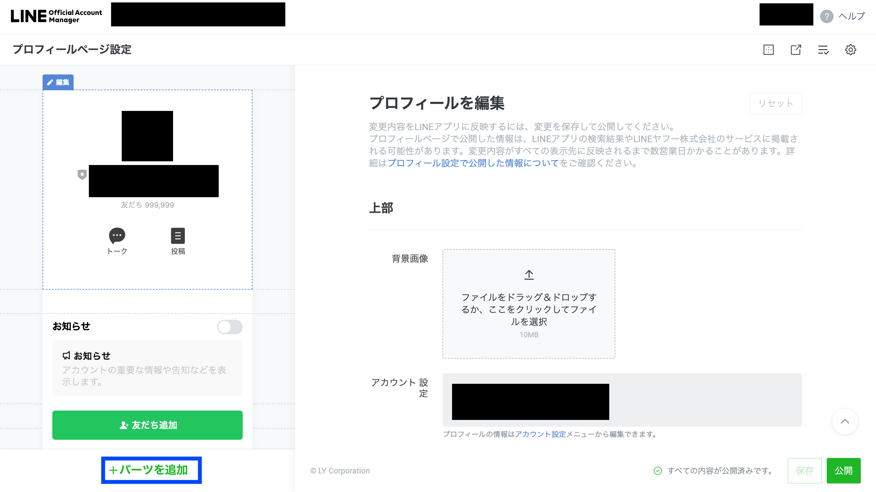 プロフィールページ設定の画面では、「+パーツを追加」欄をクリックします。