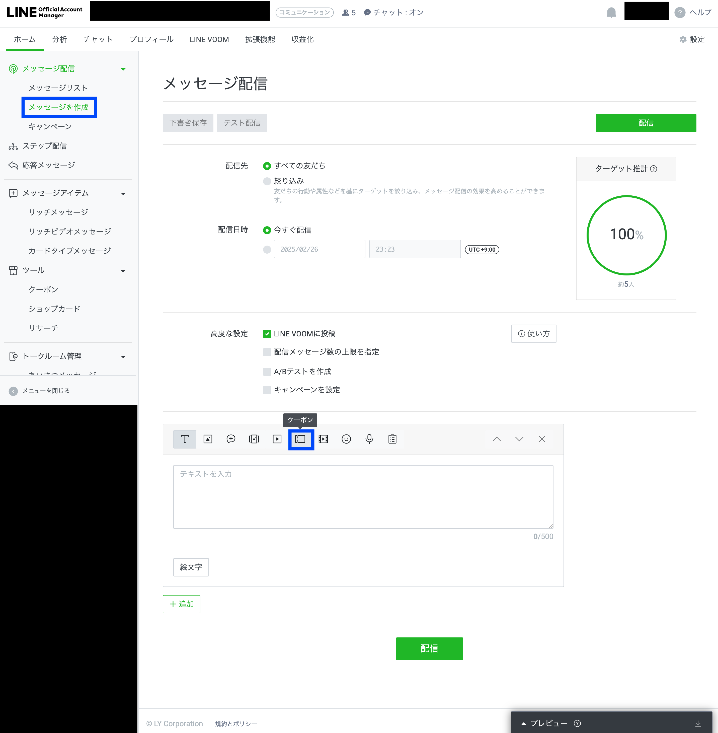 その方法としてはまず、画面左側サイドバーの「メッセージを作成」から下記画面に移り、画面最下部吹き出し設定欄の「クーポン」をクリックします。