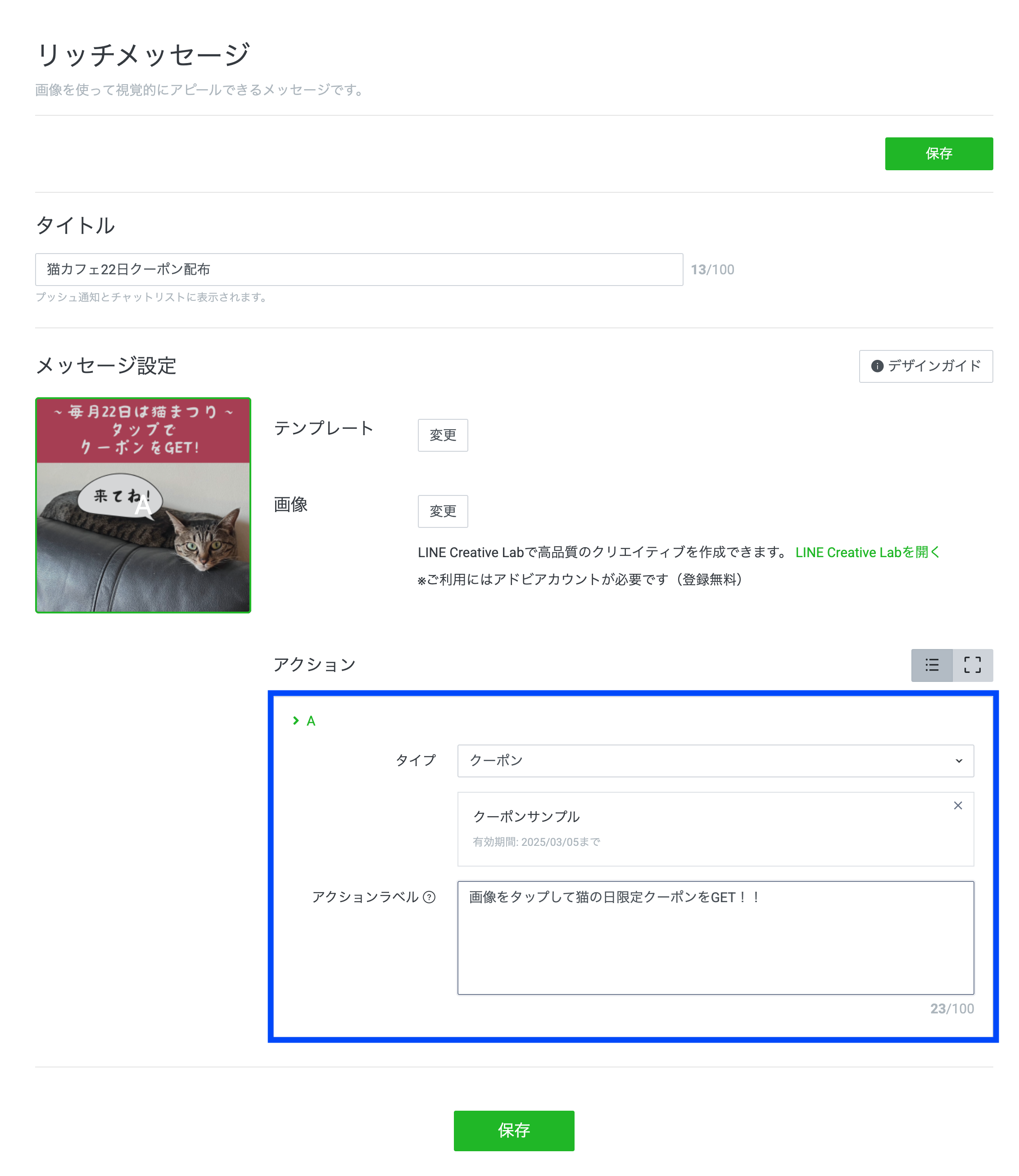 最後に、「アクションラベル」とその他設定を行い、「保存」をクリックします。