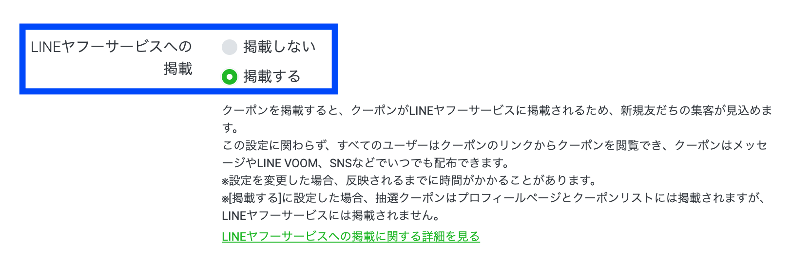 ただし、プロフィール等にクーポンを設定するには、あらかじめクーポン作成画面の「LINEヤフーサービスへの掲載」項目で「掲載する」を選択しておく必要があります。(友だち紹介クーポンは掲載不可 / その他LINEヤフーサービスへの掲載には、アカウント認証も必須)