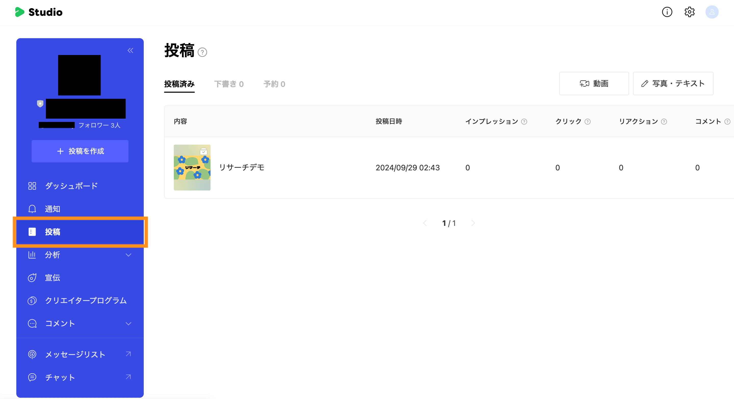 「LINE VOOM Studio」のホーム画面に遷移しますので、画面左側サイドバーの「投稿」もクリックしてください。