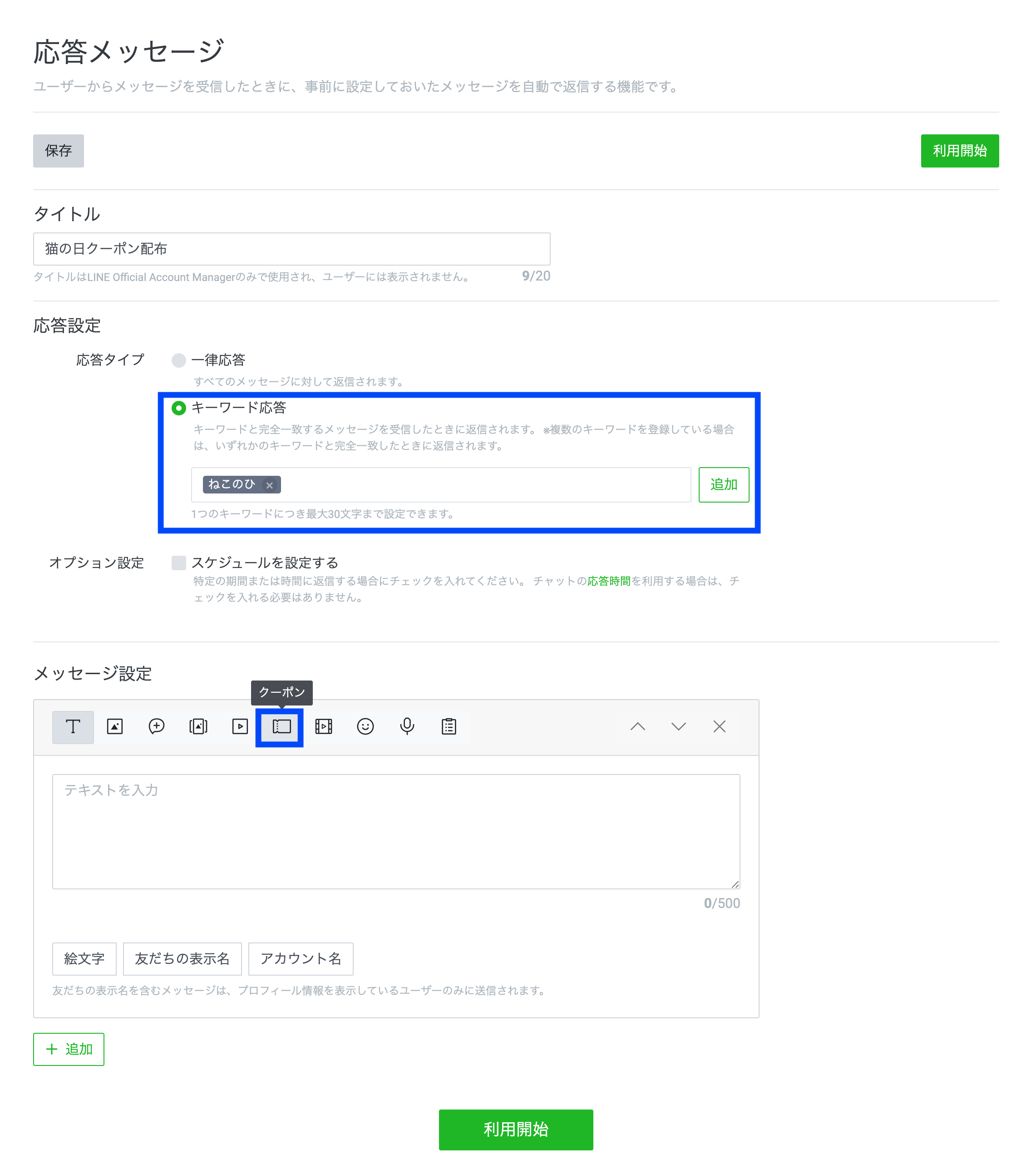 この応答メッセージでも、通常のメッセージ配信同様に吹き出しへのクーポンの設定が可能です。メッセージとKWが完全一致した場合にのみ応答を返す「キーワード応答」とも組み合わせられます。