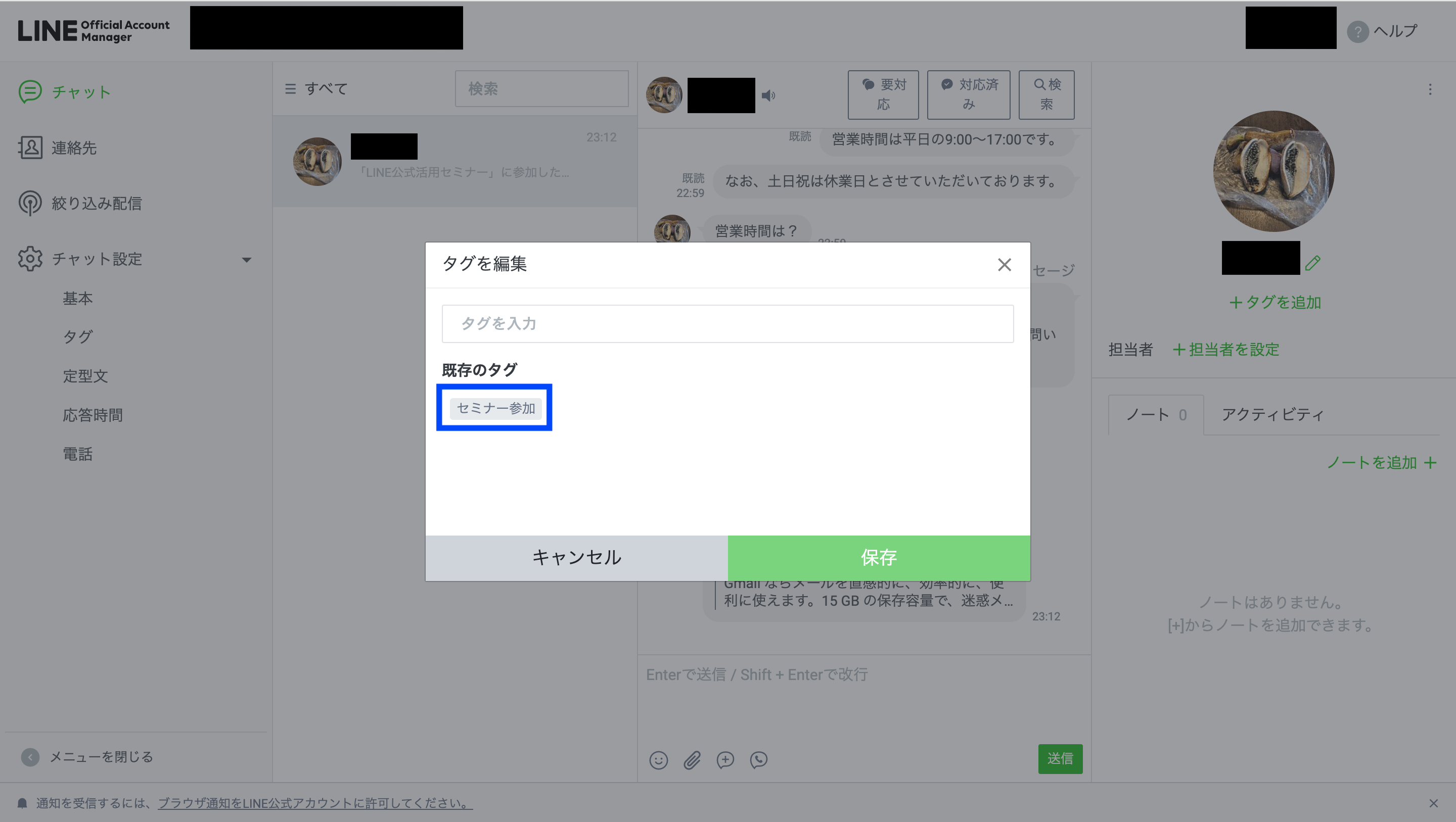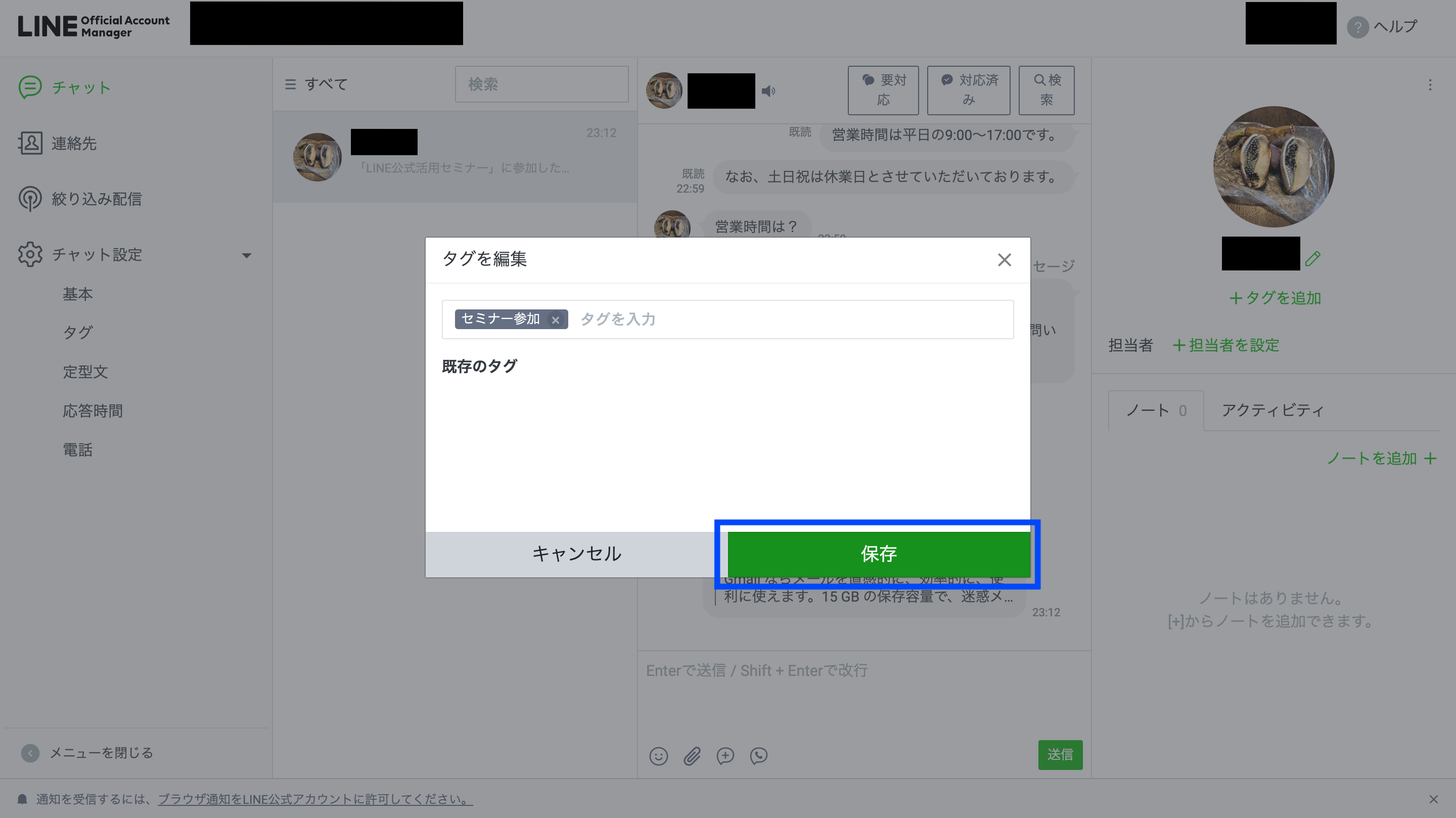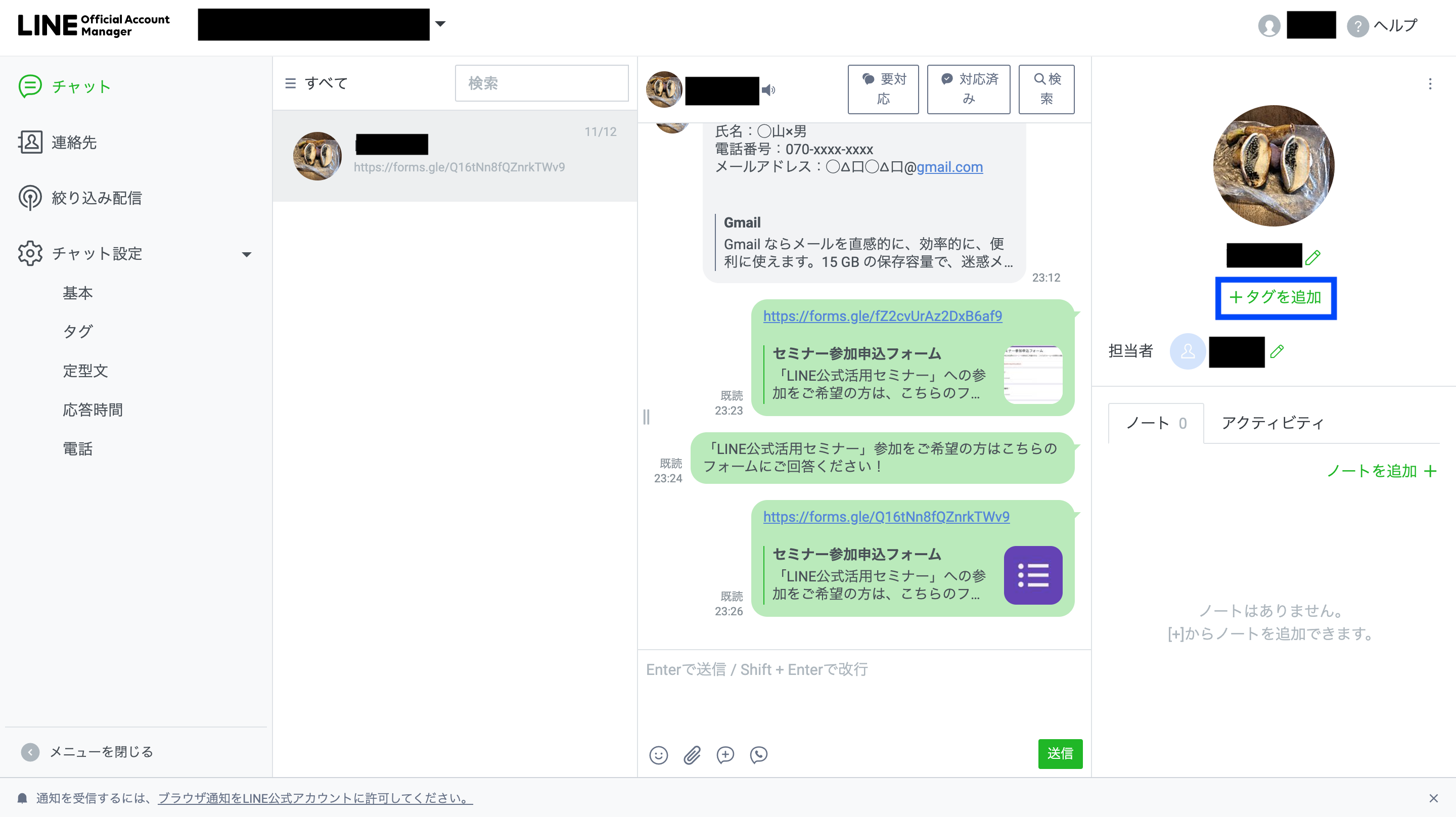 個別の友だちに対するタグの追加は、チャットルームの画面右端友だち名の下にある「+タグを追加」から可能。(下図青枠部分)