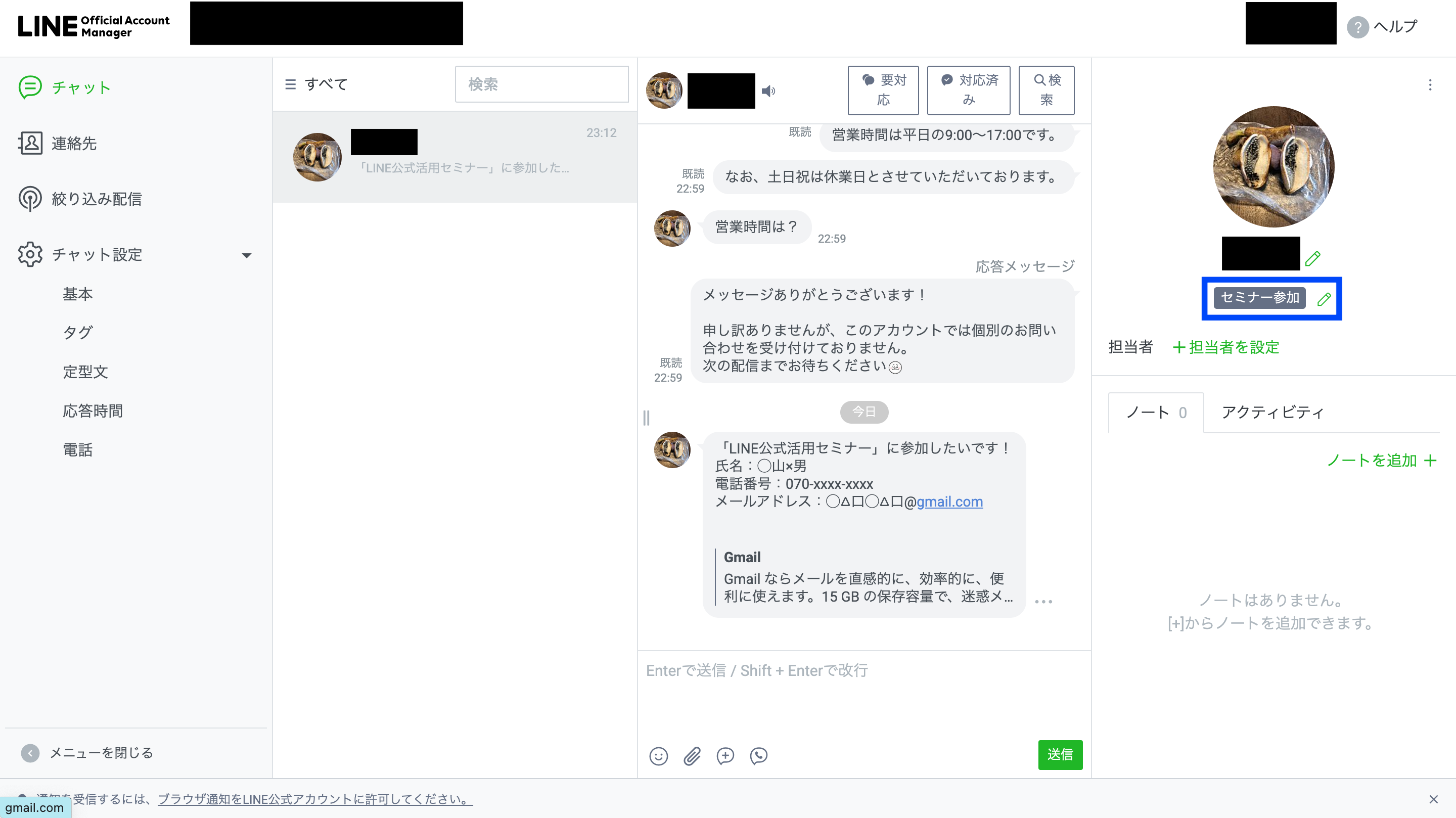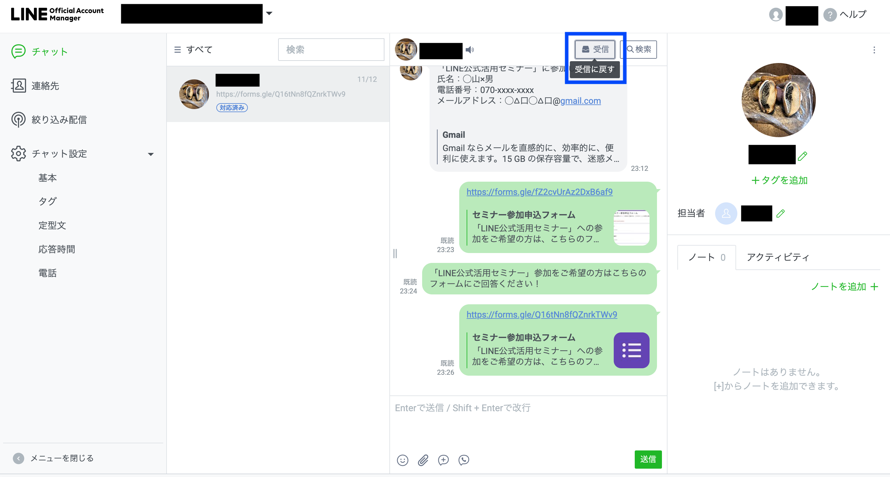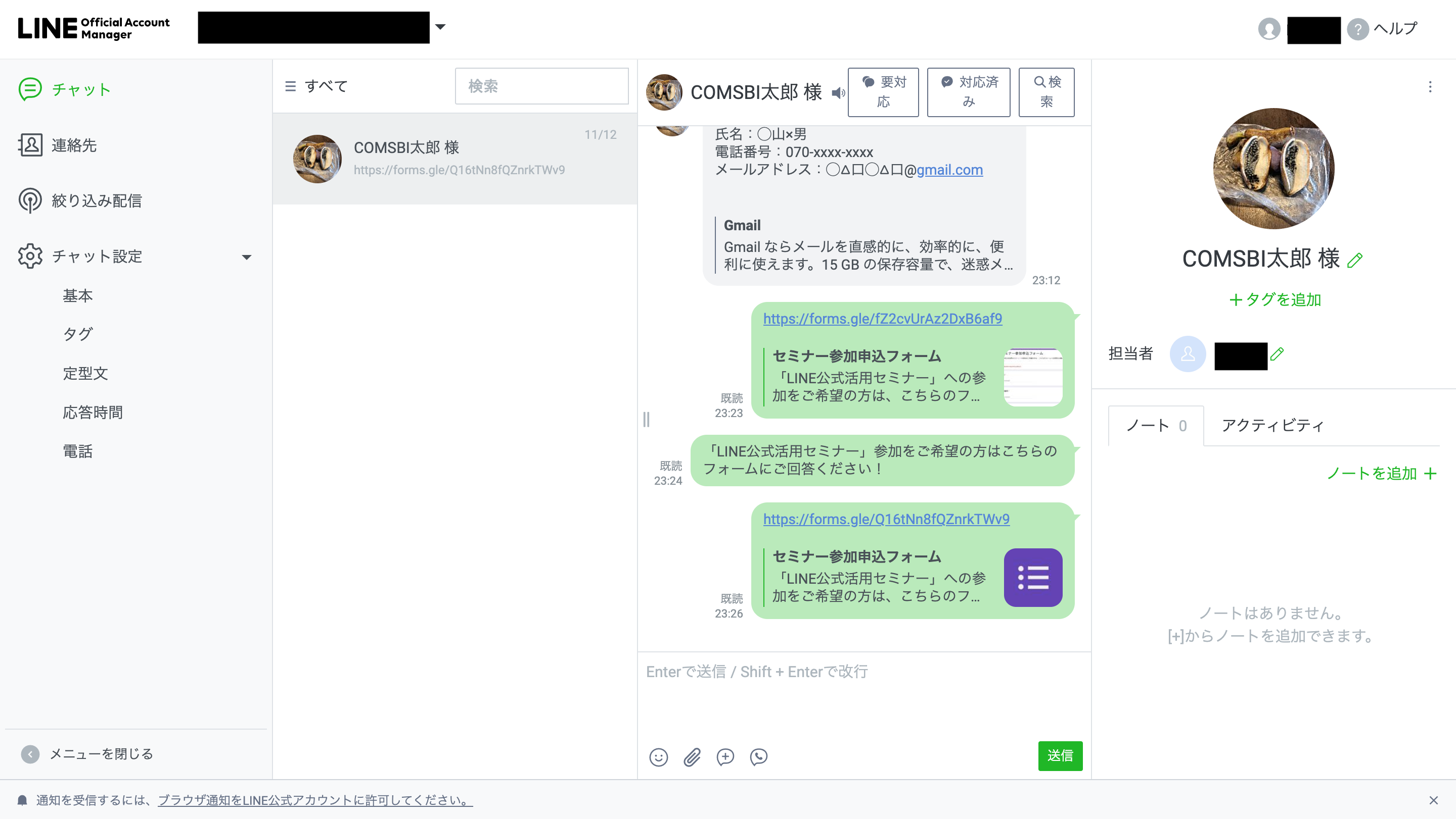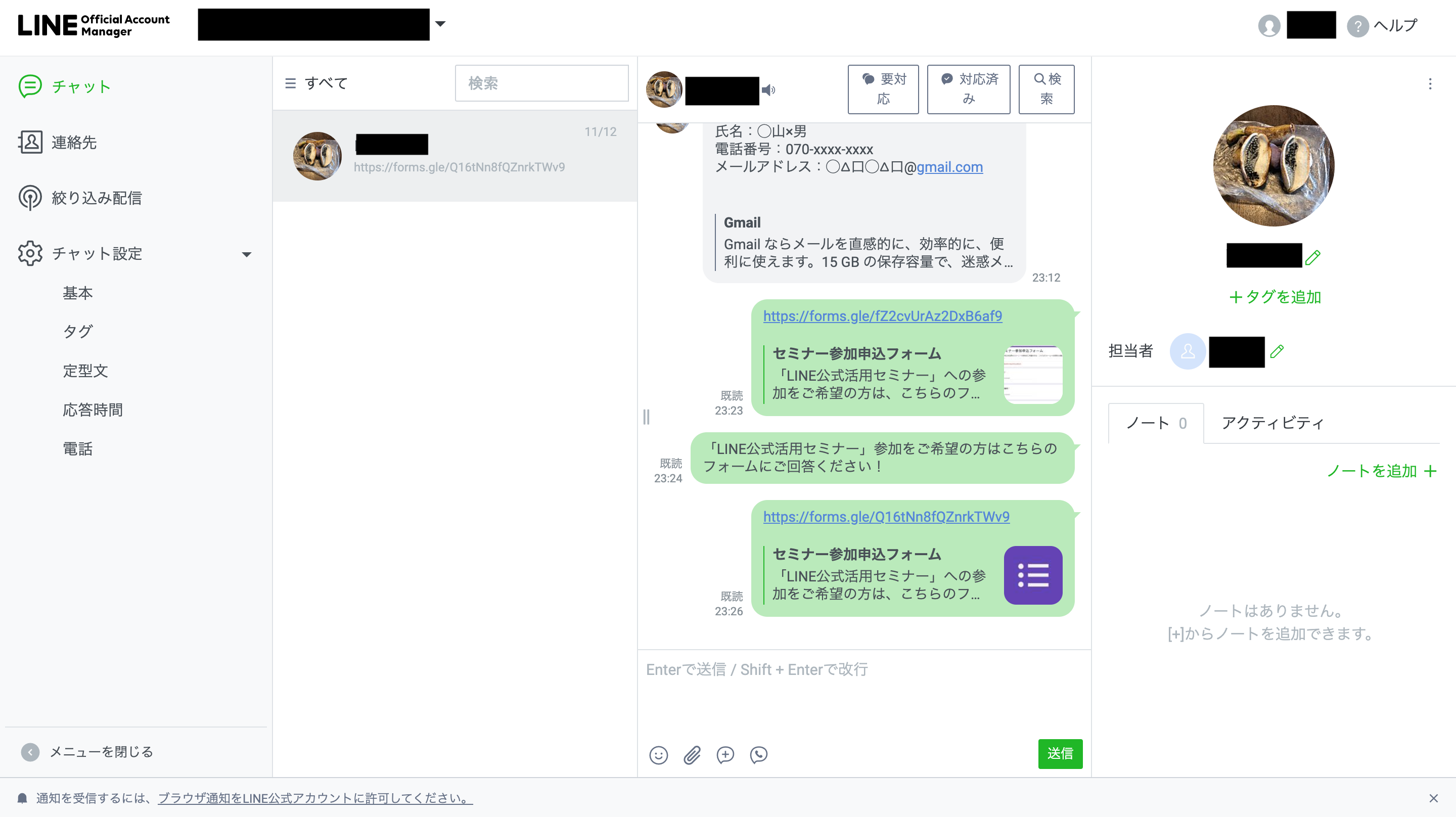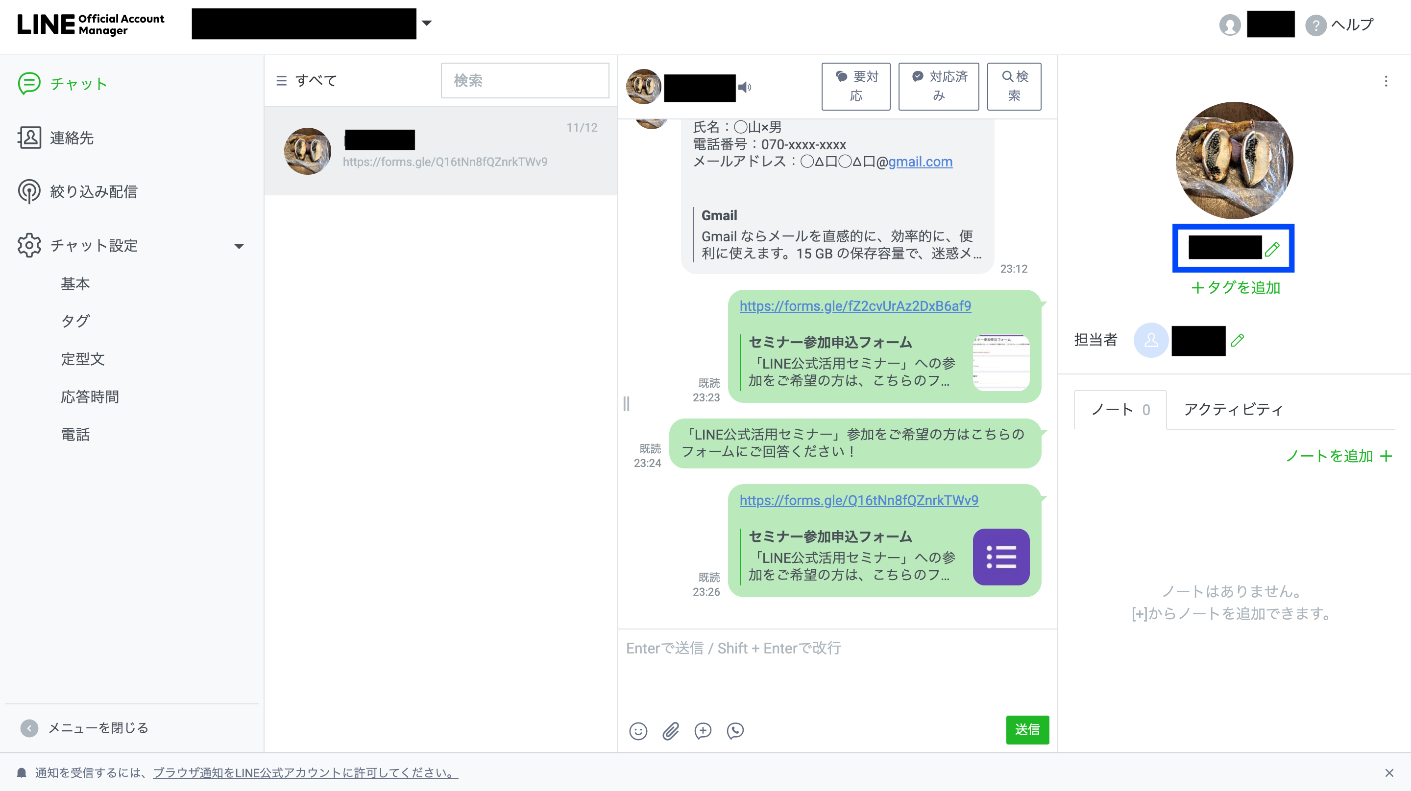今度は以下のとおり、友だちとのチャットルームが開きましたね。ここでは個別の友だちについて、対応状況 / タグ / 表示名 / ノート / 担当者の設定が可能です。次項から、詳しい設定方法をみていきましょう。