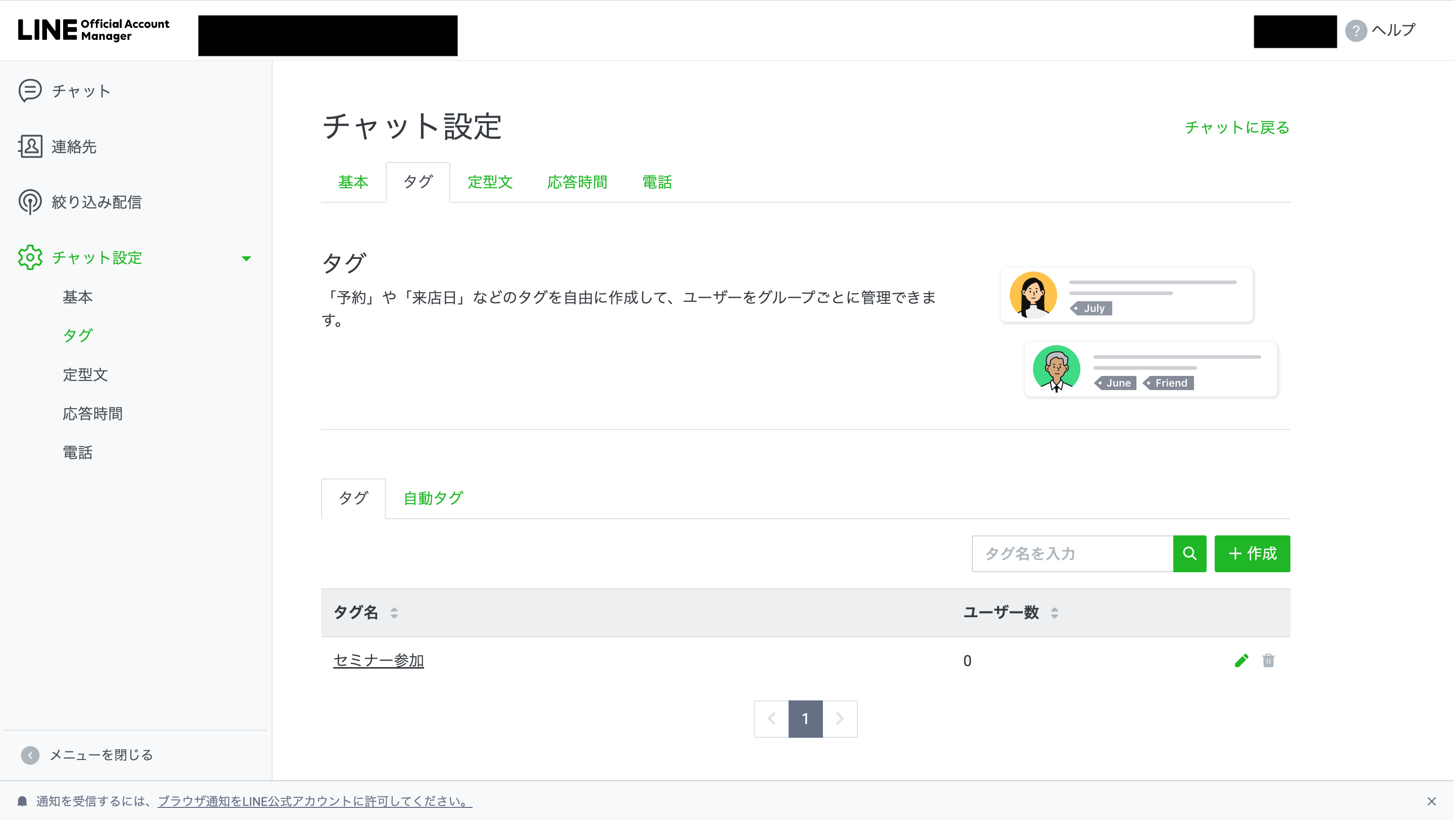 チャット専用画面の左側サイドバーをみてみると、チャット設定の下に「タグ」の項目があるので、そちらをクリックしてみましょう。(下図)