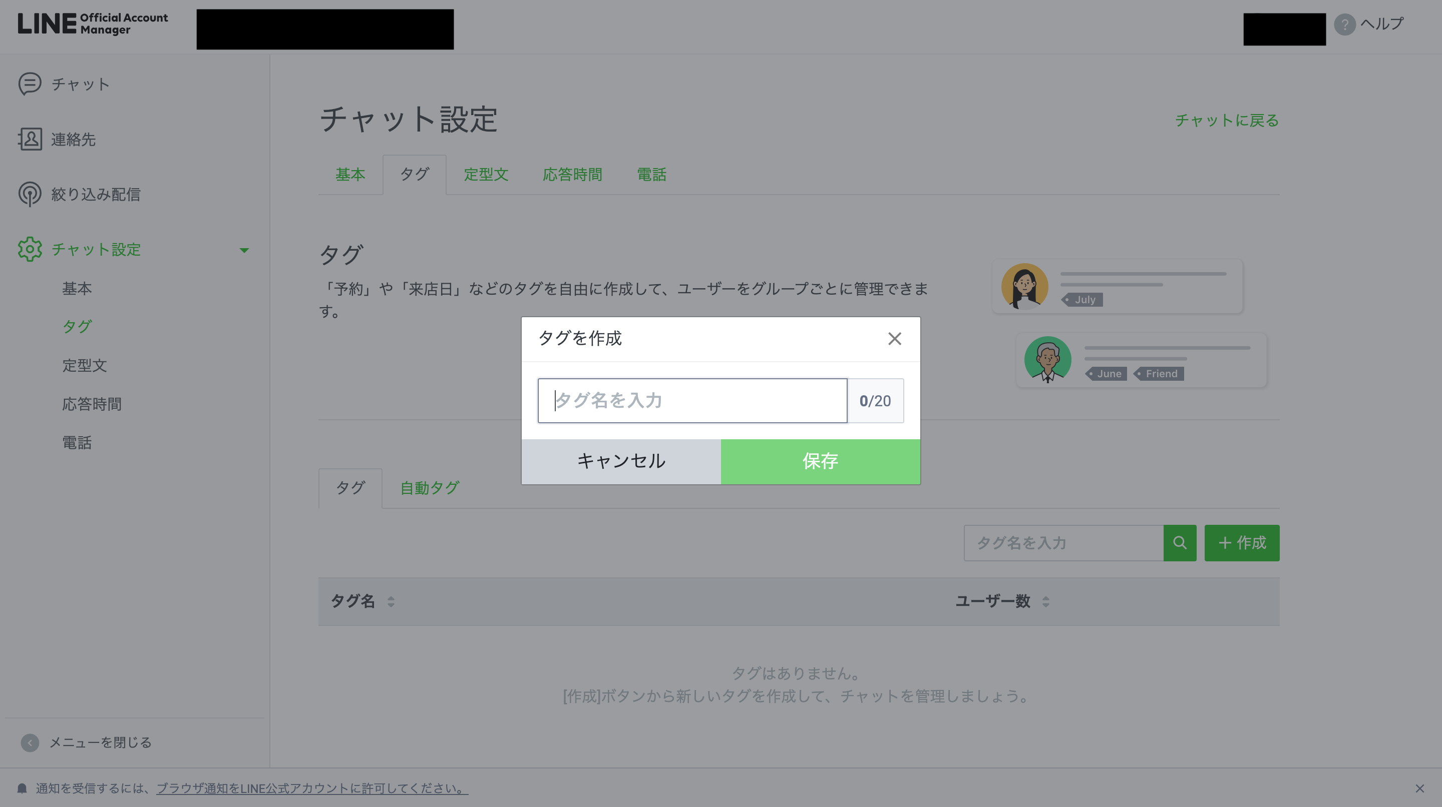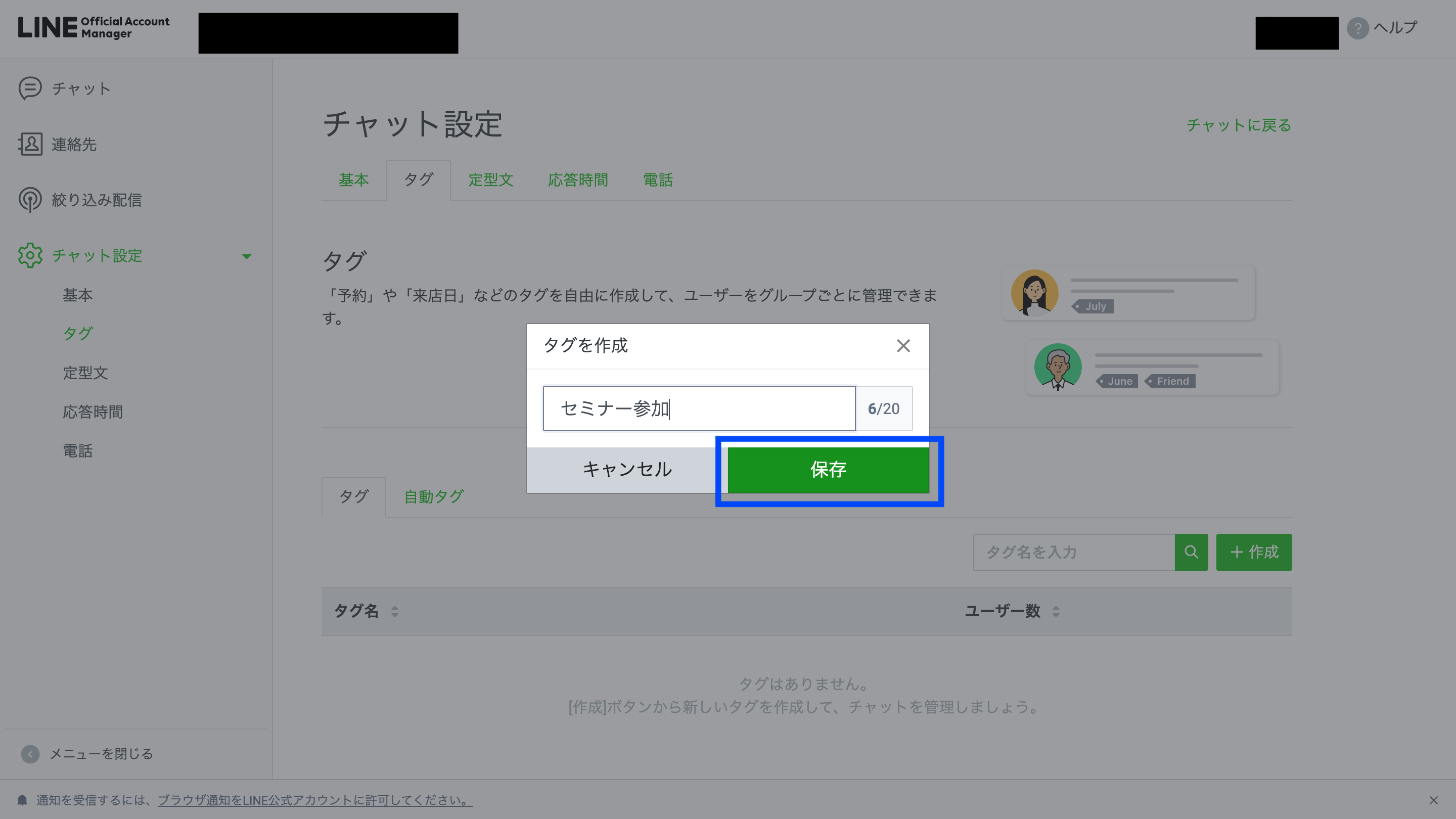 適当なタグ名を入力して、ポップアップ右下「保存」をクリックすれば、チャットタグが完成します。(下図)