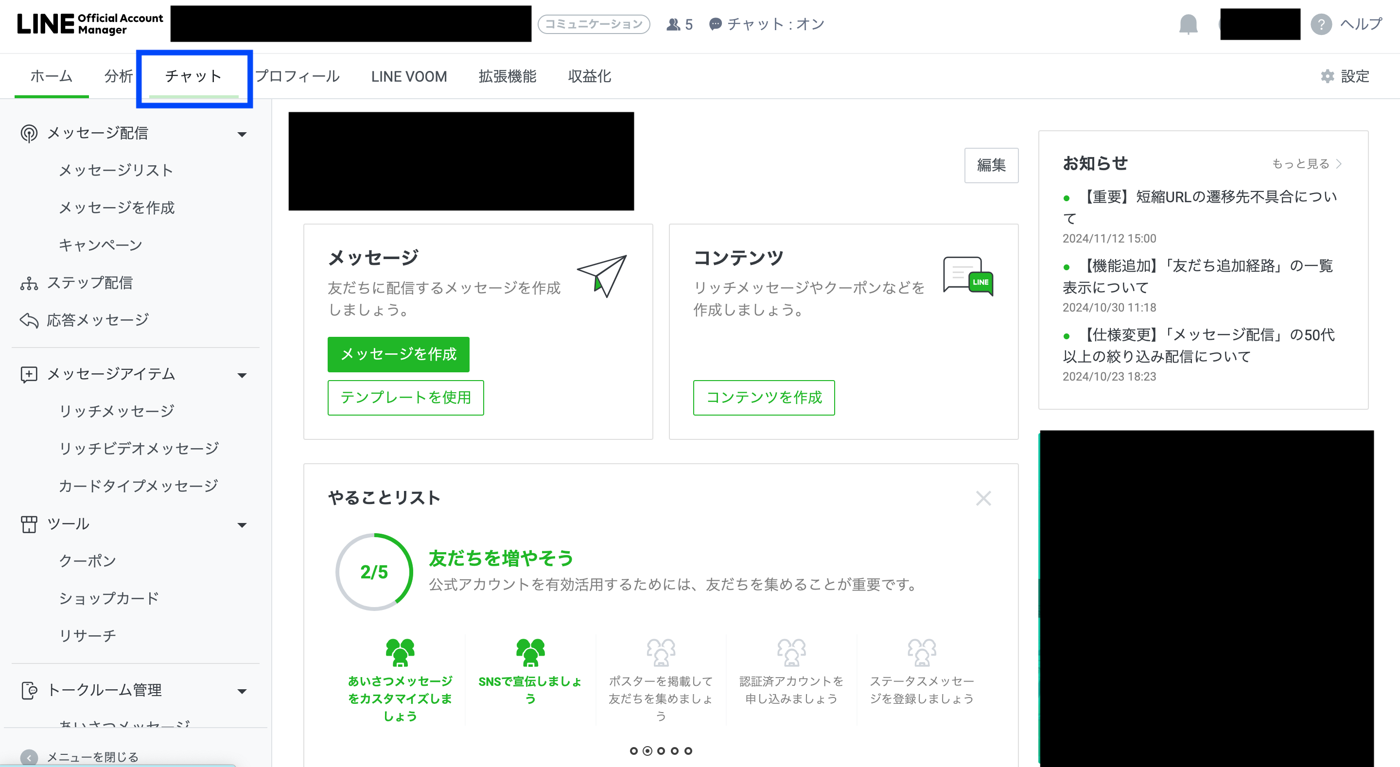 まずは、管理画面のホームにアクセスしてみてください。すると、以下のとおり「チャット」の欄があるので、そちらをクリックしましょう。