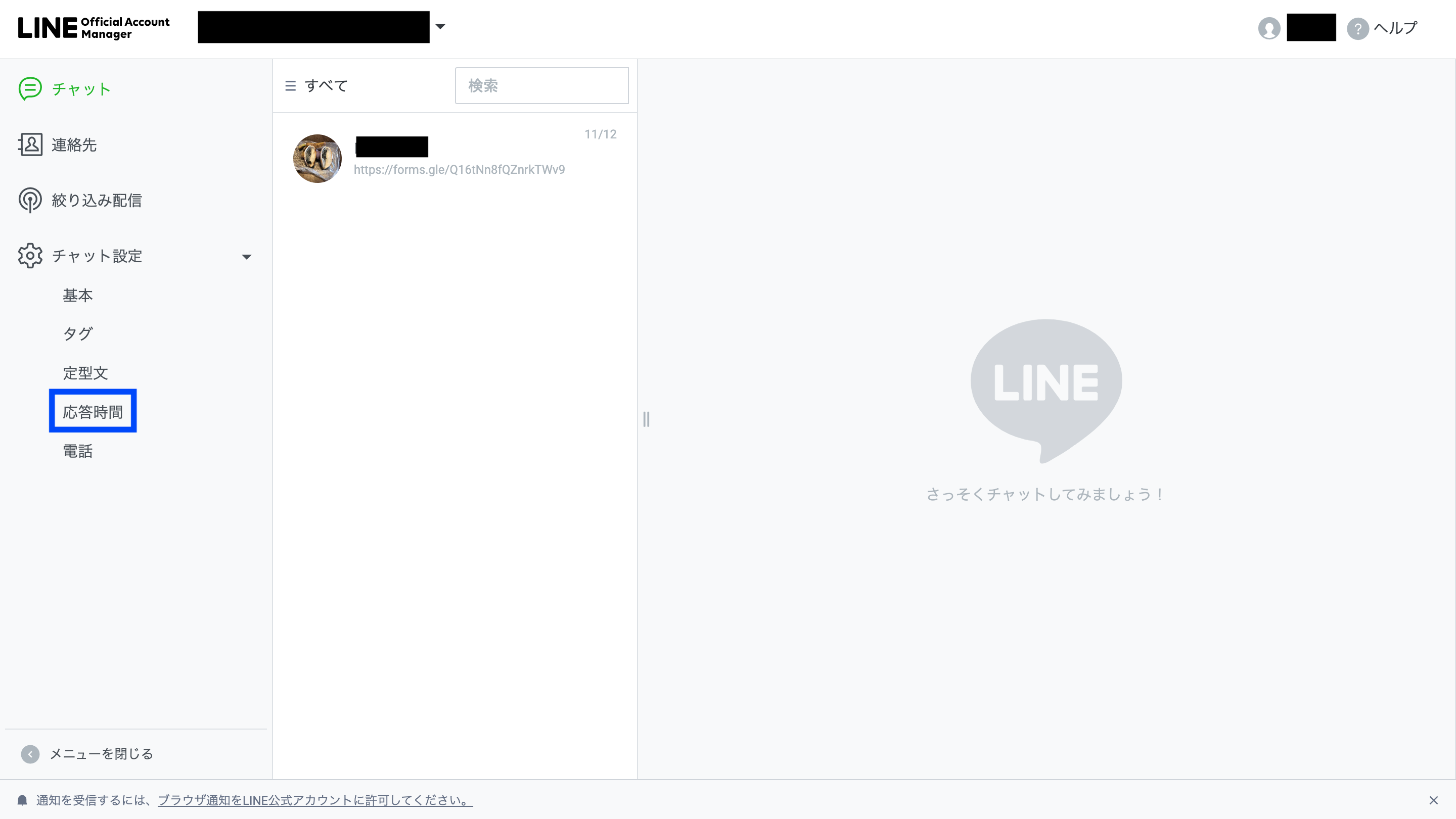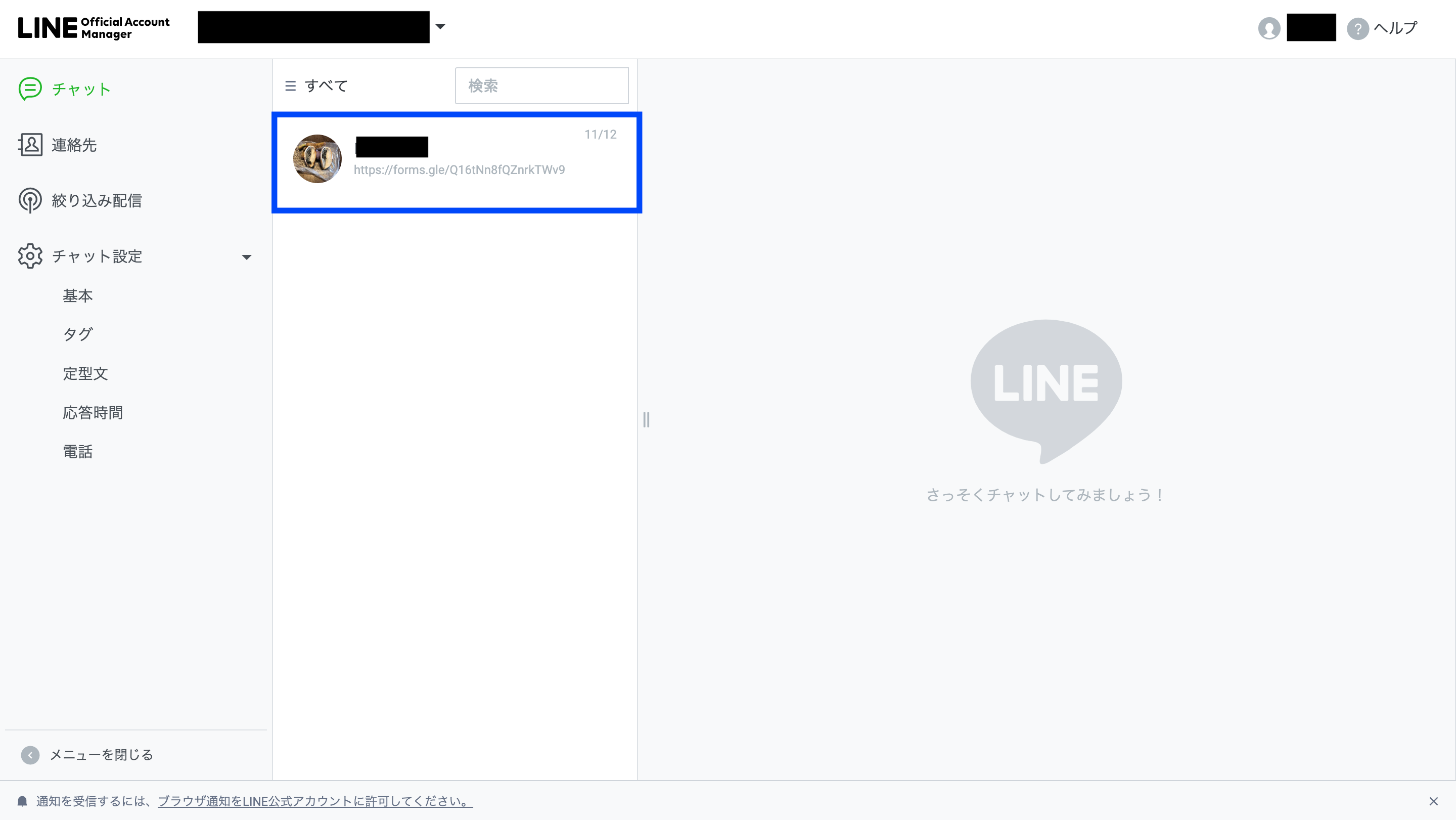 ここでは、LINE公式でのチャットの開き方について、PC版管理画面(LINE Official Account Manager)での手順をご紹介します。