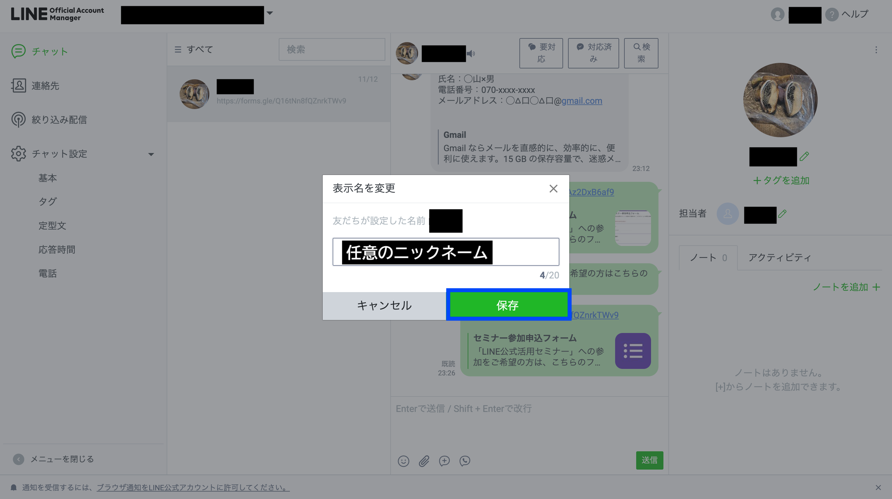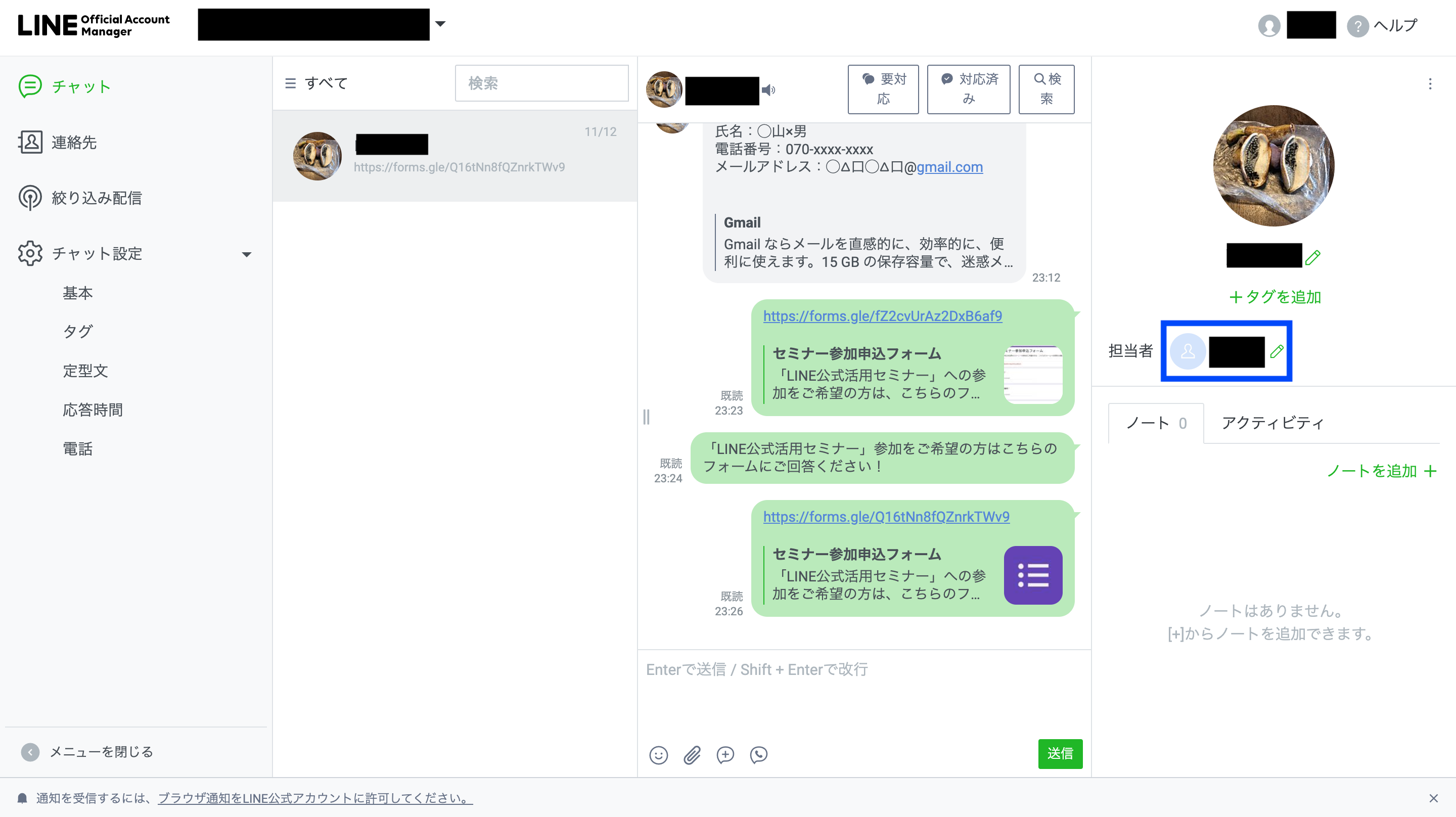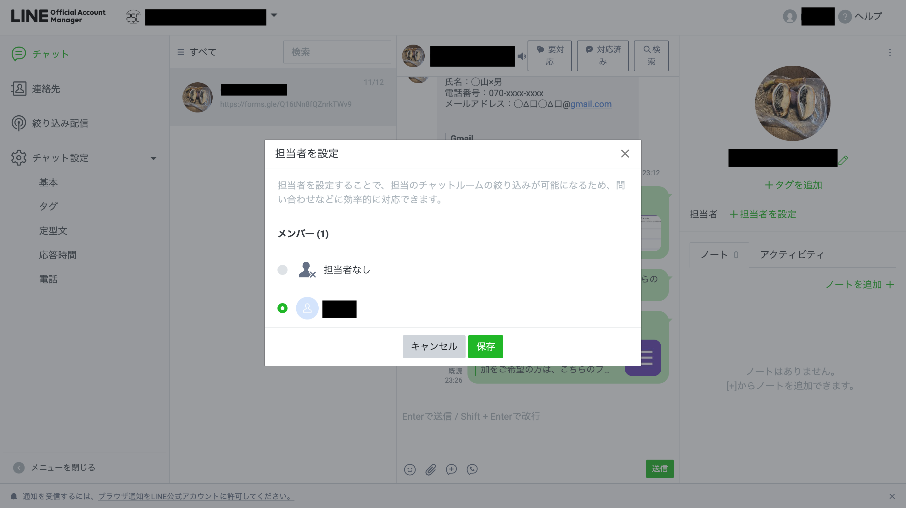LINE公式のチャットでは、各友だちに対して返信を行う「担当者」が設定可能。こちらを設定しておくことで、友だち一覧から各人が担当する友だちだけを絞り込んで対応できます。