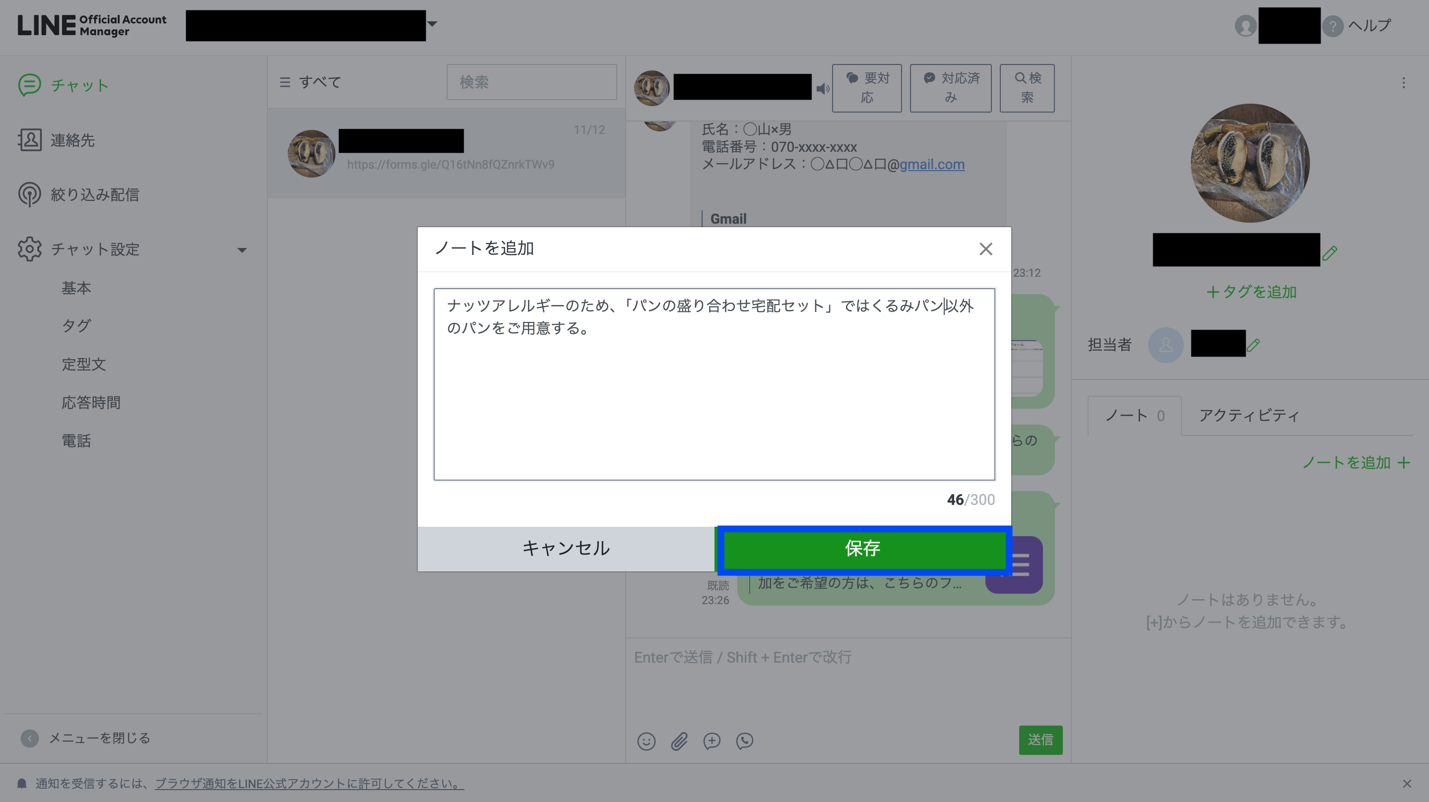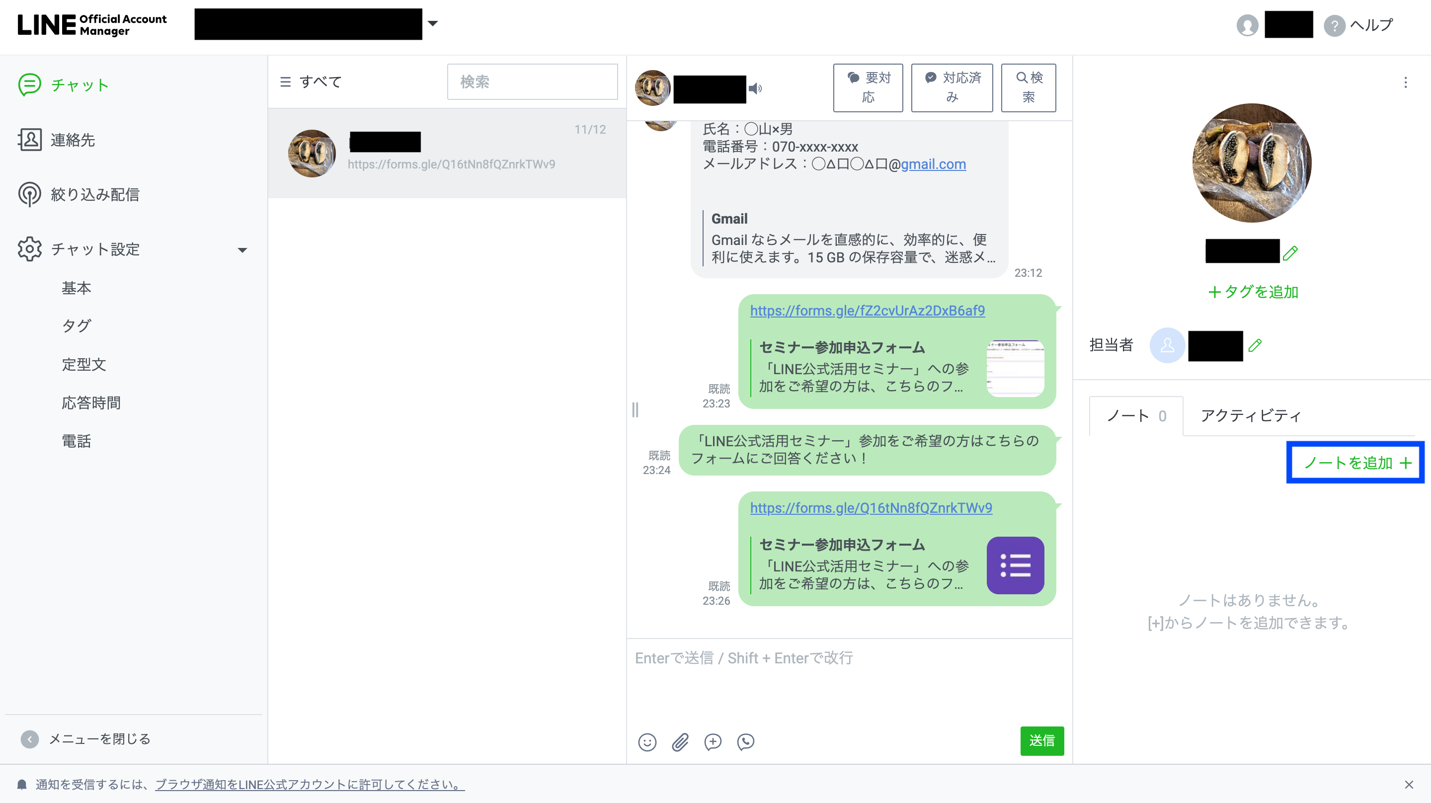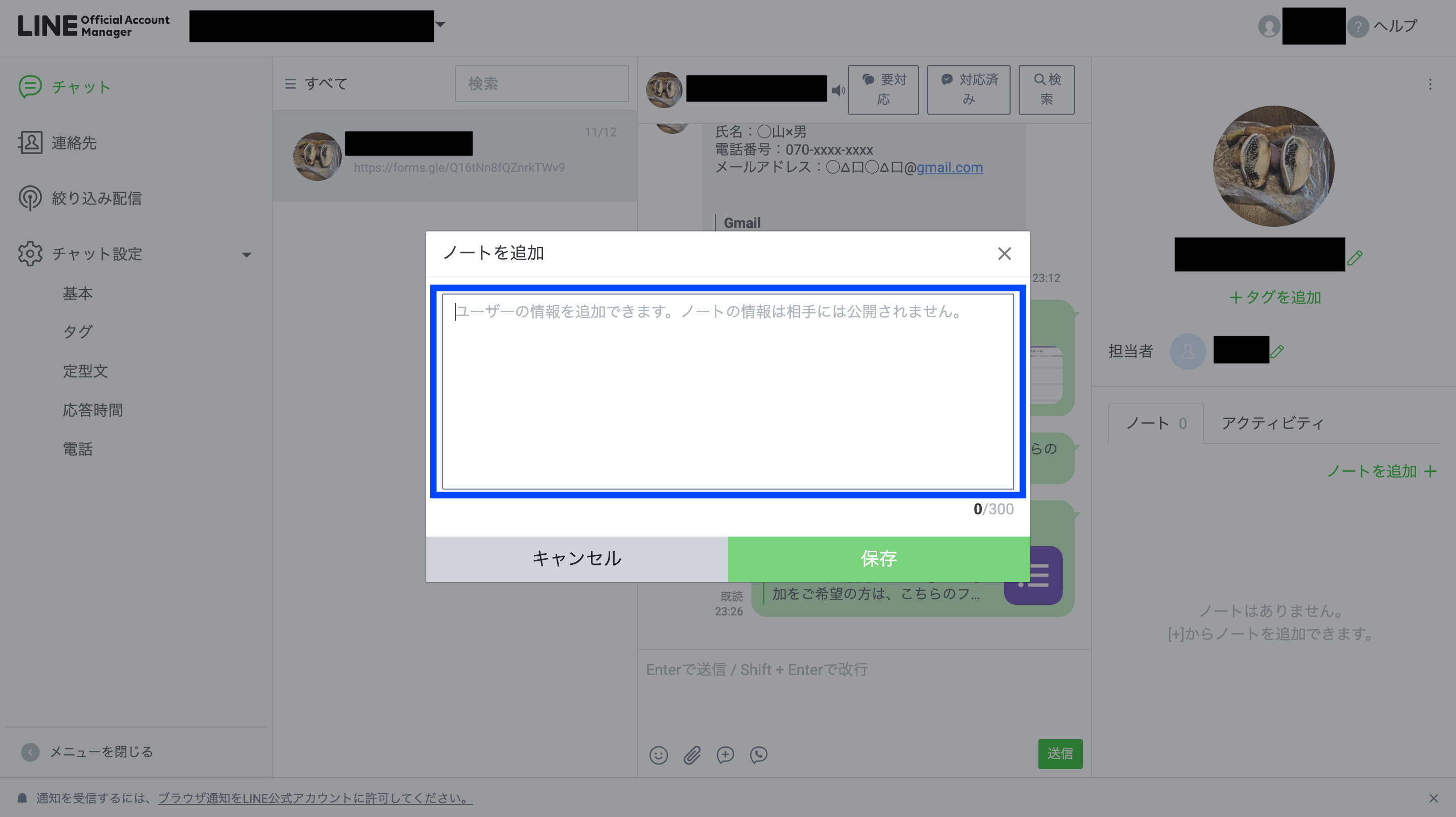 LINE公式のチャットルームは、各友だちの留意事項を記録するためのノートも完備。他のチャット担当者にその友だちの細かな情報を共有できます。