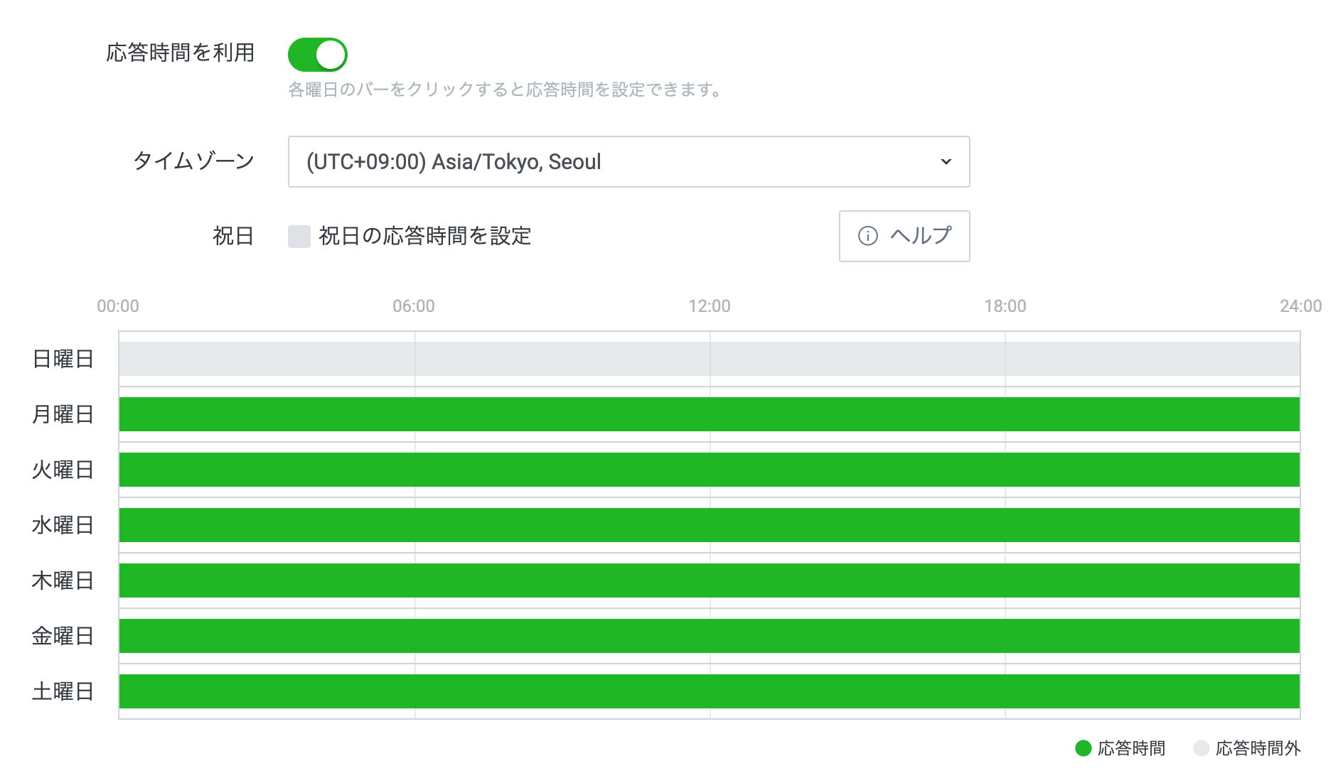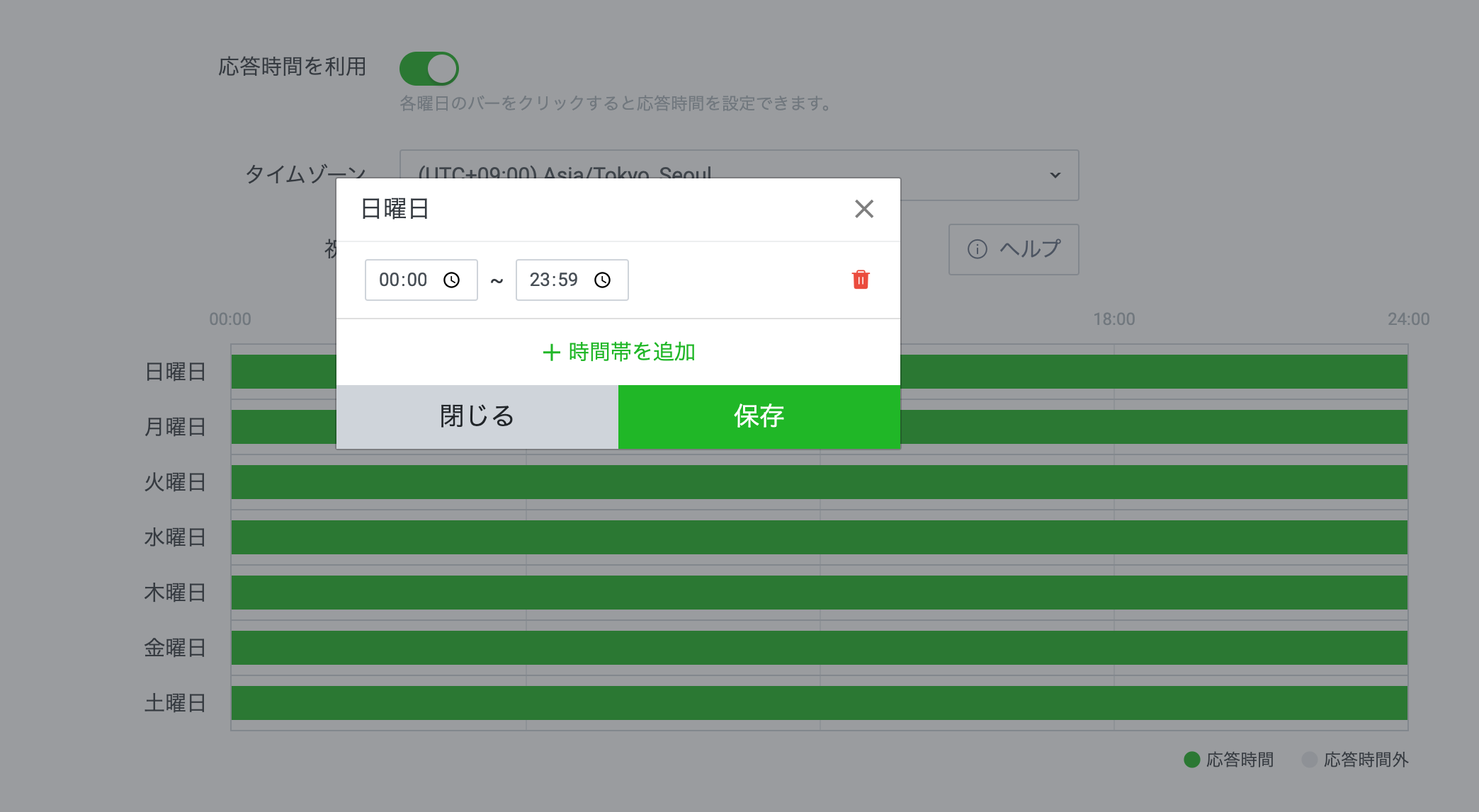 応答時間をクリックすると、以下の設定画面が表示されます。ここでは「応答時間を利用」のON/OFFでステータスバーの有無が設定できるほか、各曜日の応答時間の指定も可能。試しに、00:00〜24:00まで緑色になっている「日曜日」をクリックしてみましょう。