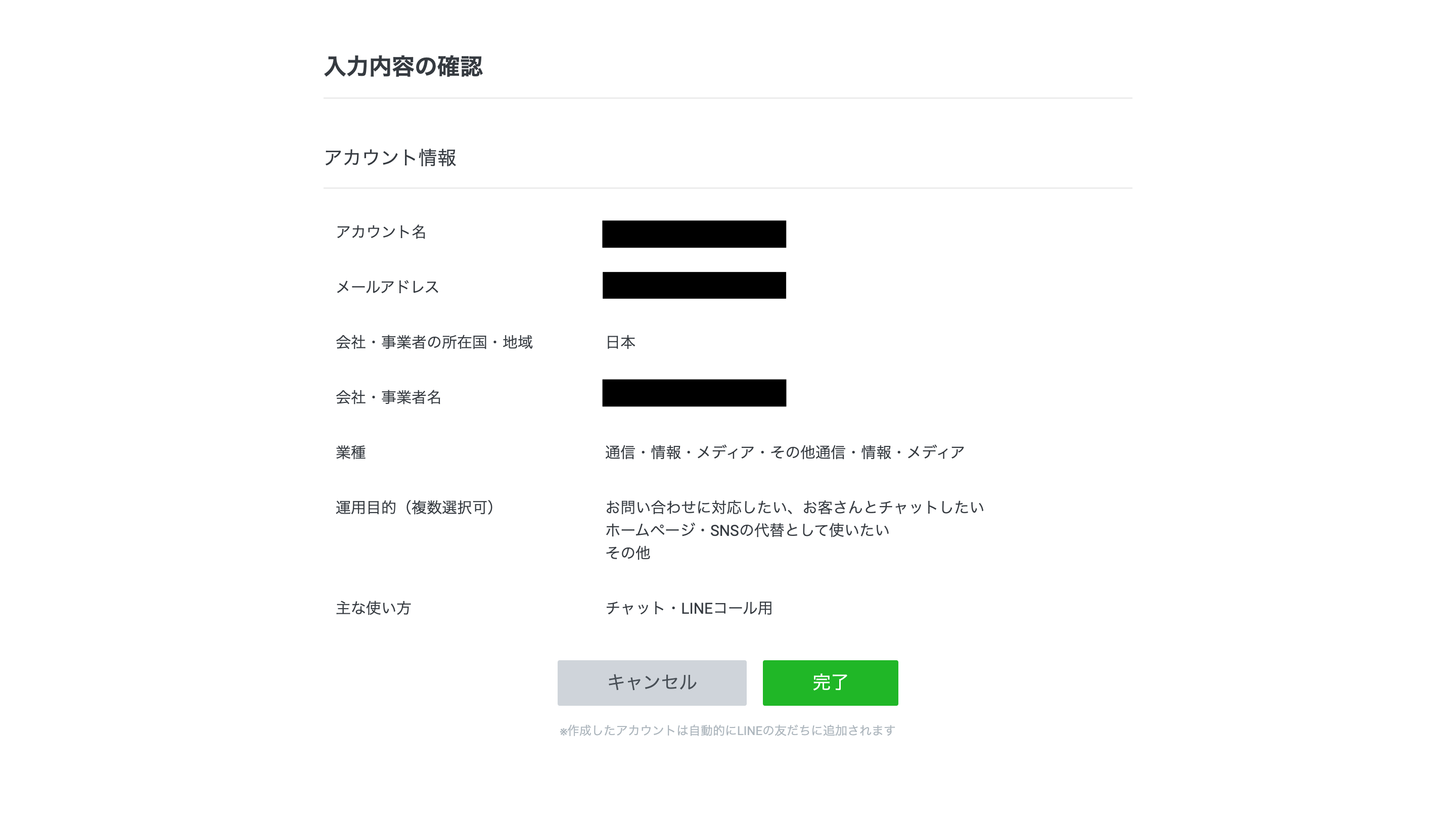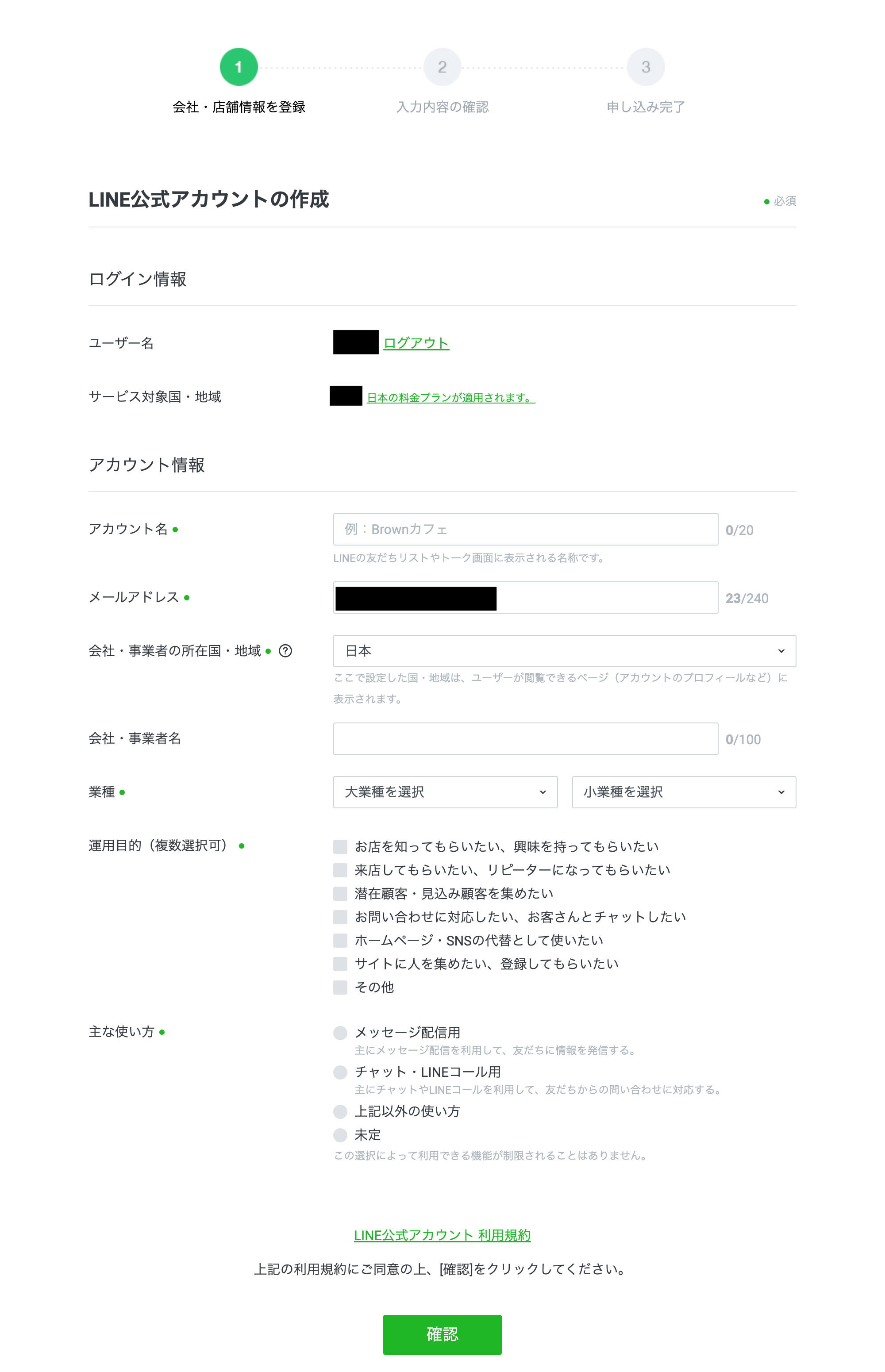 すると以下のとおり、LINE公式アカウントの作成画面が表示されます。ここに、アカウント名(≠ユーザー名)・事業内容・運用目的などを入力して、「確認」ボタンをクリックします。