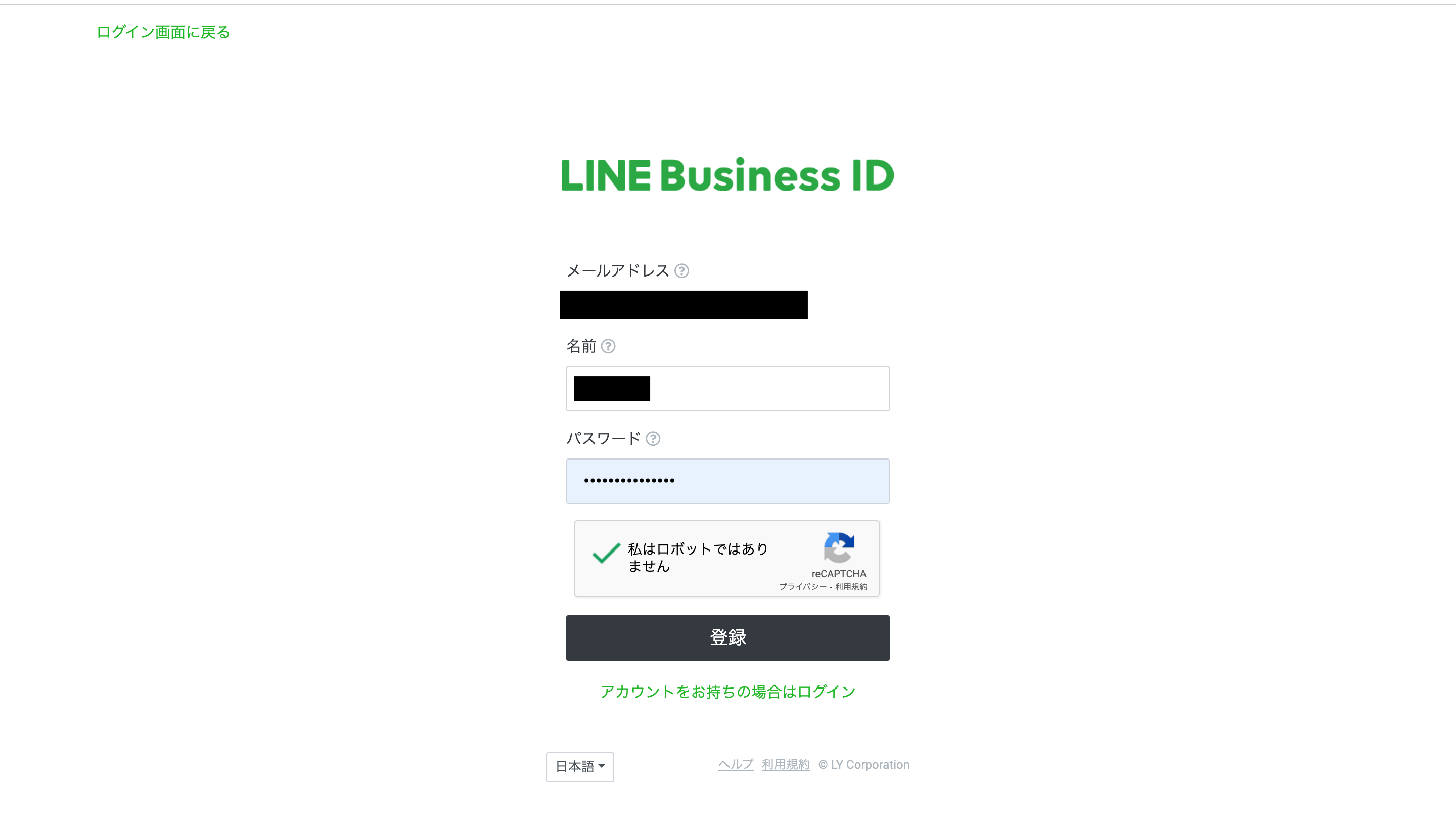 下図のように、LINE Business IDのユーザー名&パスワード登録画面に遷移します。ここで、任意の名前とパスワードを入力して「私はロボットではありません」の認証を済ませ登録をクリックします。