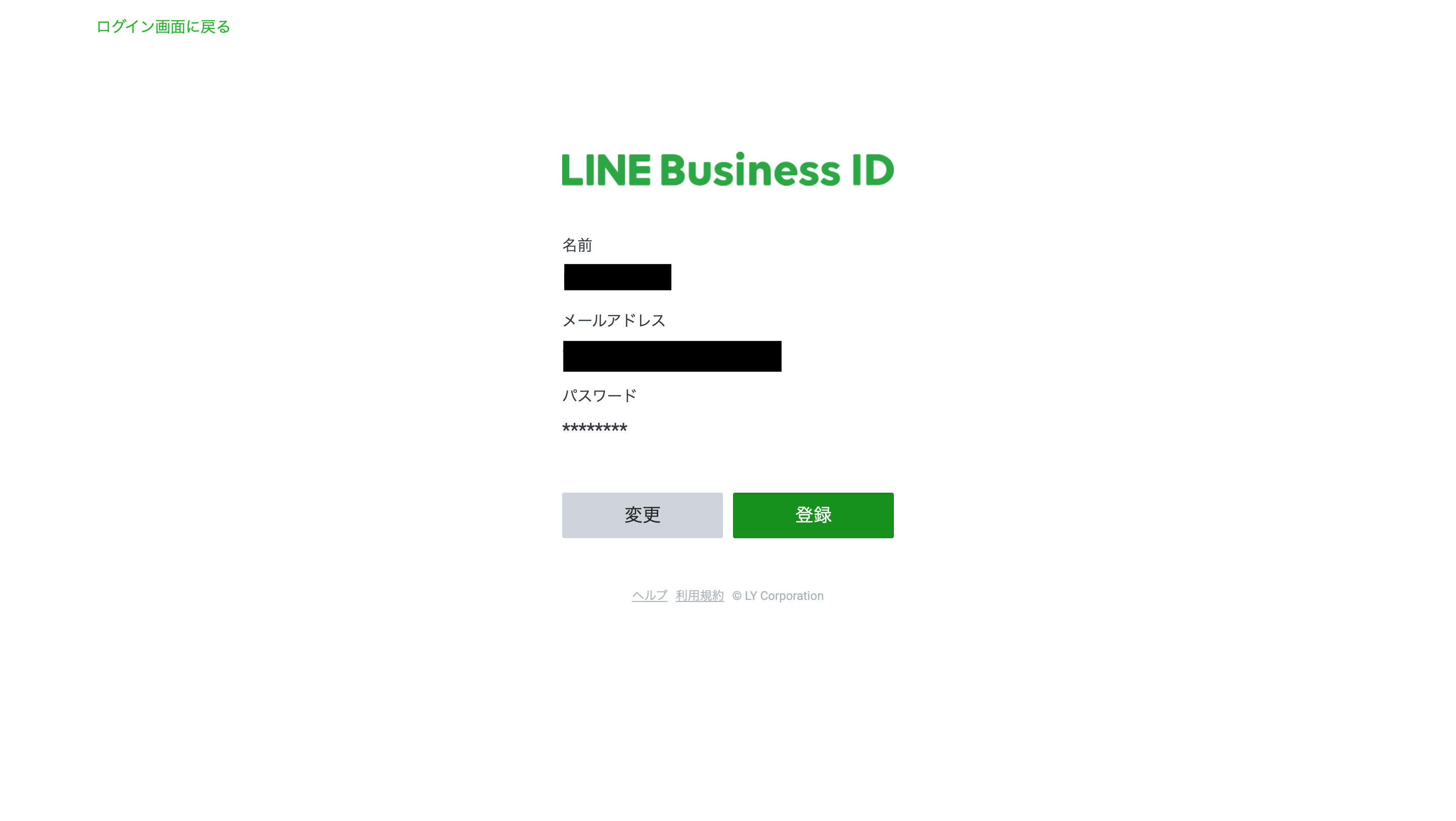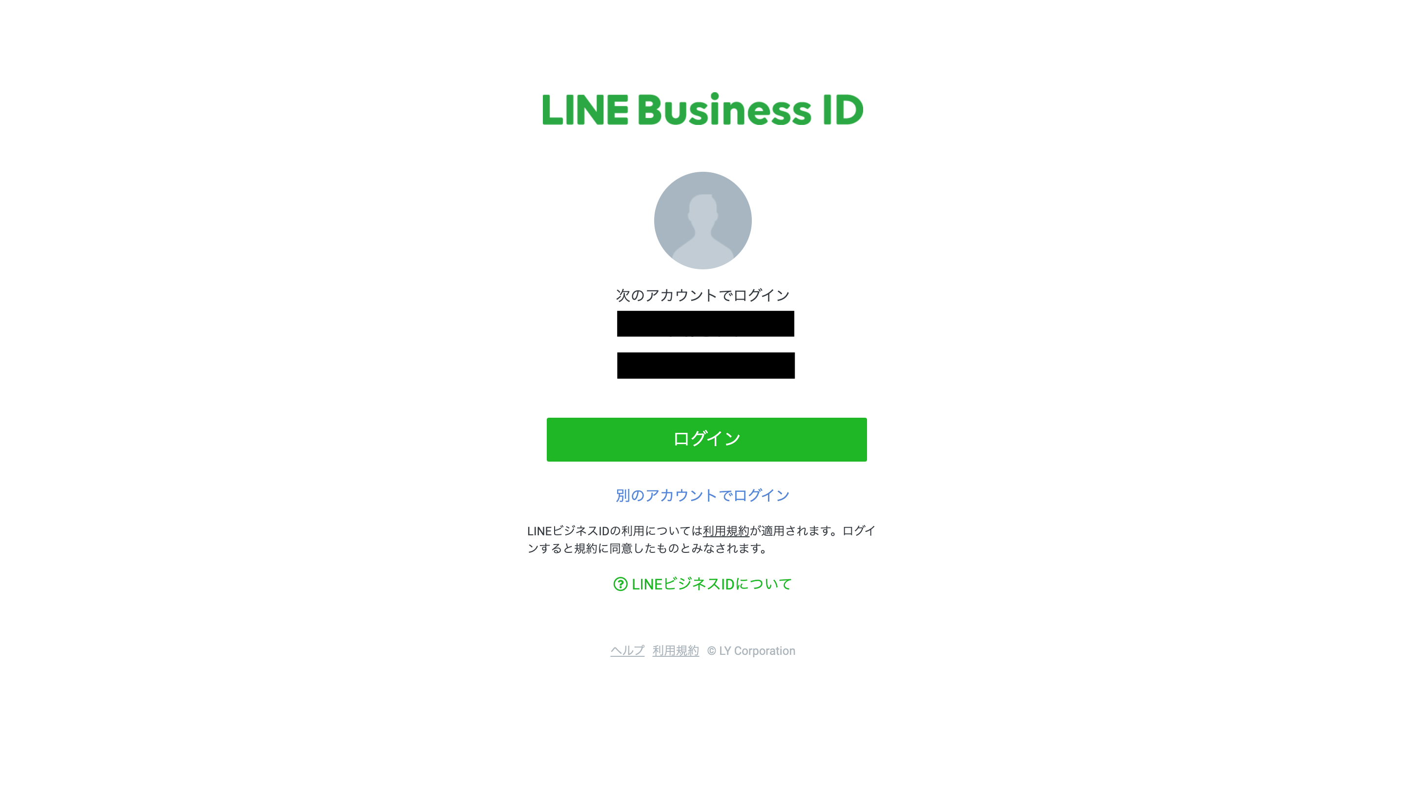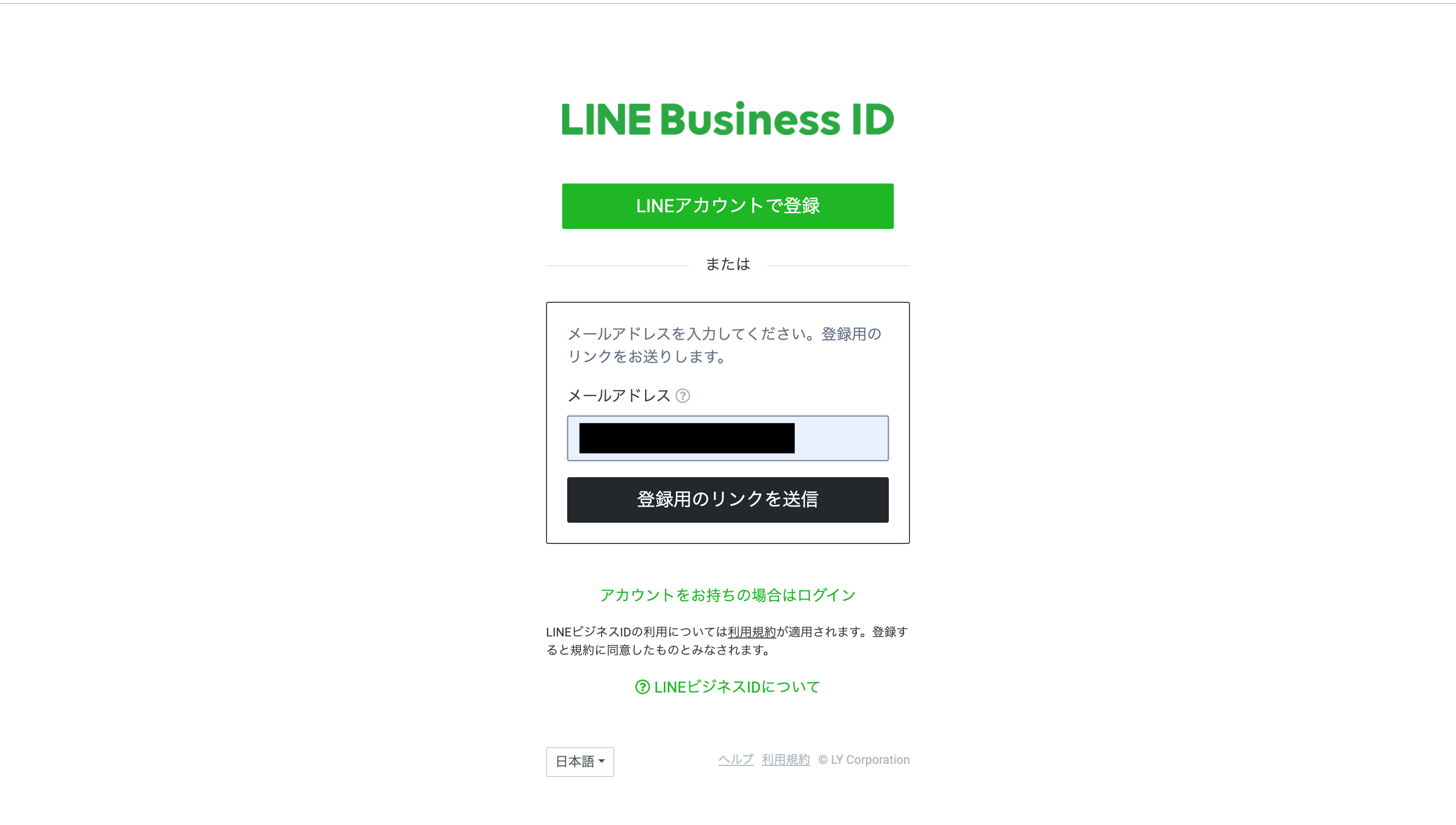 LINE Business IDの登録画面にアクセスすると、既存の個人用LINEアカウントまたはメールアドレスでLINE