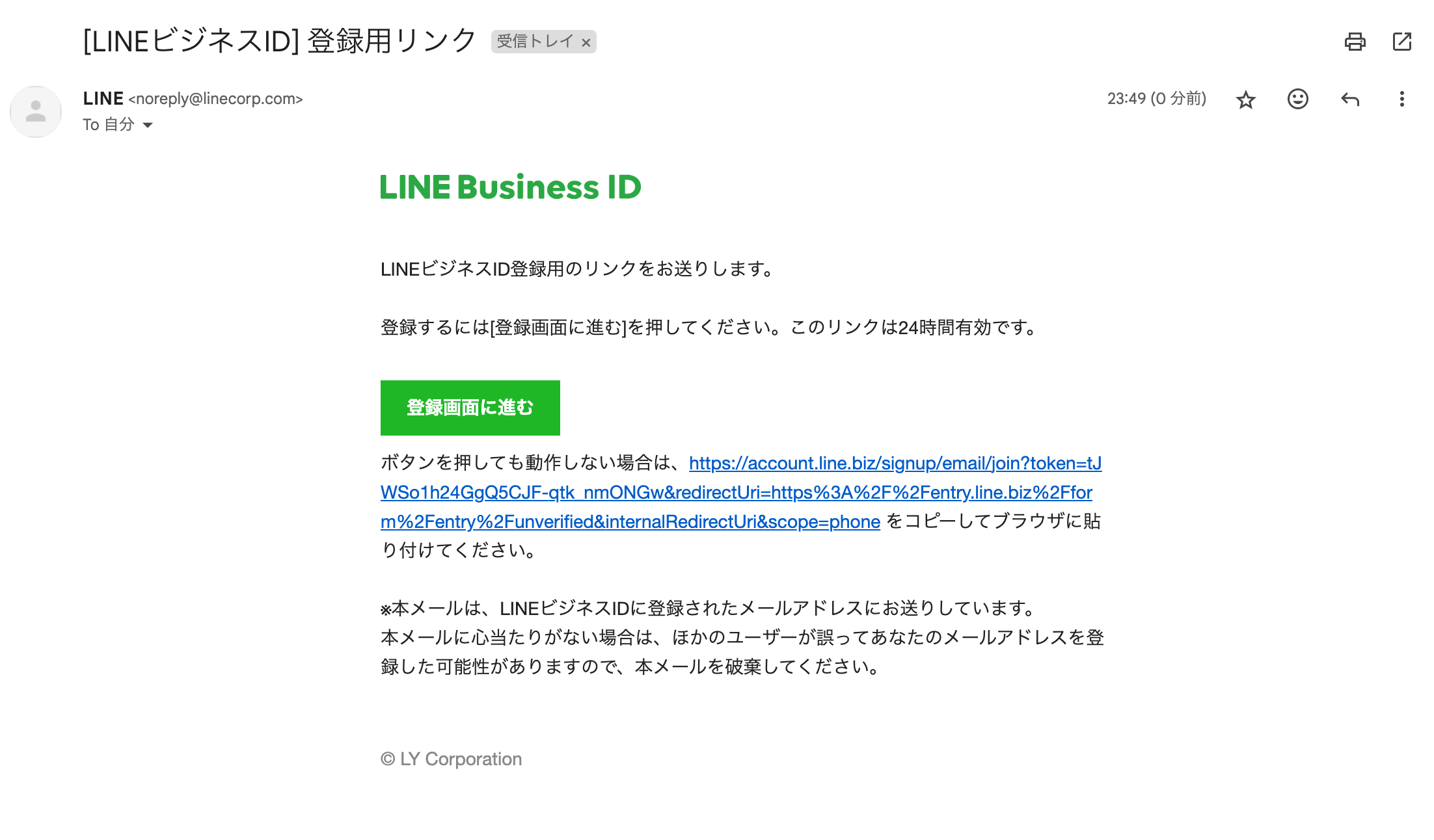 メールアドレスの入力を済ませた後にメールボックスを開くと、LINE Business ID登録用のリンクがメールで送られてきます。当該メールを開封して、「登録画面に進む」をクリックしてみましょう。