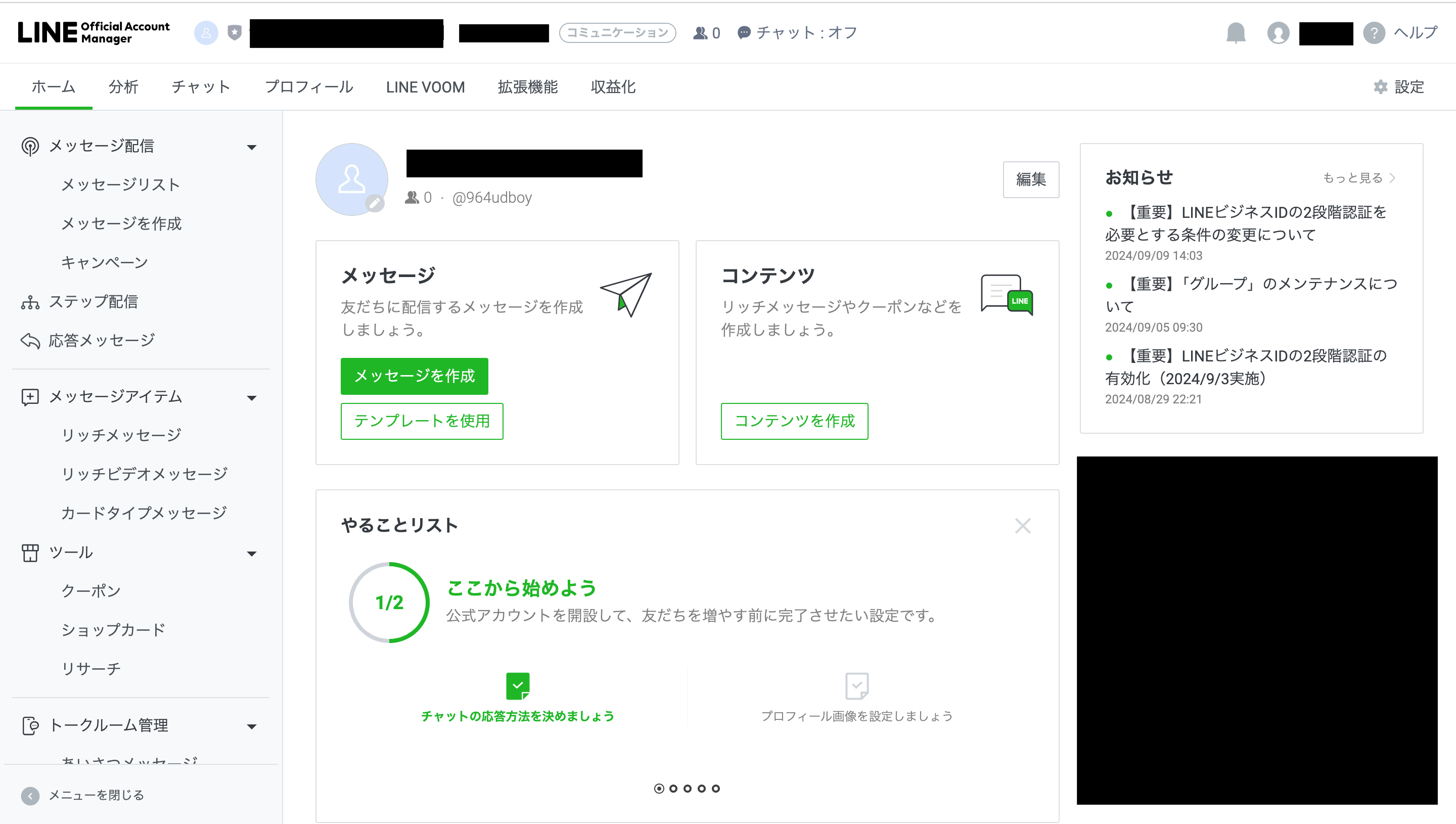 完成したLINE公式アカウントへは管理画面からログイン・アクセスができます。