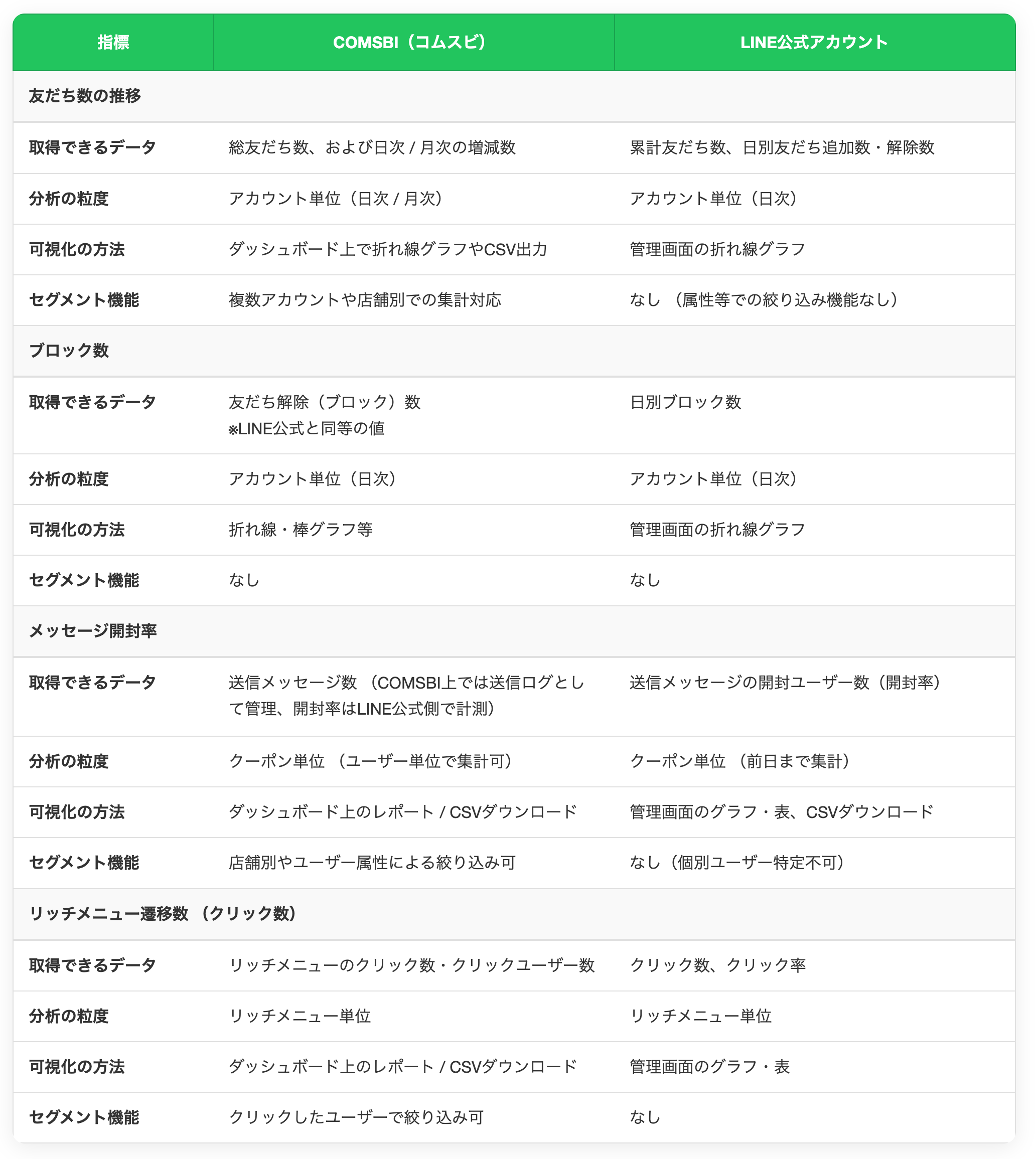 COMSBIとLINE公式のそれぞれで分析できる内容については、下記の比較表にまとめております。