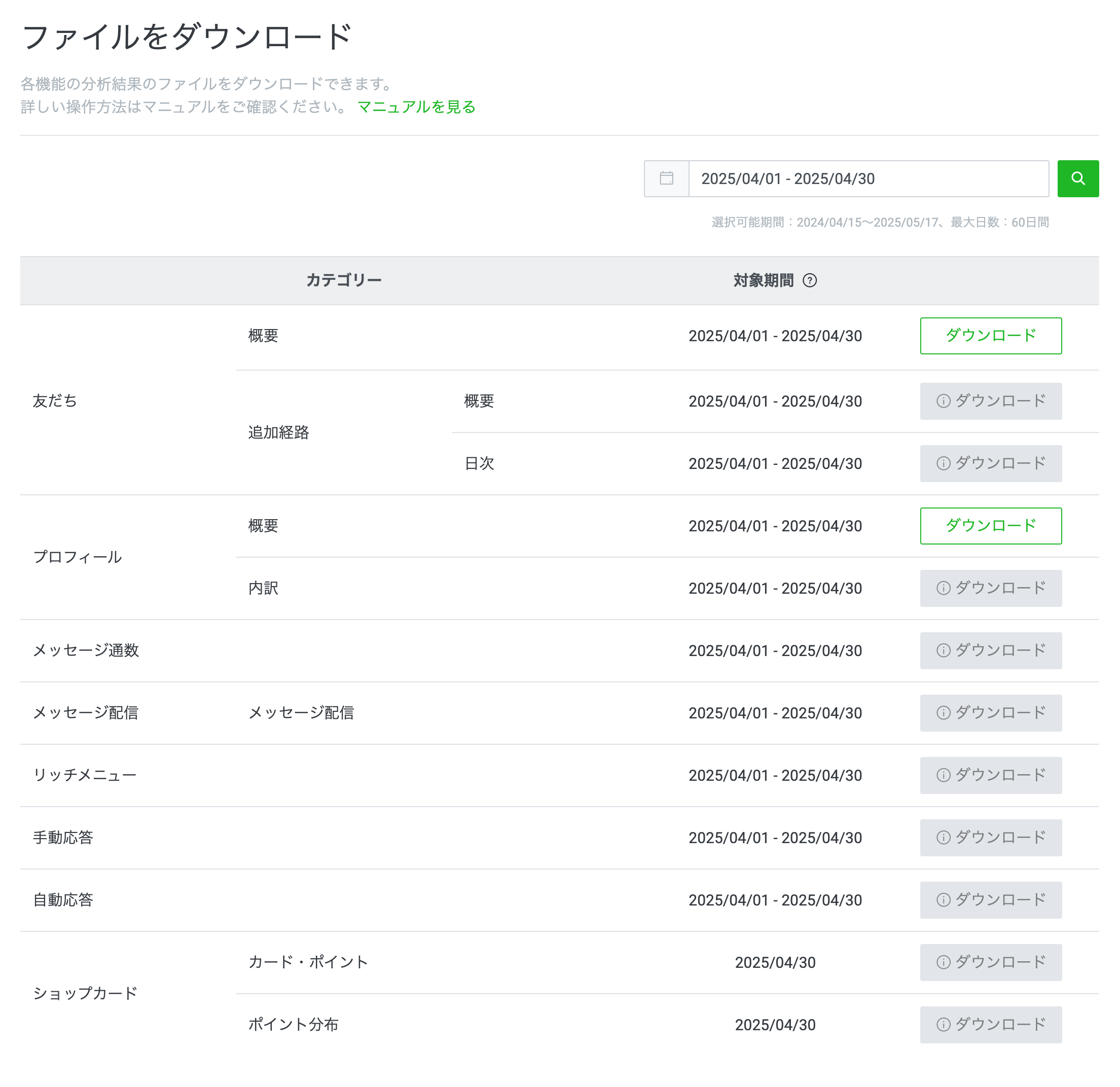 LINE公式の分析画面では、サイドバーの「ファイルをダウンロード」より、以下の画面にアクセス可能です。こちらでは、各項目の分析結果がCSVファイルとしてダウンロードできます。