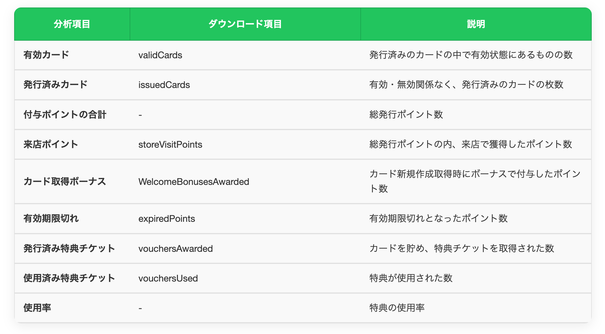 LINE公式分析画面のツール欄からは、「ショップカード」も選択可能です。こちらでは公開停止分を除くショップカードについて、カード本体やポイント、特典の発行数などが確認できます。(詳細は下表参照)